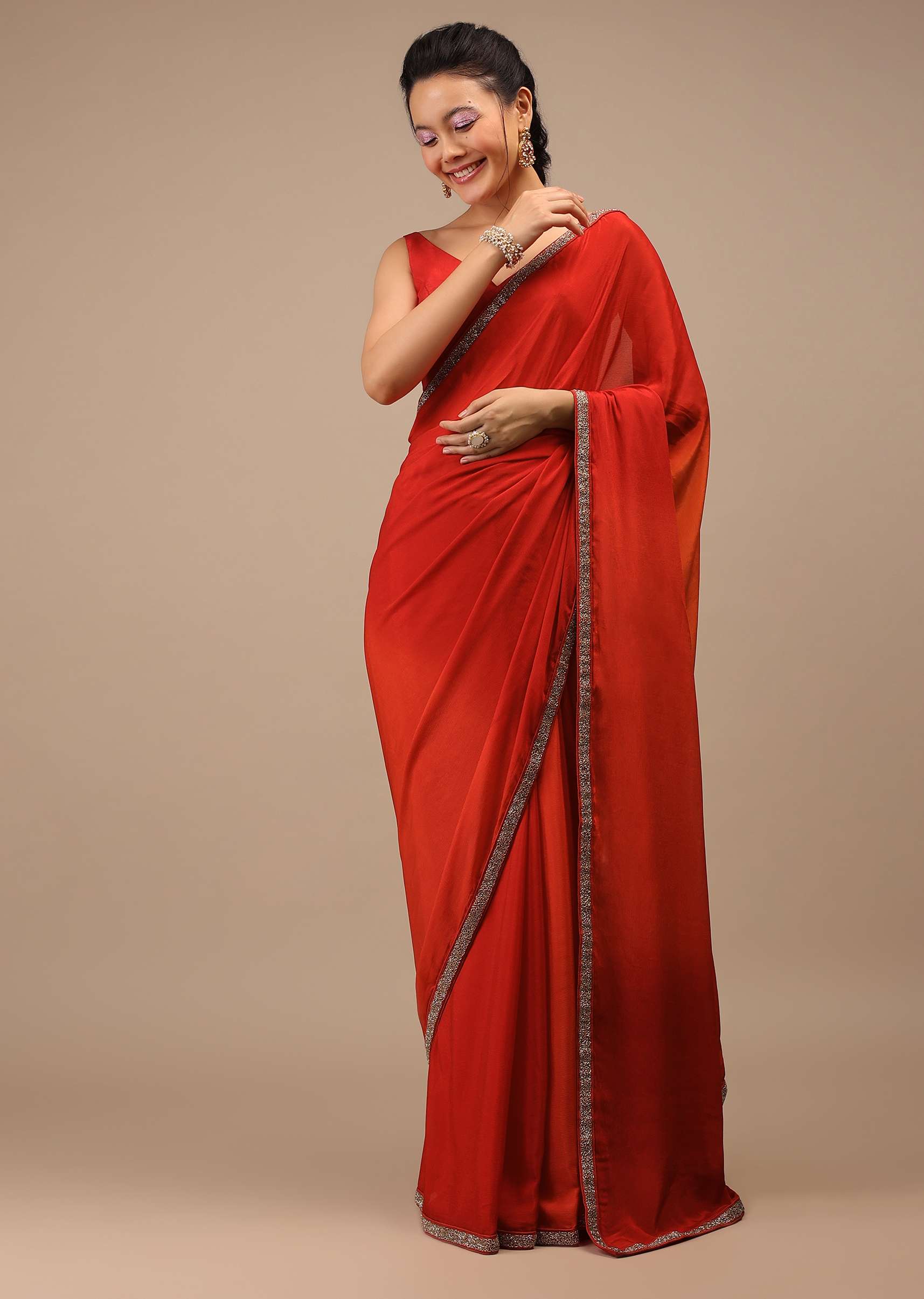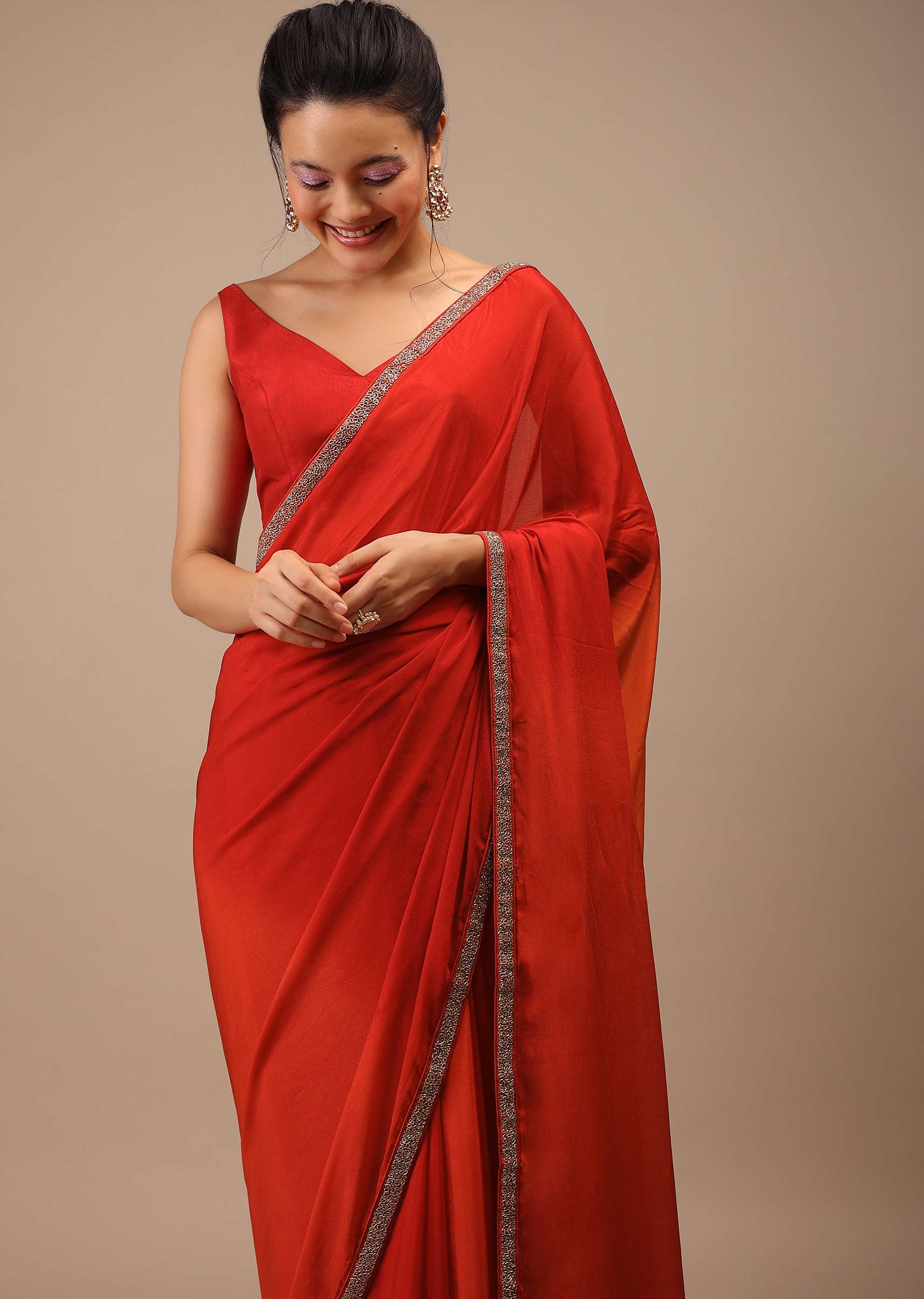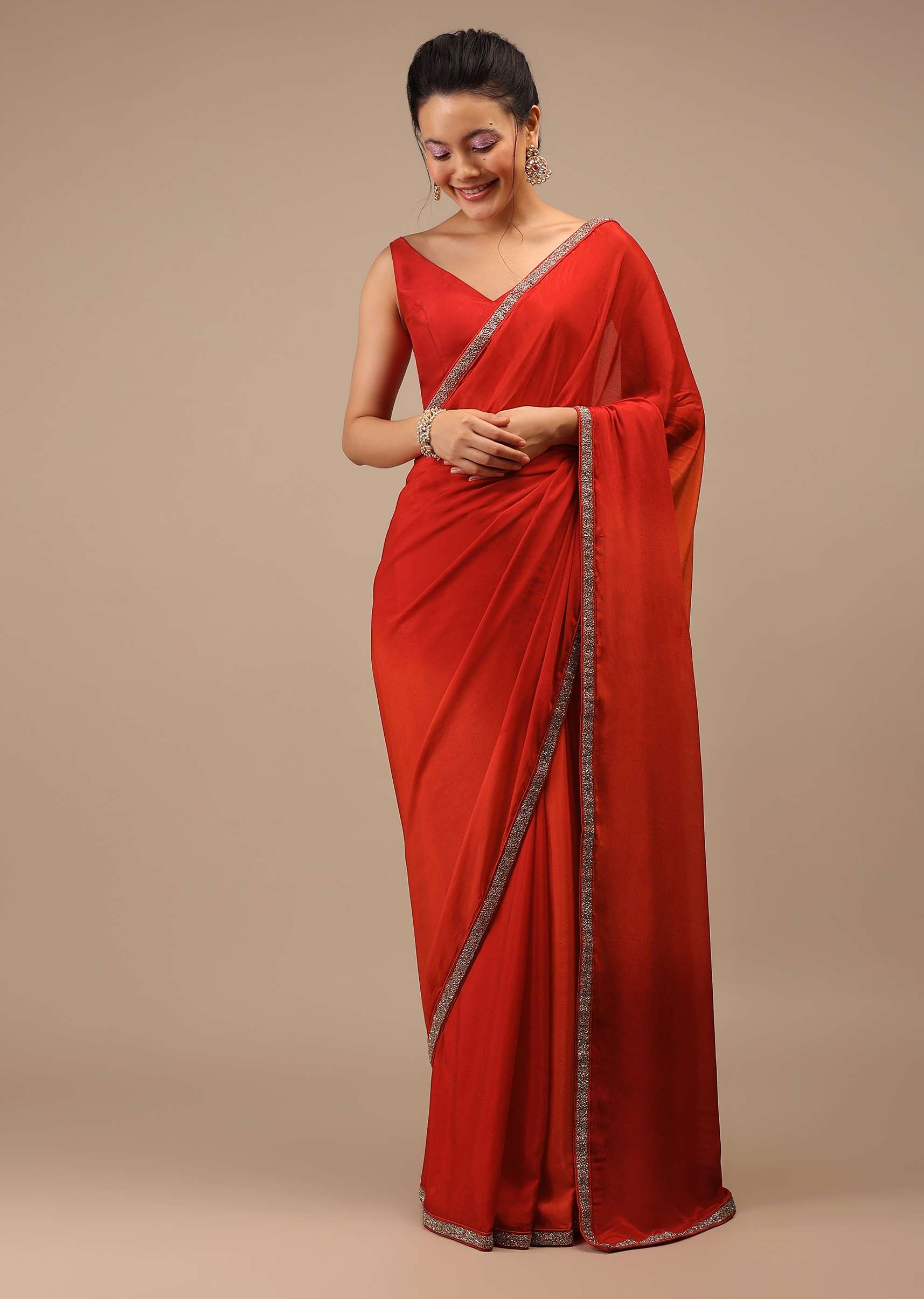 Red and orange ombre chiffon saree with cut dana embroidery on the border. It comes with an unstitched blouse crafted in georgette. It comes in cut dana embroidery buttis all over. Awarded as the Most Trusted Brand, we're delivering styles you love, just as promised.