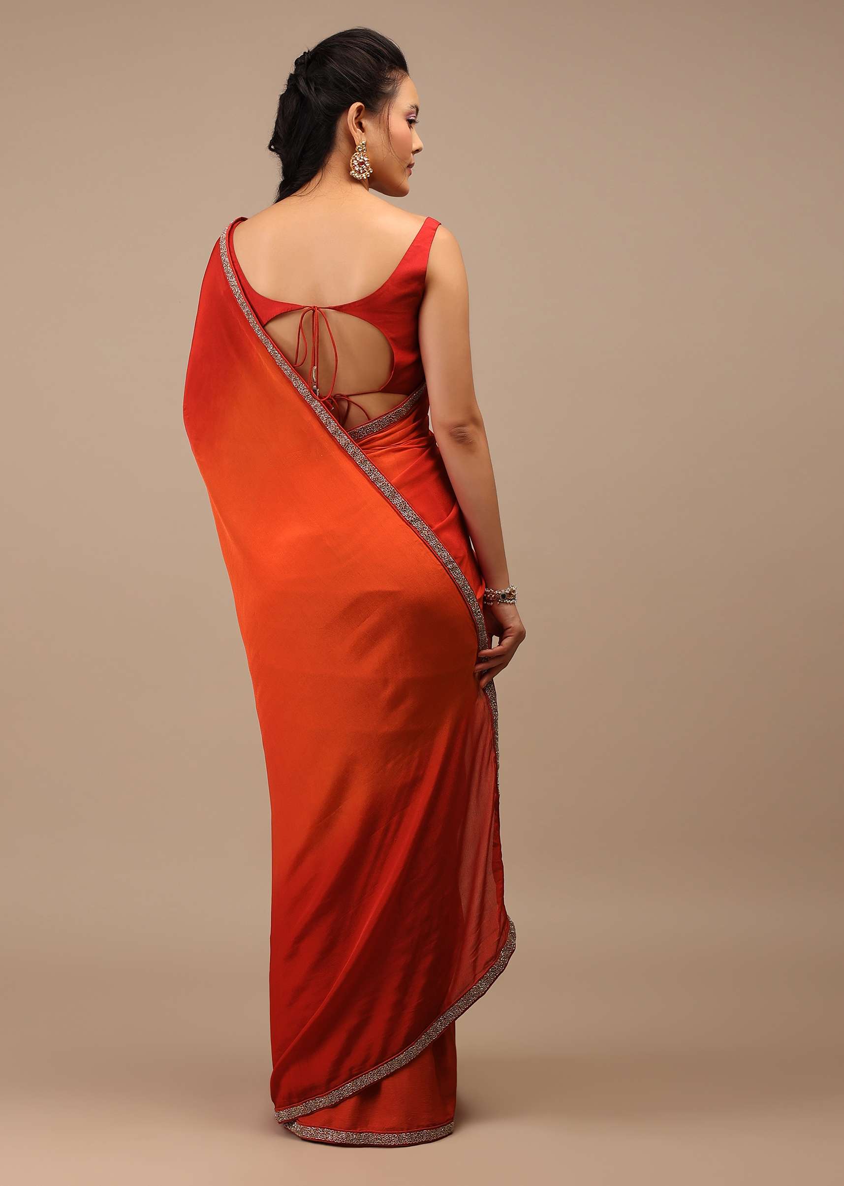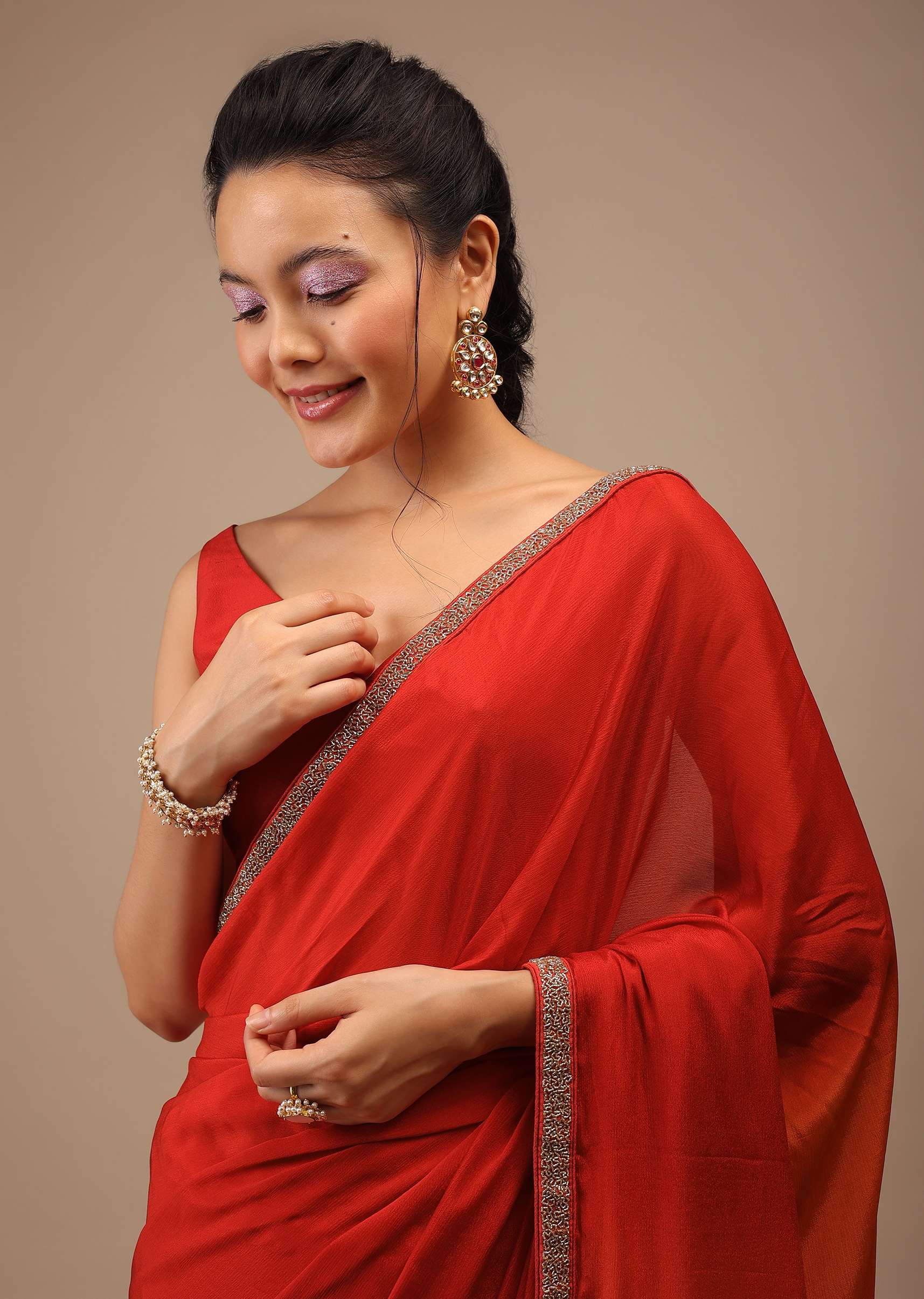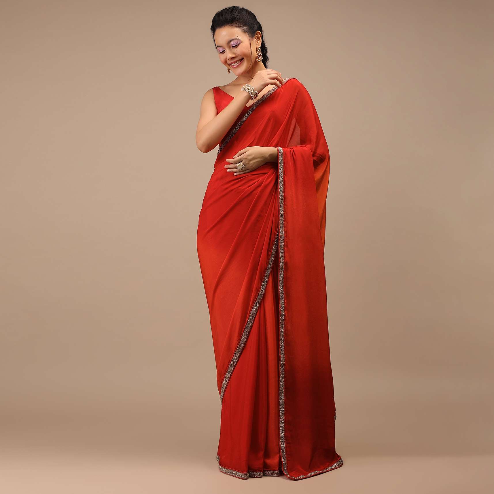 Red and orange ombre chiffon saree with cut dana embroidery on the border. It comes with an unstitched blouse crafted in georgette. It comes in cut dana embroidery buttis all over. Awarded as the Most Trusted Brand, we're delivering styles you love, just as promised.