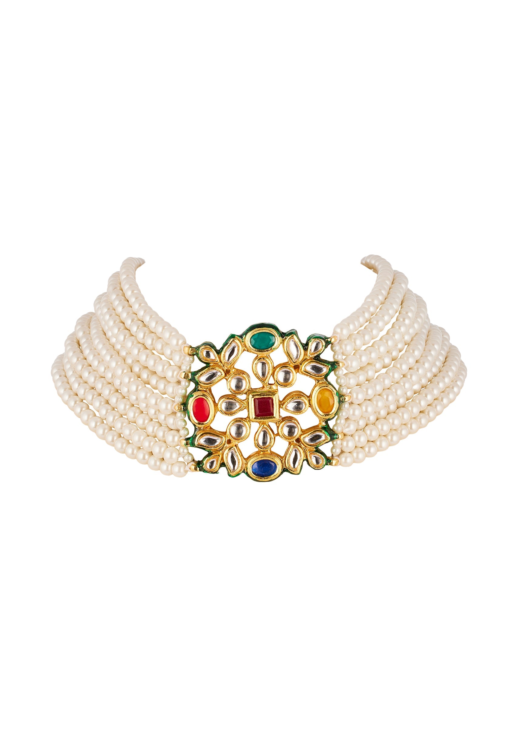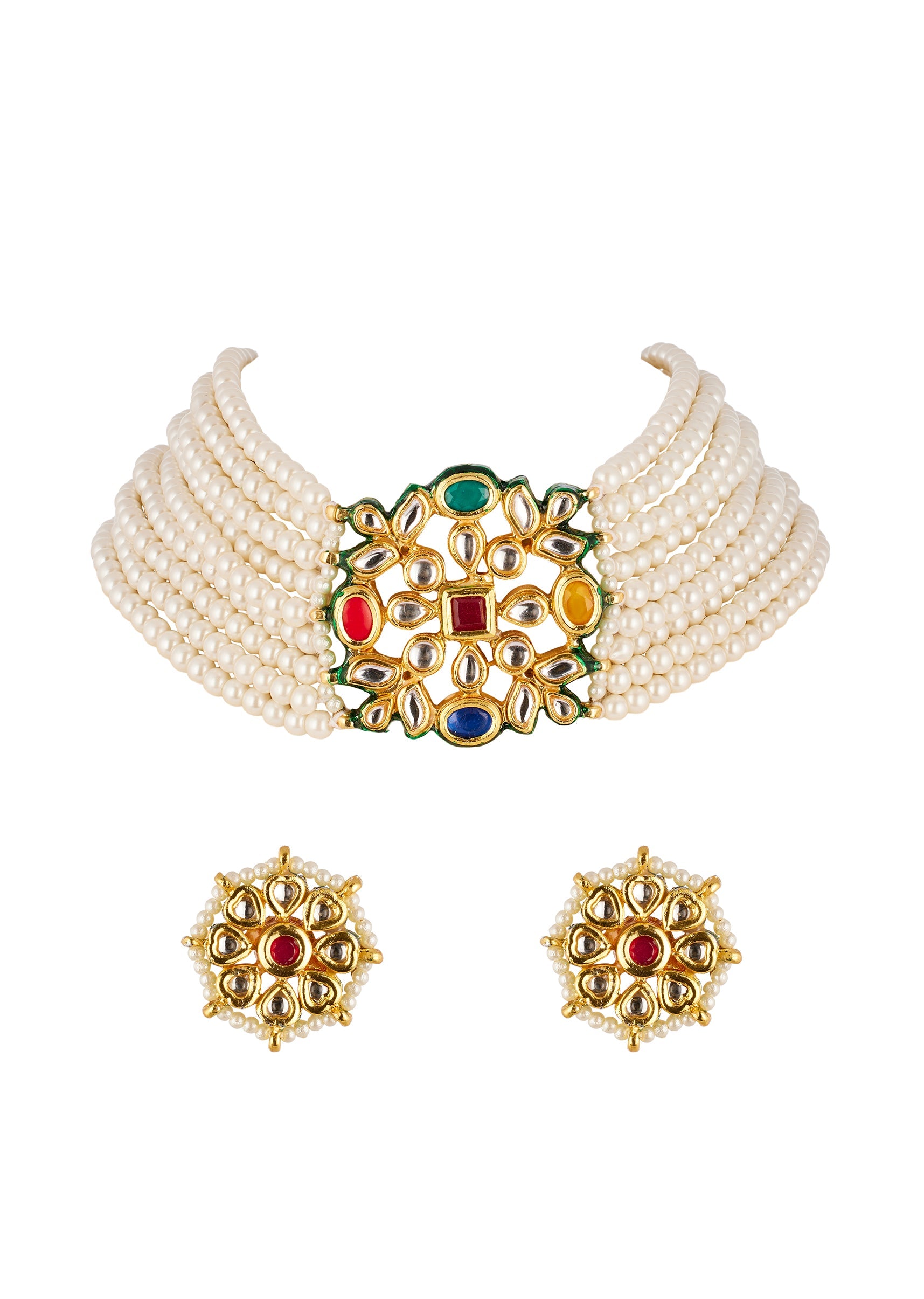 Inspired by timeless heritage, this gold tone kundan polki style necklace set features simulated coloured stones that add rich vibrance and regal charm. The classic necklace paired with matching studs... More Product Details
