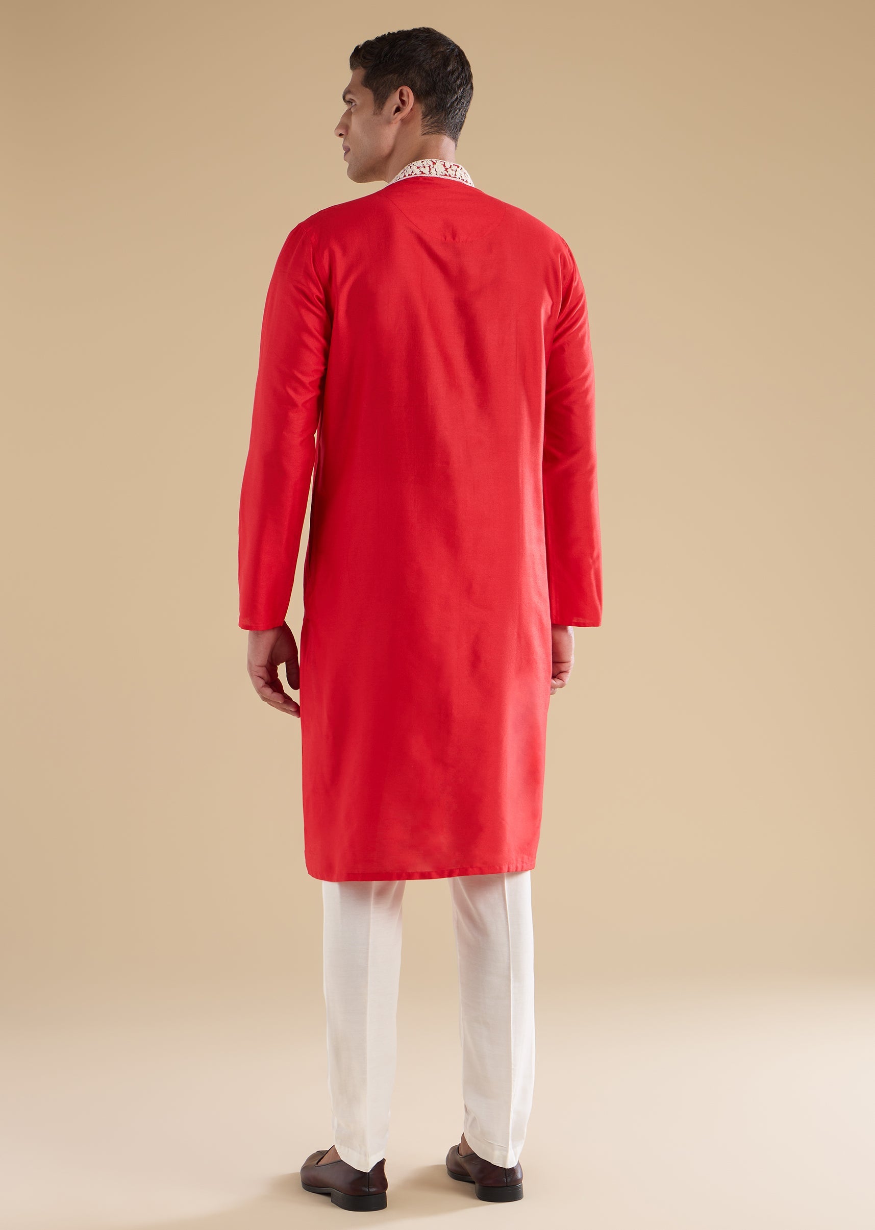 Richly traditional with intricate craftsmanship, this red kurta set is crafted in luxurious Banarasi silk for a festive, ceremonial appeal. The kurta features a mandarin collar, full sleeves, and side slits, highlighted with Kashmiri hand embroidery detailed with fine resham thread work for a refined finish. Paired with straight-fit trousers and a partially elasticated waist, this ensemble is ideal for poojas, festive gatherings, and wedding celebrations. Awarded as the Most Trusted Brand, we're delivering styles you love, just as promised.