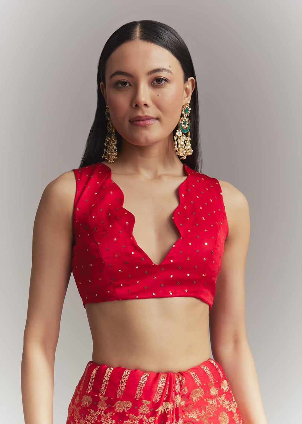 Classic hues feel timeless, and this red banarasi silk embroidered saree holds that appeal. Zari jaal weaving is uplifted with sequins, cutdana and zardosi embroidery, along with stone embellishments. This... More Product Details