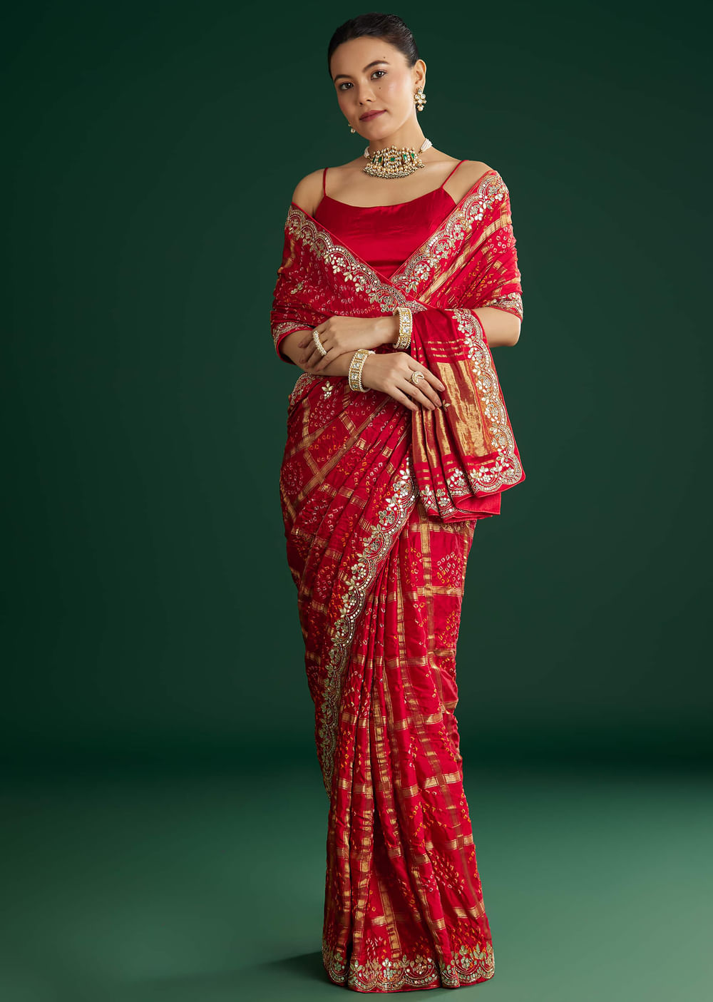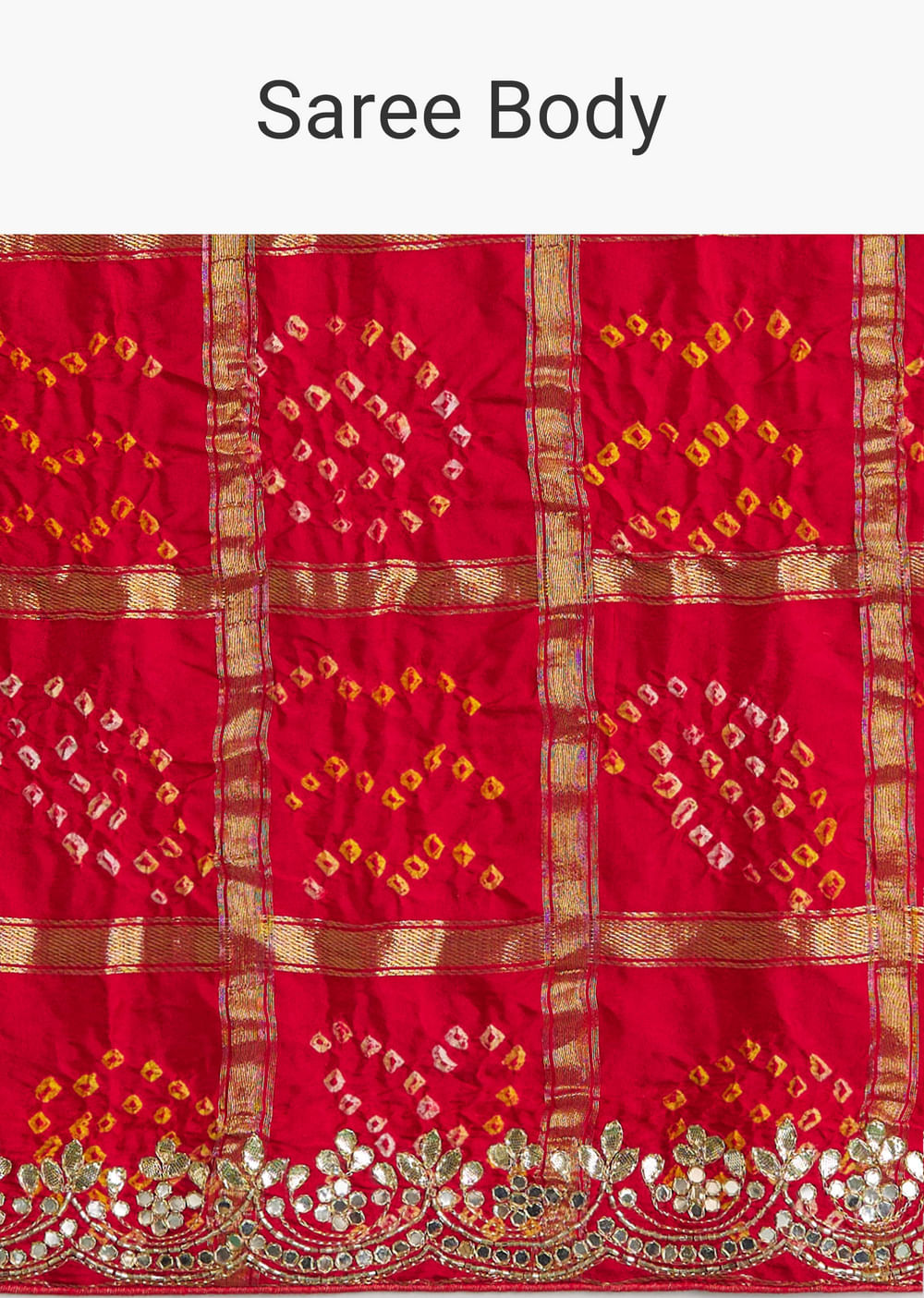 This Red Bandhani Saree features classic tie-dye patterns adorned with shimmering gota work, offering a rich and festive appeal. Ideal for weddings, poojas, or celebratory events, it beautifully combines tradition... More Product Details