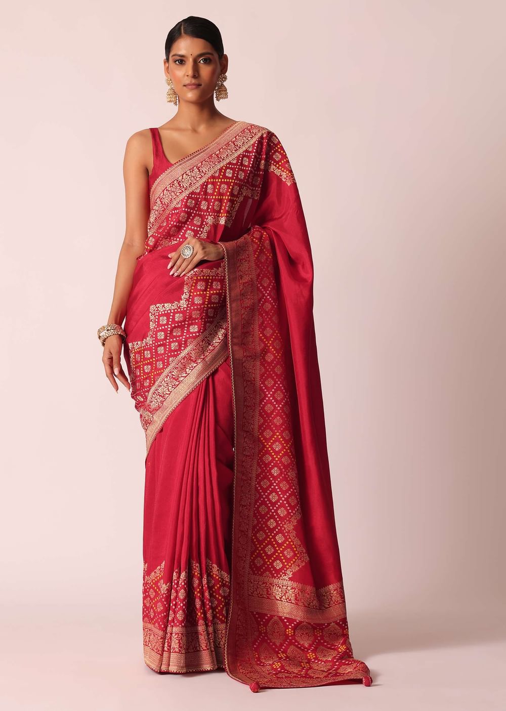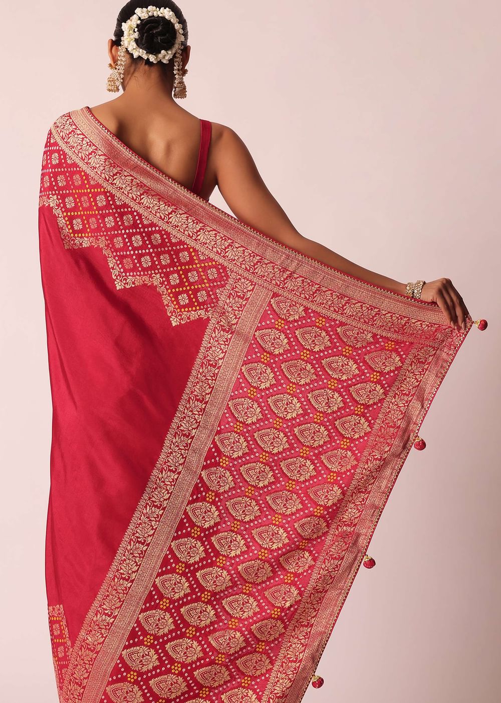 Red Bandhani Weave Saree In Silk With Unstitched Blouse Piece