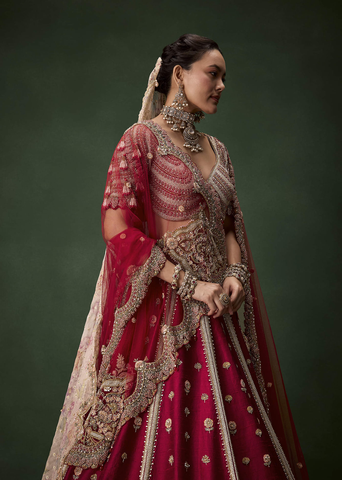 A blend of heritage luxury and contemporary finesse, this red raw silk lehenga set radiates refined bridal beauty. Intricate zardozi and patchwork detailing adorn the silk with dimensional brilliance, adding... More Product Details