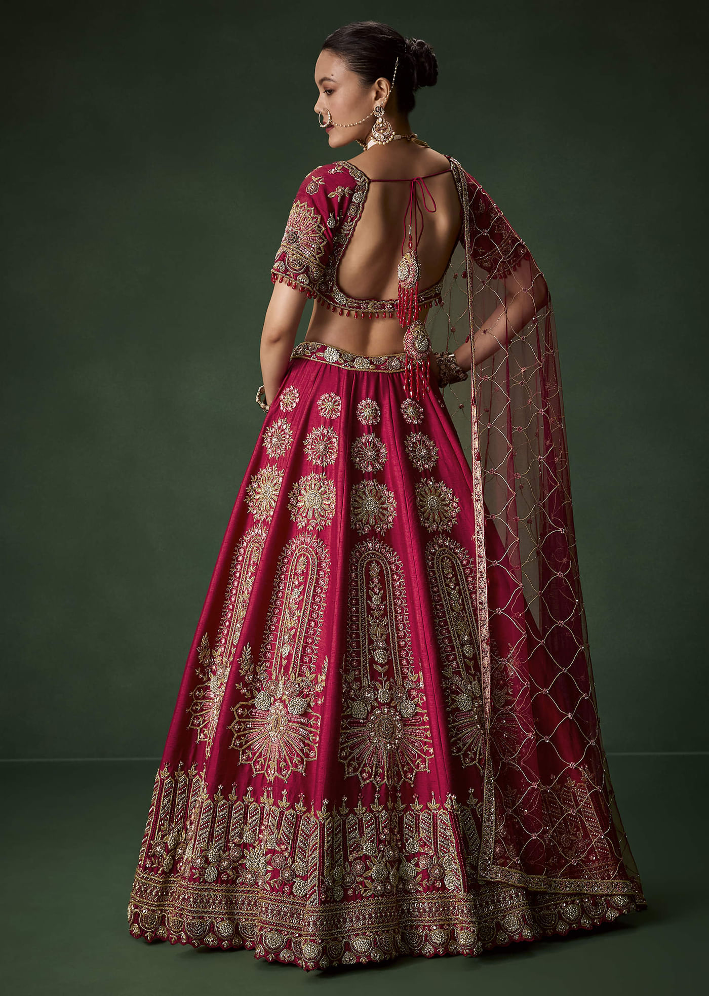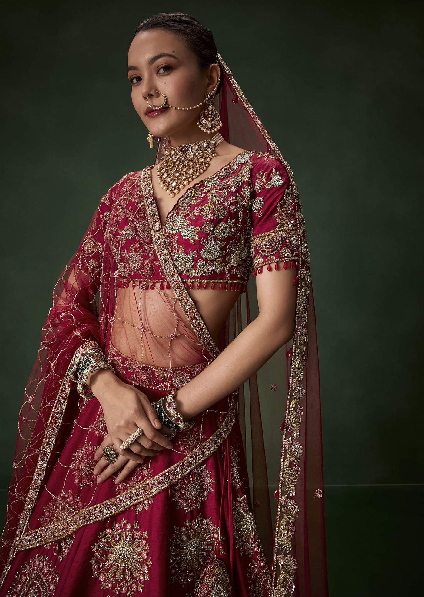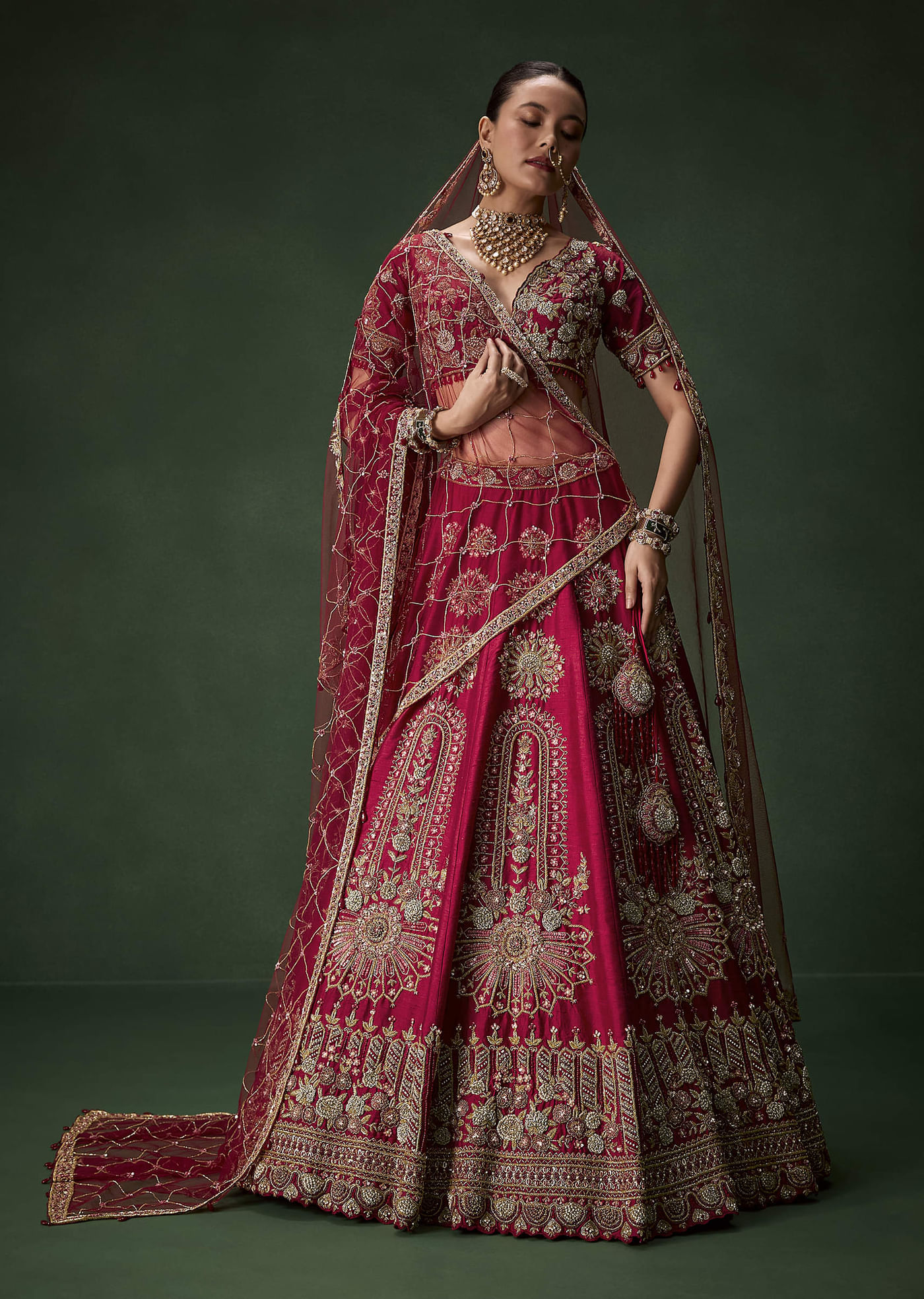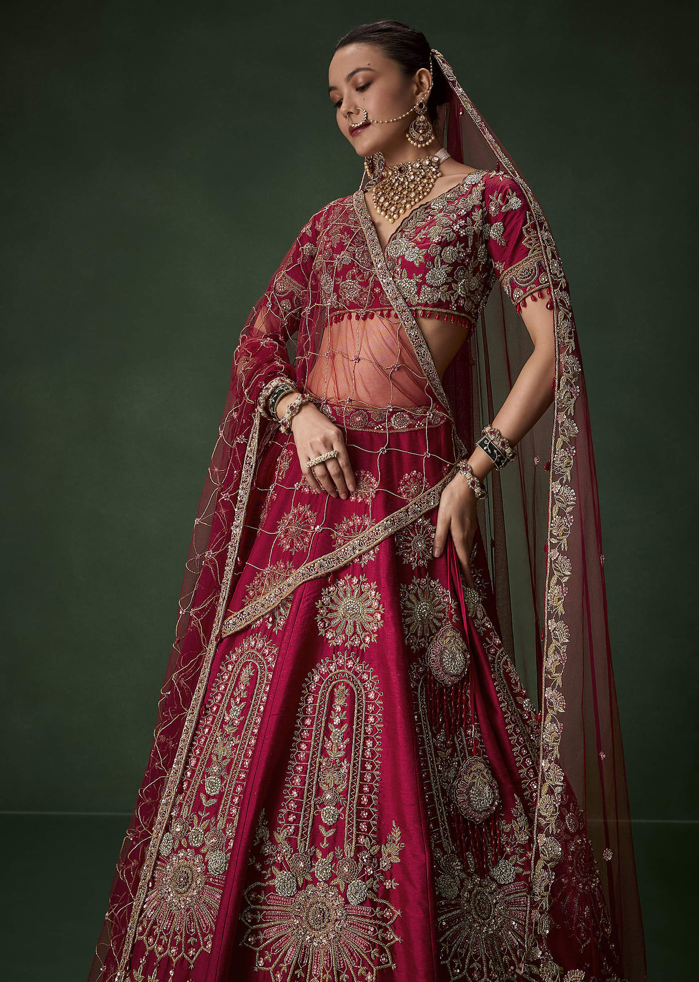 A masterpiece of bridal grandeur, this red silk lehenga set embodies timeless elegance with modern craftsmanship. Intricately adorned with shimmering sequin and cutdana work, the richly textured ensemble catches the... More Product Details