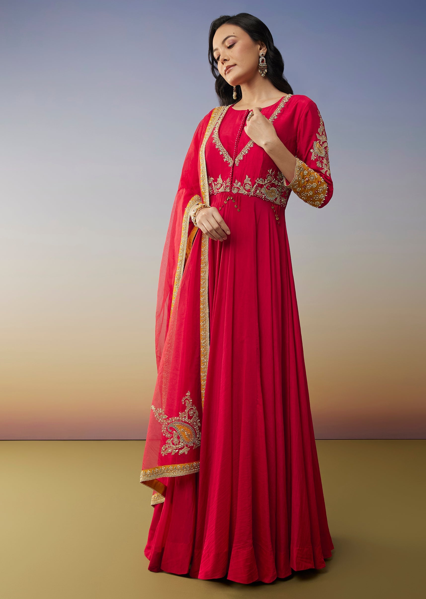 Red Chanderi Anarkali Suit with Zari Moti Work