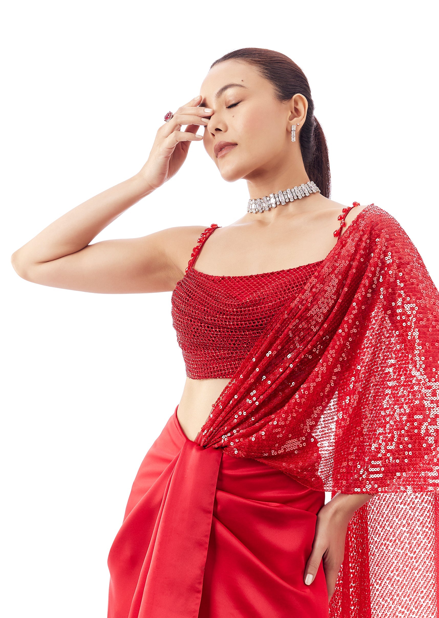A festive red cowl neckline blouse in milano fancy fabric with stone detailing. Sleeveless noodle-strap styling with back hook-eye closure and a side tassel accent. Stitched blouse (1 pc). Perfect... More Product Details