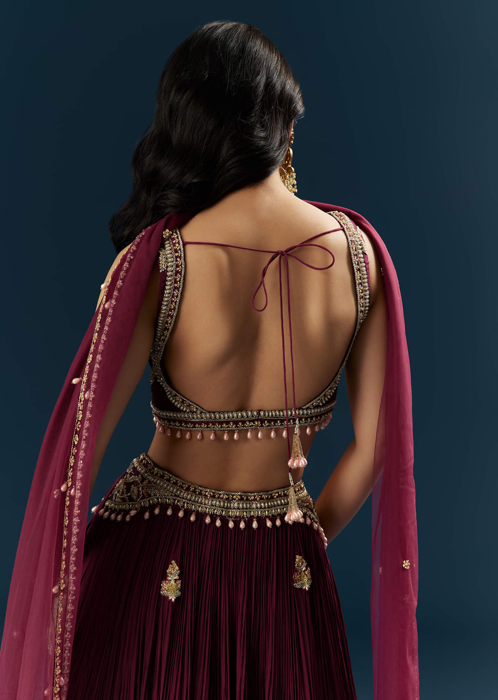 Sequins, stones, and moti work meet a frilled hem on this red crepe lehenga. A rushing skirt, a neat blouse, and the matching dupatta allow a playful edge to movement.... More Product Details