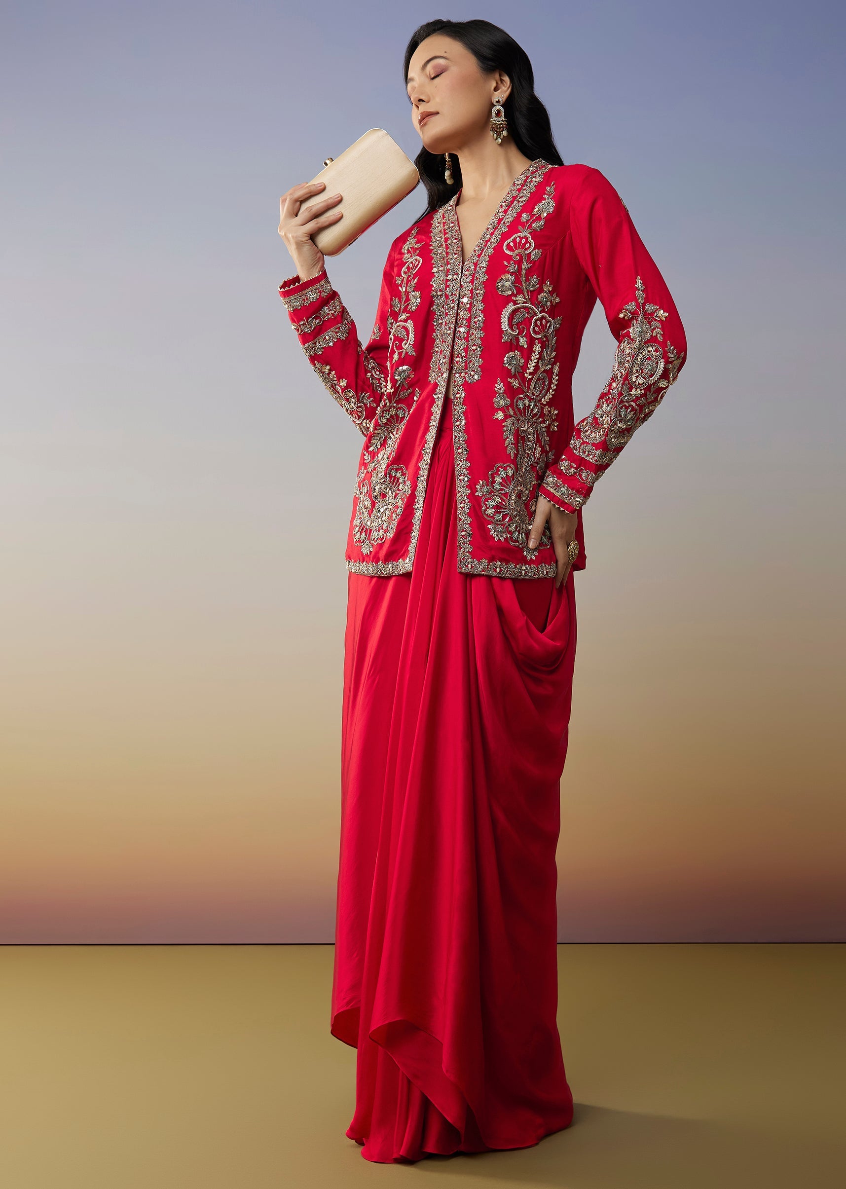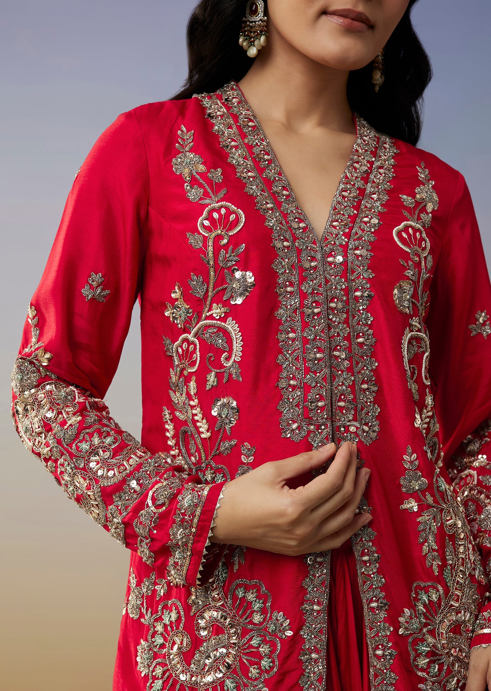 This red jumpsuit brings a bold contemporary charm perfect for sangeet and cocktail celebrations. Crafted in a fluid crepe fabric it features delicate cut dana work that adds a festive... More Product Details