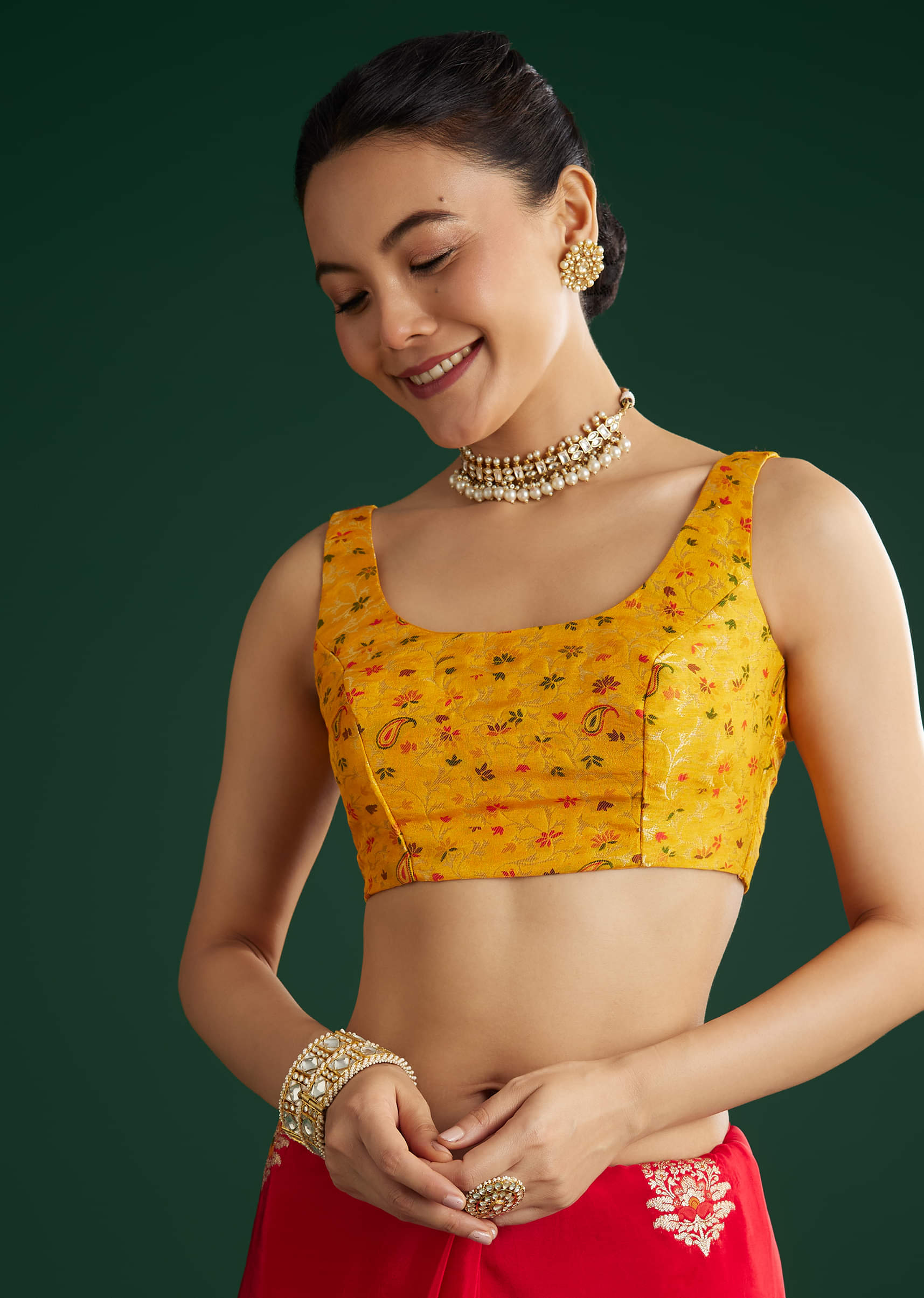 Complement this vibrant red and mustard saree with a sleek choker and gajra bun for a festive-meets-modern vibe.