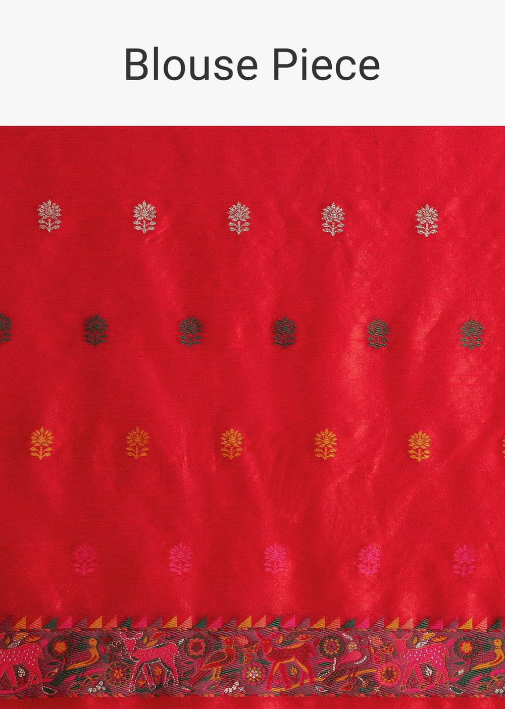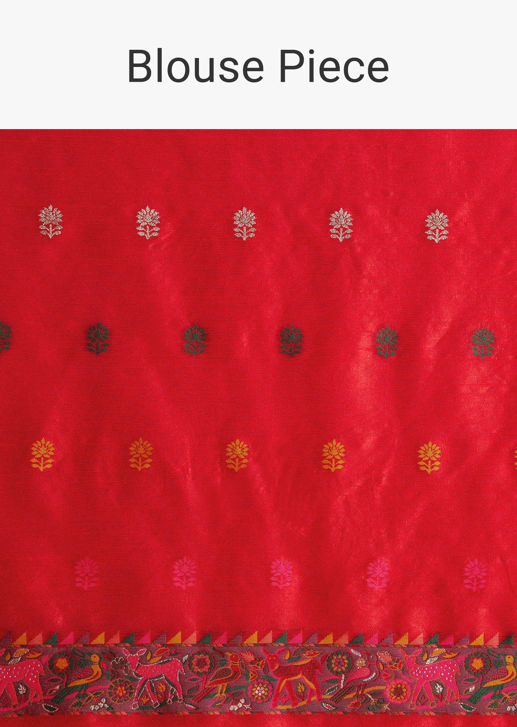 Step into a world of regal charm with this nylon Dola silk woven saree in red color, tranditional elements woven. A whisper of heritage and a dance of intricate craftsmanship come alive on its ethereal drape. Each thread tells a tale of elegance, weaving dreams into every fold. Awarded as the Most Trusted Brand, we're delivering styles you love, just as promised.