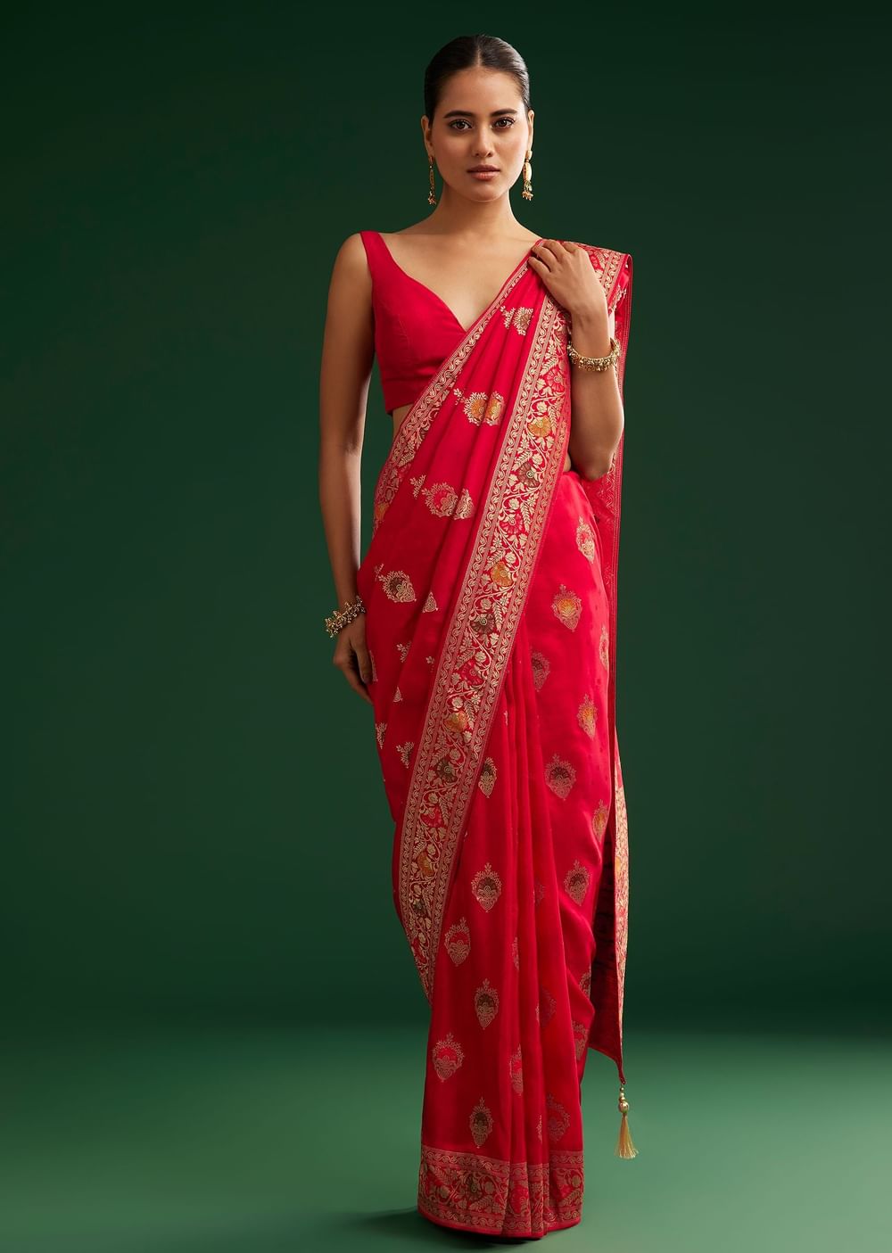Bold and vibrant, this red Dola silk saree is beautifully enhanced by intricate zari weaving. Its striking color and graceful style make it ideal for weddings, festivals, and grand celebrations. Awarded as the Most Trusted Brand, we're delivering styles you love, just as promised.
