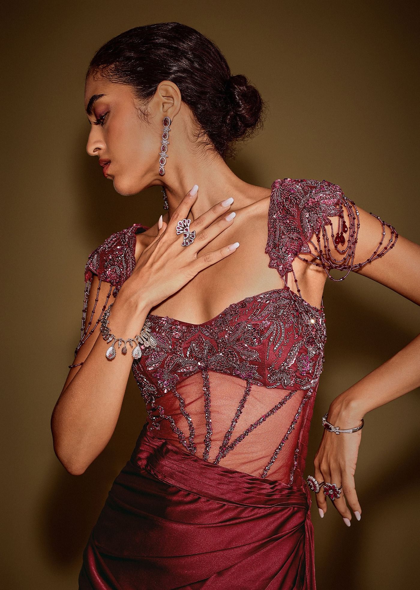 Fierce yet feminine, this red satin gown features a corset-style bodice with a sweetheart neckline and cap sleeves. Richly embroidered with cut dana, sequins, and embellishments, it’s paired with an... More Product Details