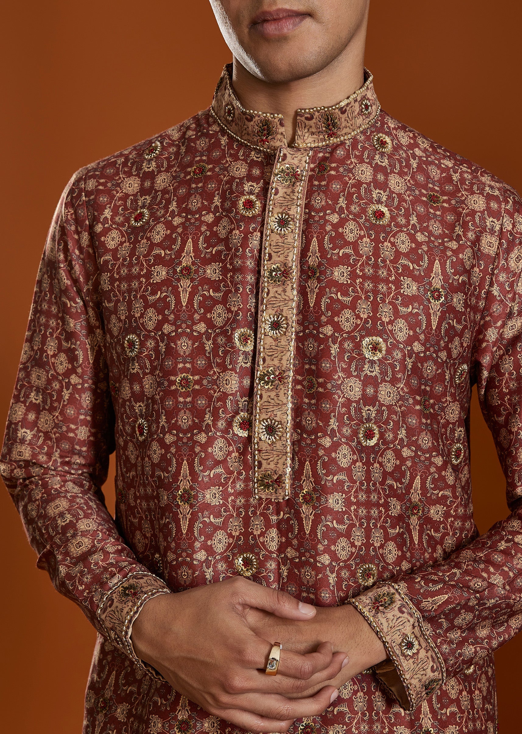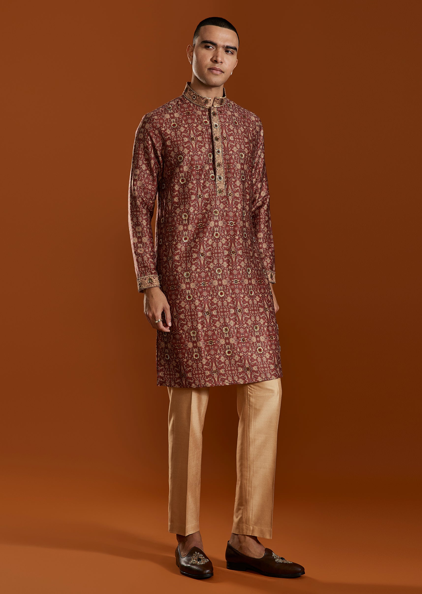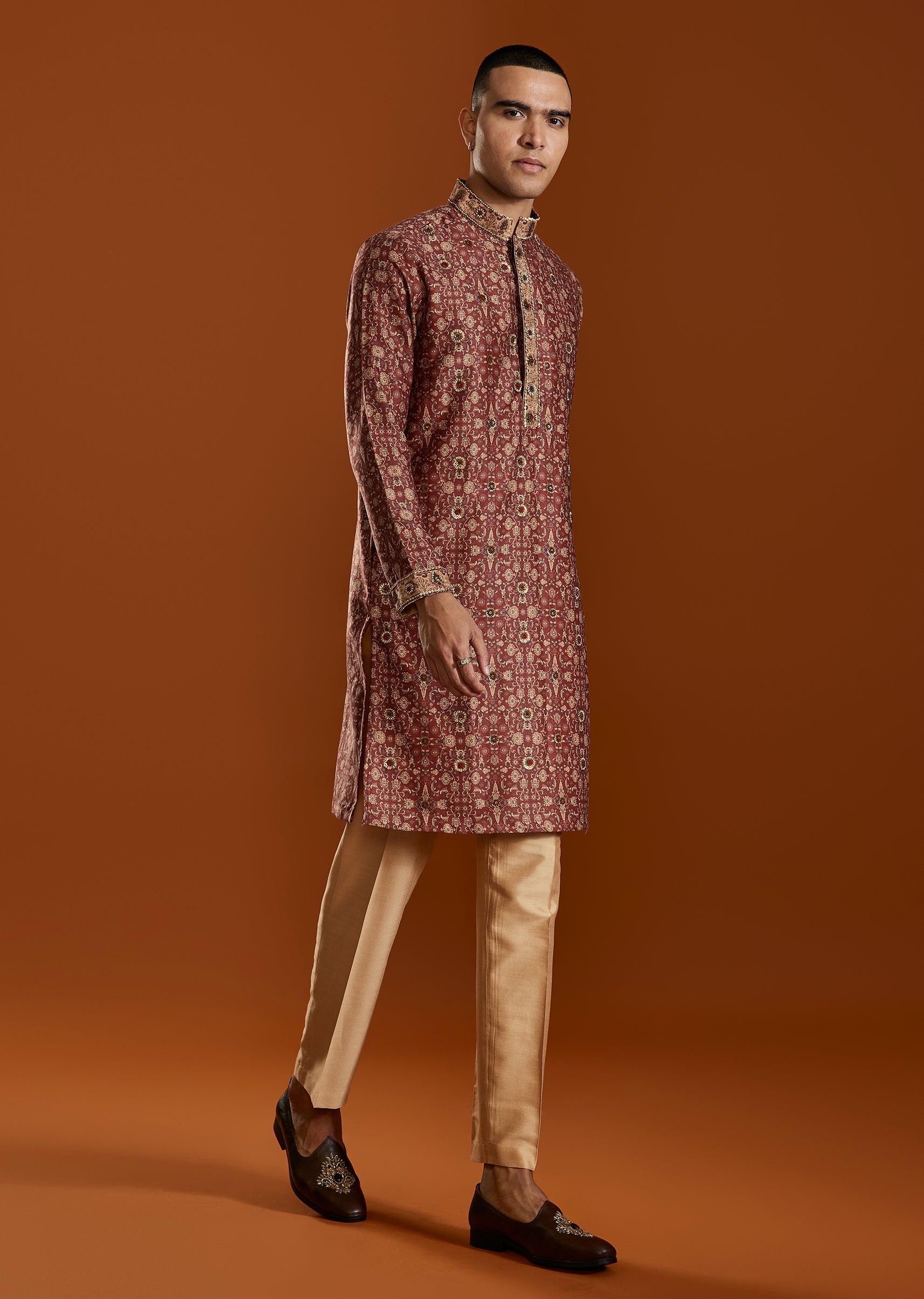 A striking red kurta set crafted in luxurious pashmina fabric and detailed with intricate thread and sequin embroidery. The elegant silhouette and festive detailing make it perfect for mehendi functions... More Product Details