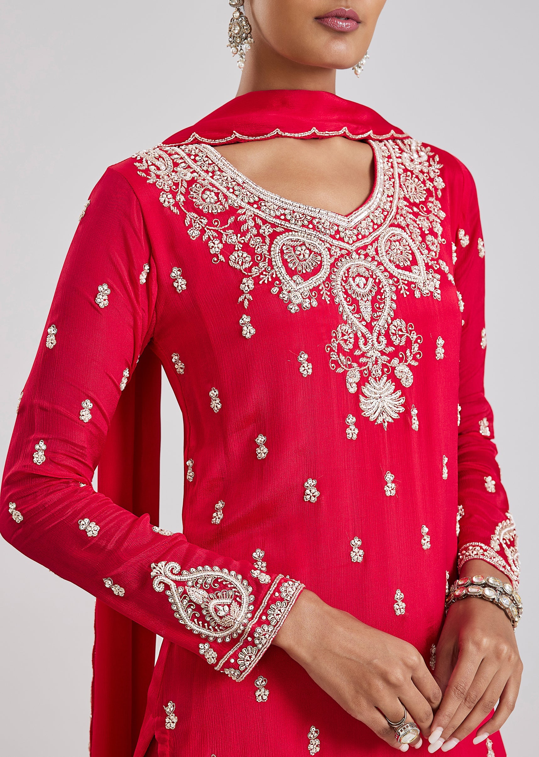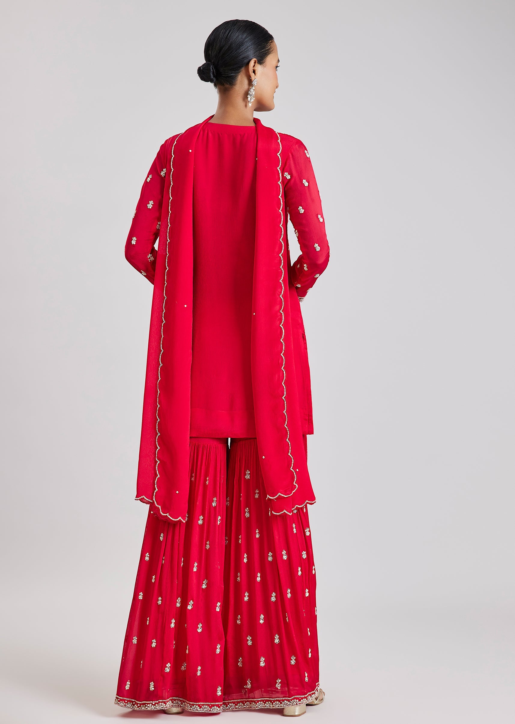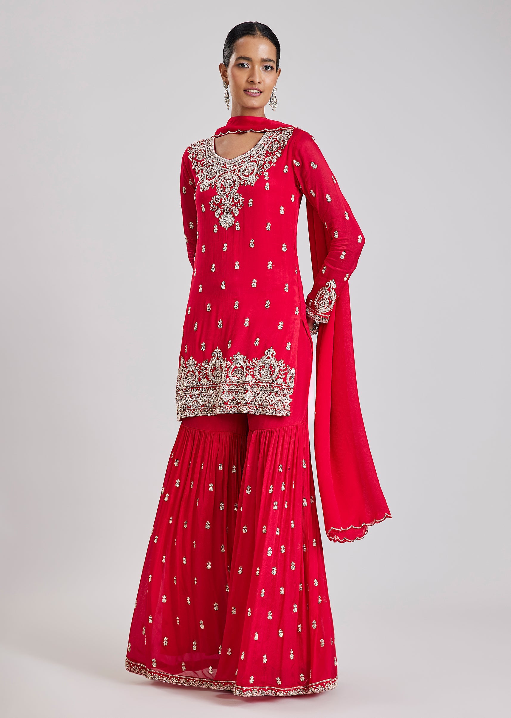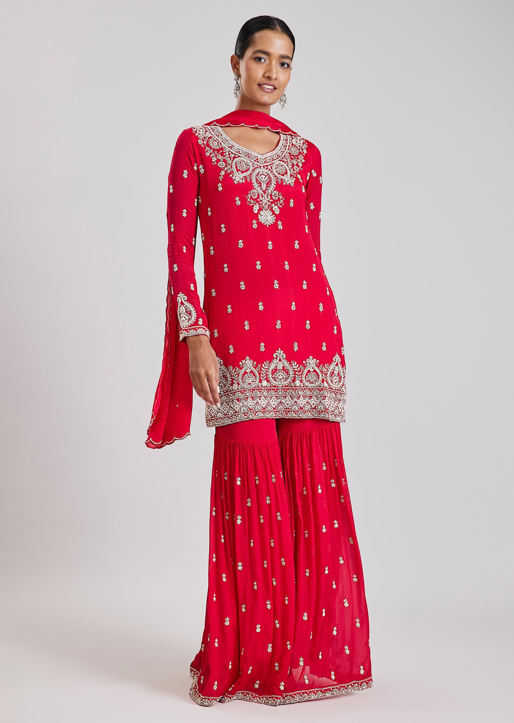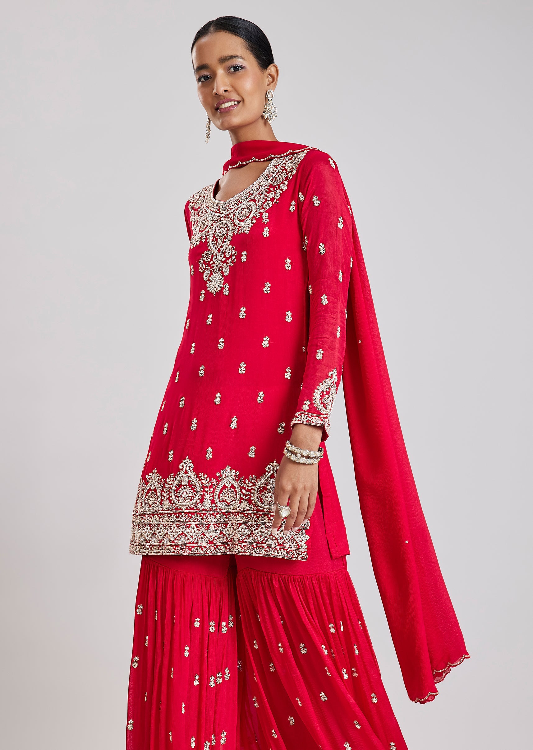 Bold and festive, this red sharara set showcases intricate cut dana and moti embroidery that enhances its celebratory appeal. The straight kurta is paired with a dramatic flared sharara and... More Product Details