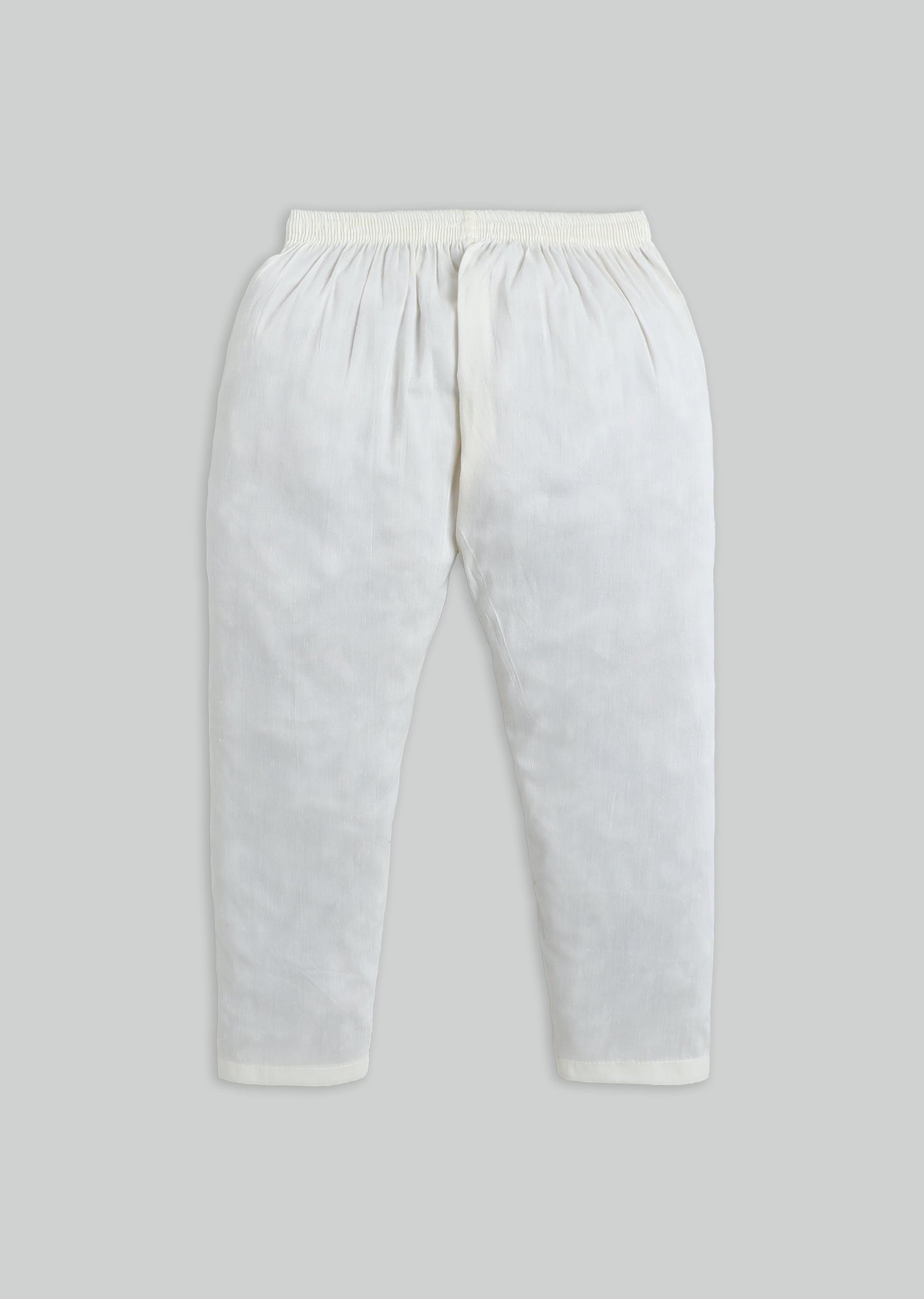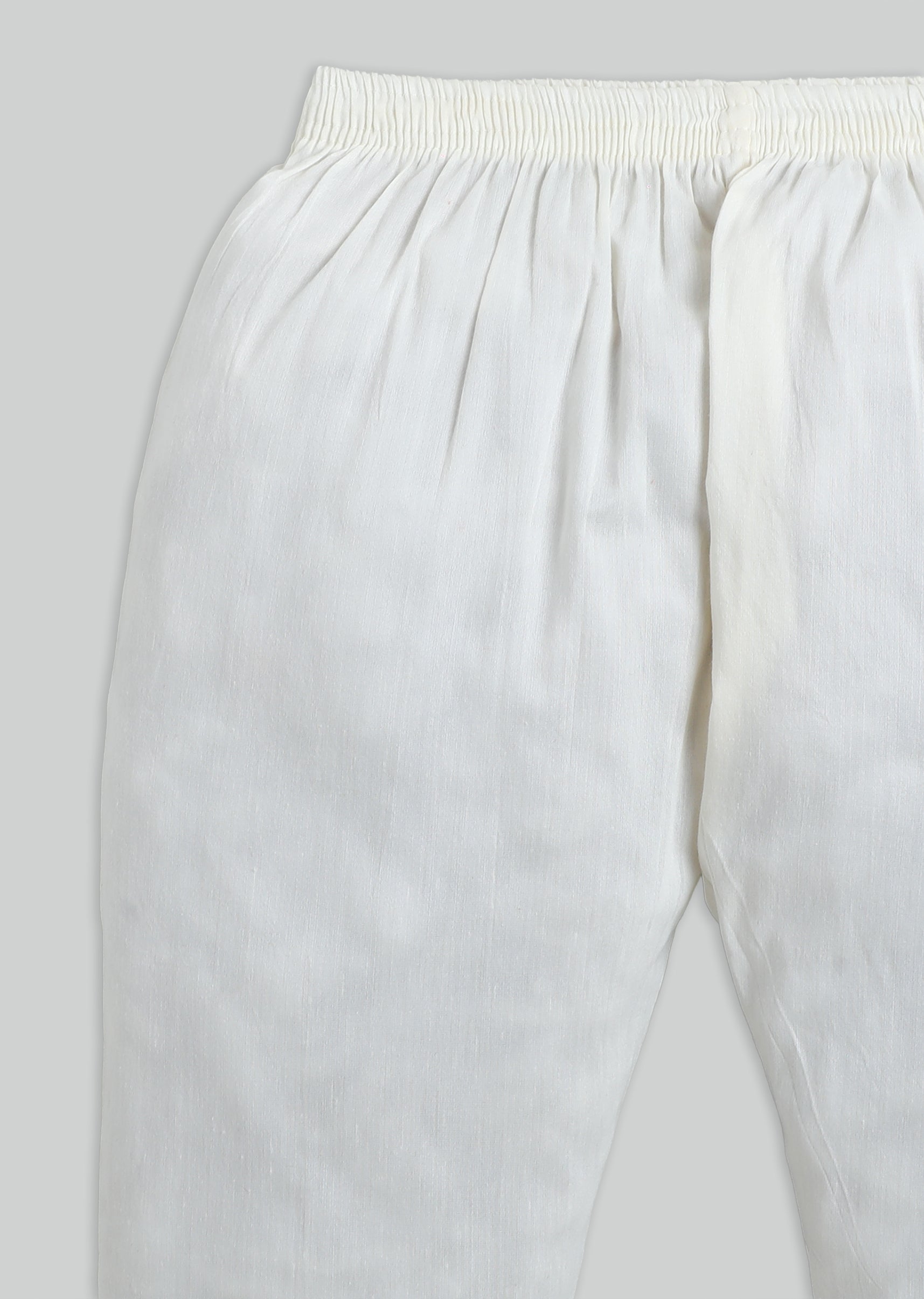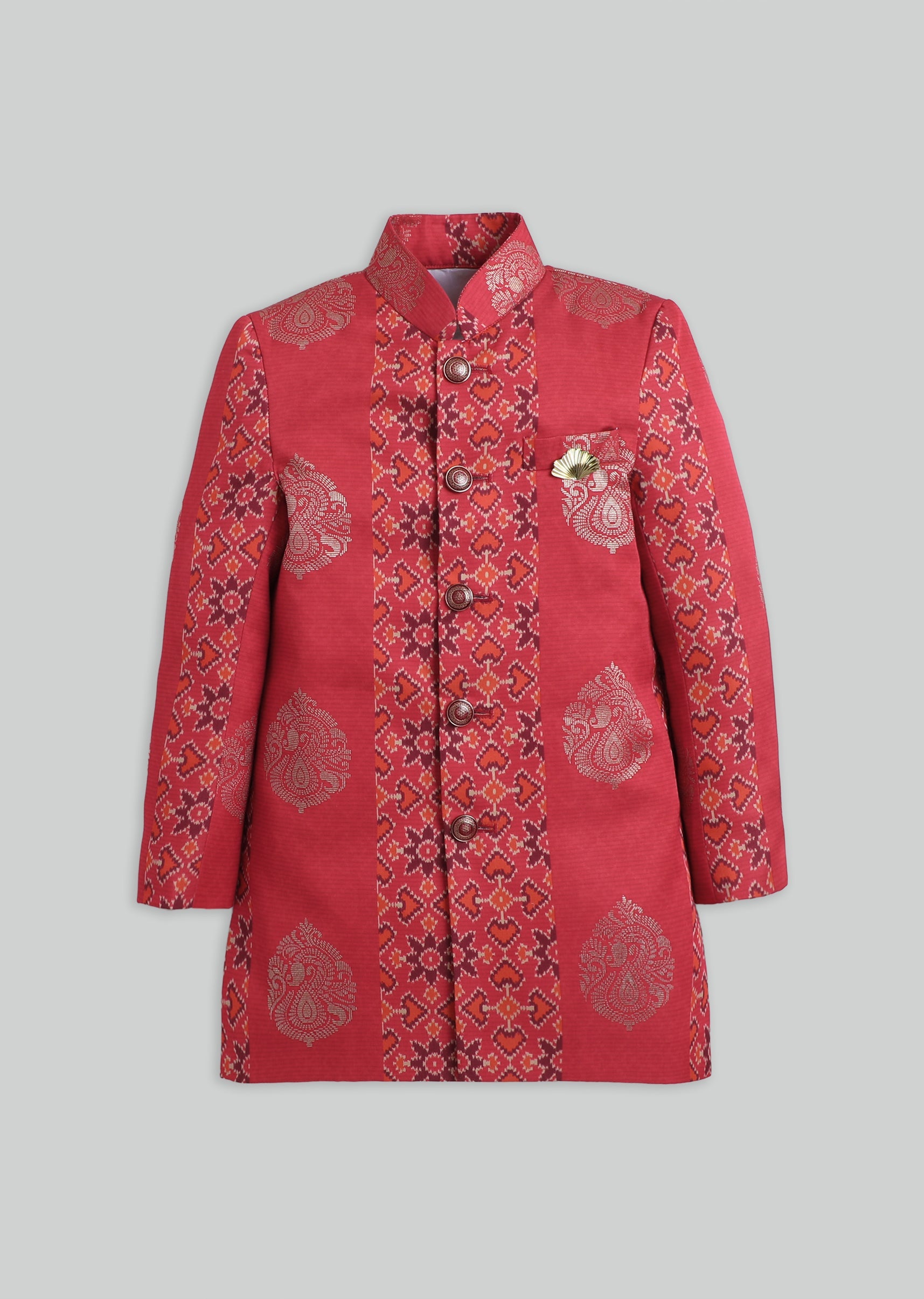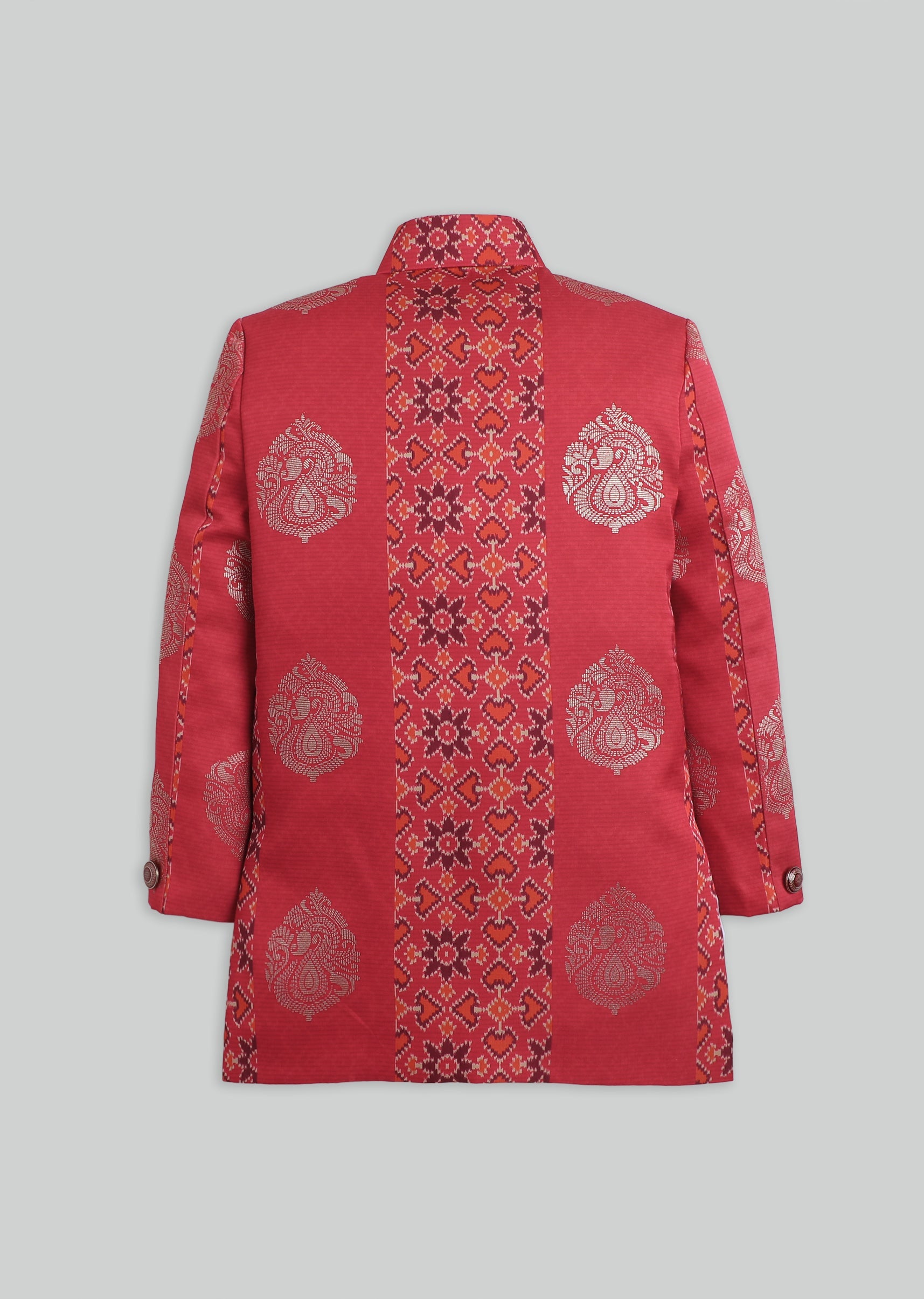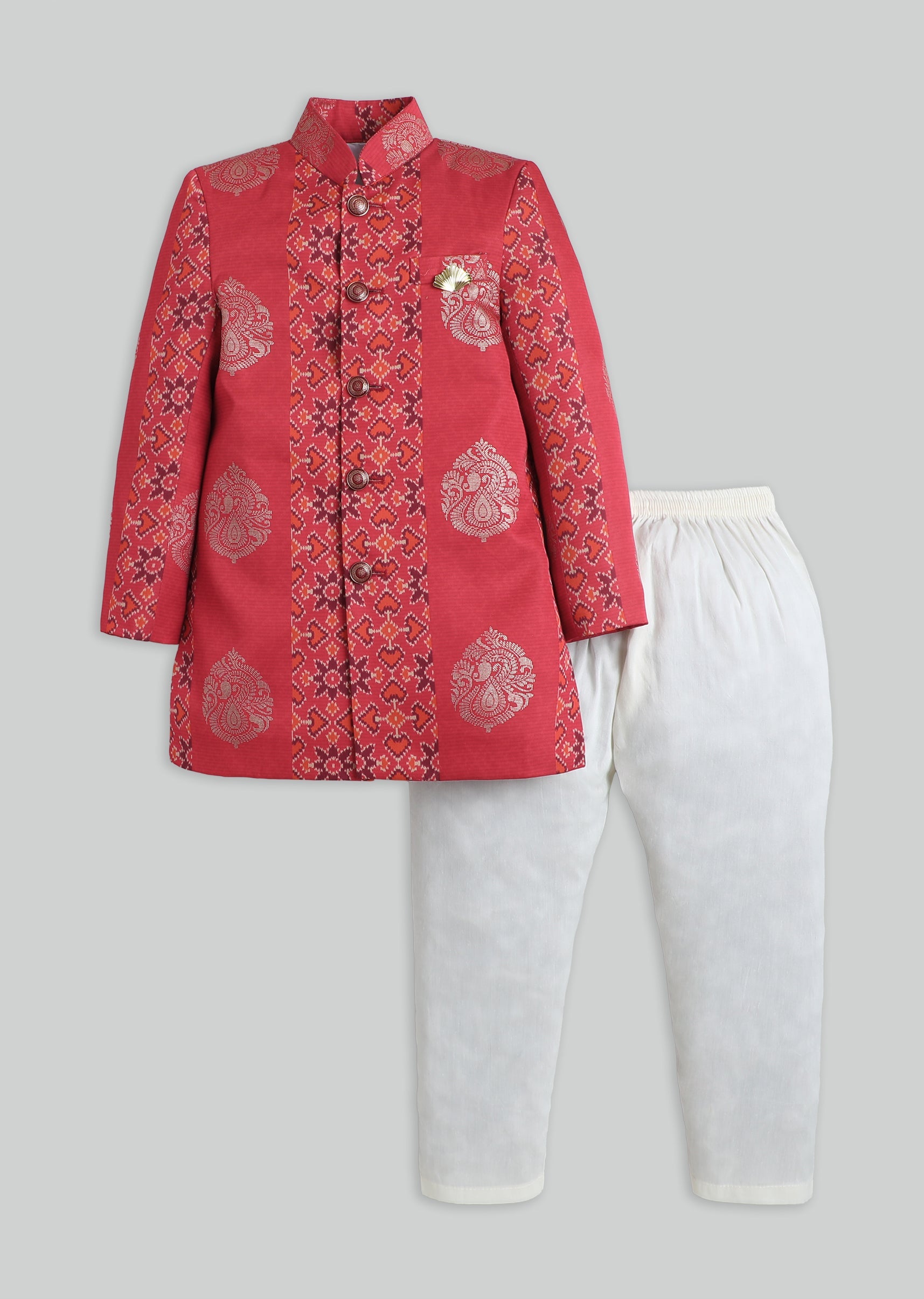 A festive red silk kurta set with foil detailing, featuring a mandarin collar, 3/4th sleeves, and front buttons. Paired with matching pants—perfect for weddings and celebrations.