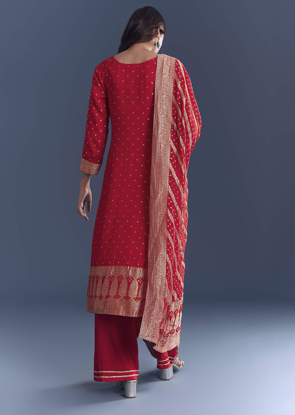 Red Georgette Kurta Set With Bandhani Print And Jacquard Weave
