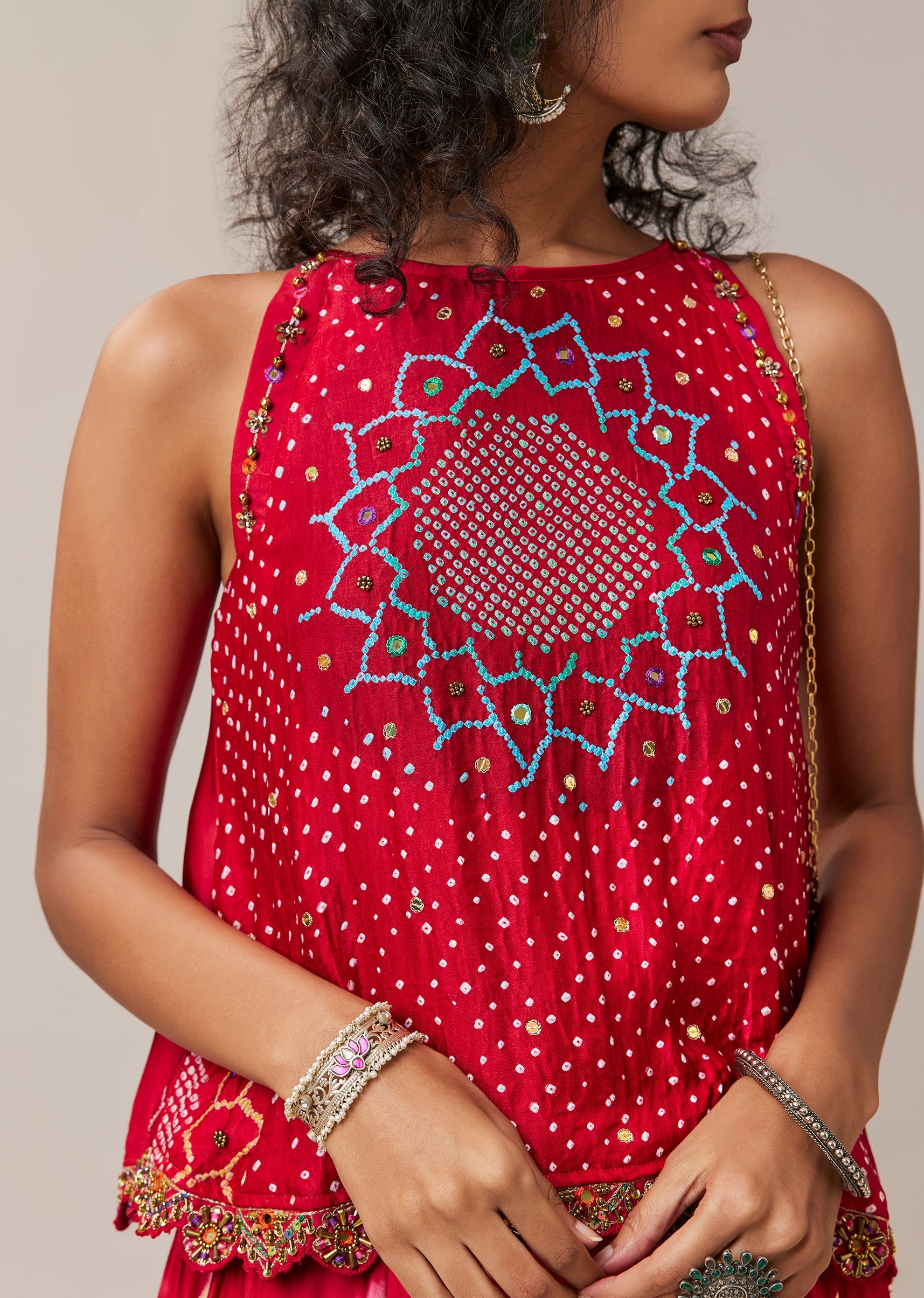 Rooted in artisanal charm, this hand dyed bandhani set brings together traditional craft and effortless comfort. Crafted in soft modal, the sleeveless top is highlighted with delicate mirror and sequin... More Product Details