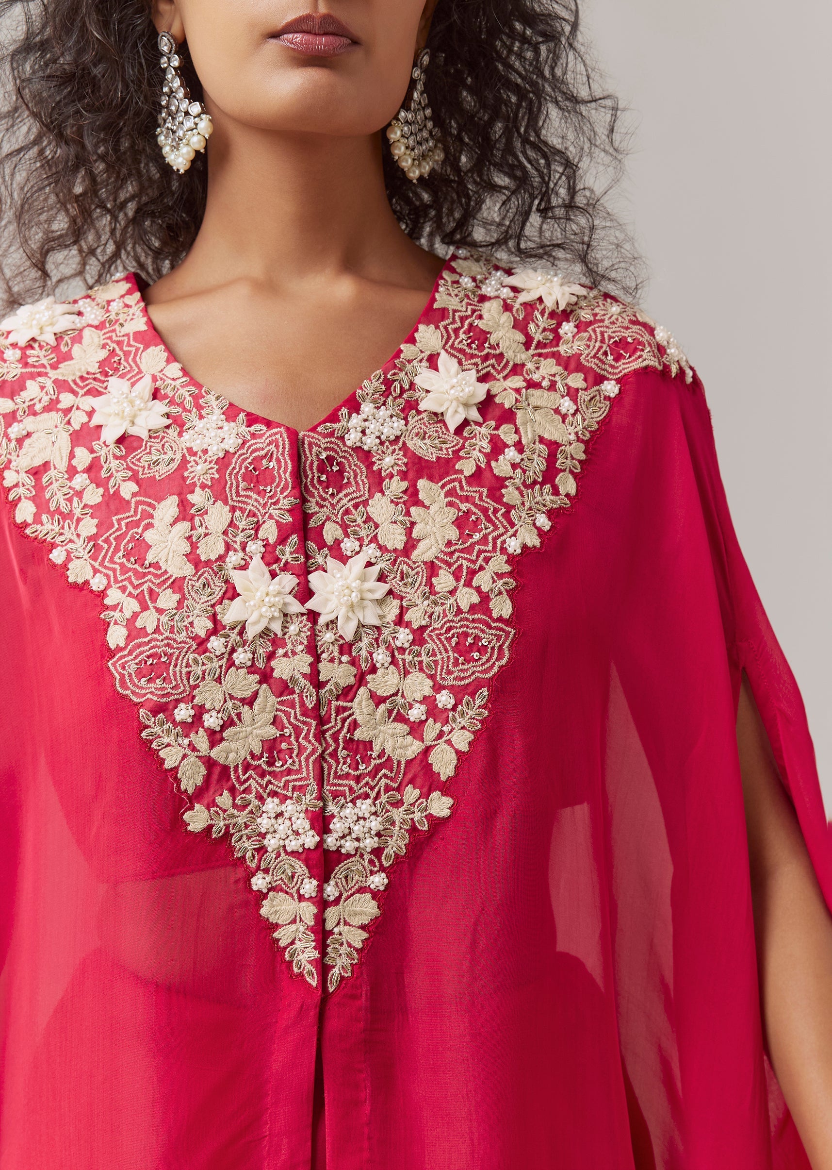 This thread and moti work organza cape set features a sheer embroidered cape layered over a satin V-neck crop top with front hook-eye closure and coordinated palazzo pants. Designed with... More Product Details