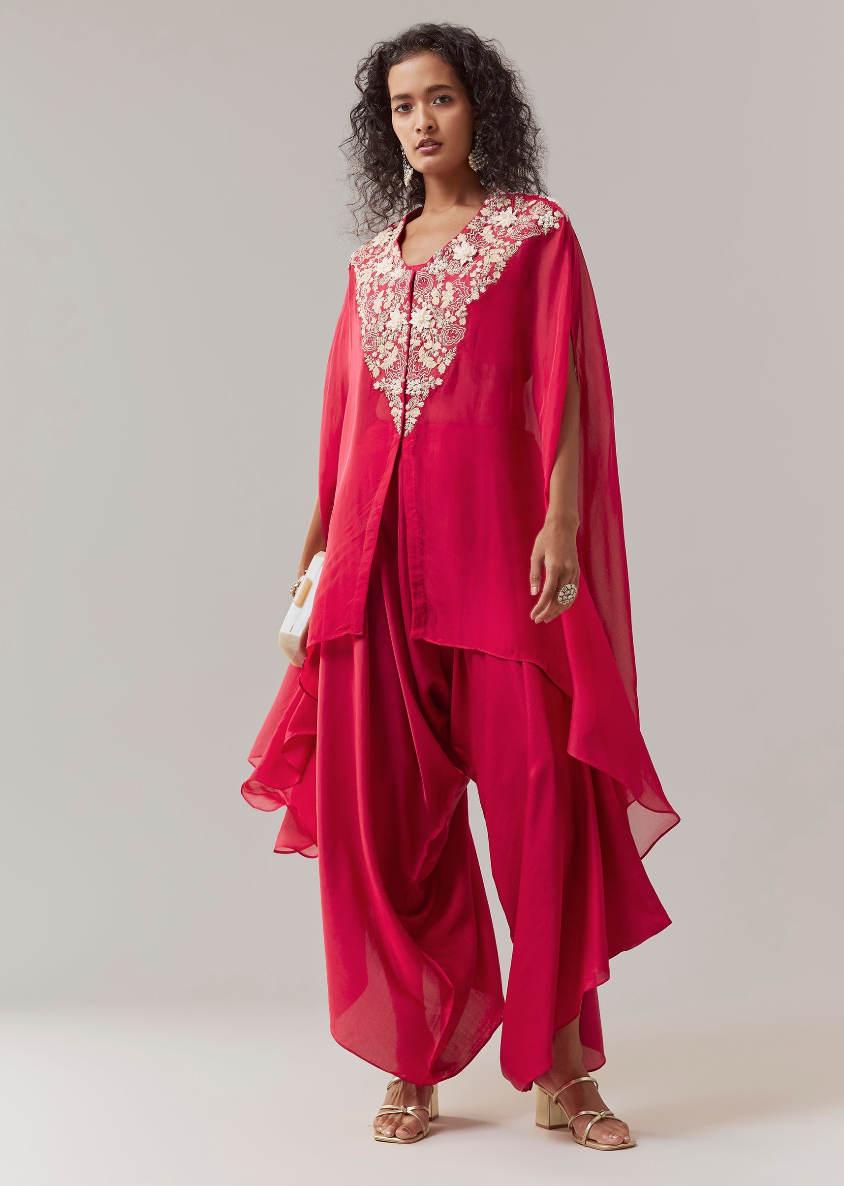 This thread and moti work organza cape set features a sheer embroidered cape layered over a satin V-neck crop top with front hook-eye closure and coordinated palazzo pants. Designed with fancy sleeves and delicate detailing, it offers a perfect balance of elegance and modern style. The drawstring palazzo ensures comfort while maintaining a graceful silhouette throughout wear. Ideal for festive occasions, cocktail evenings, wedding functions, and stylish clubbing nights.