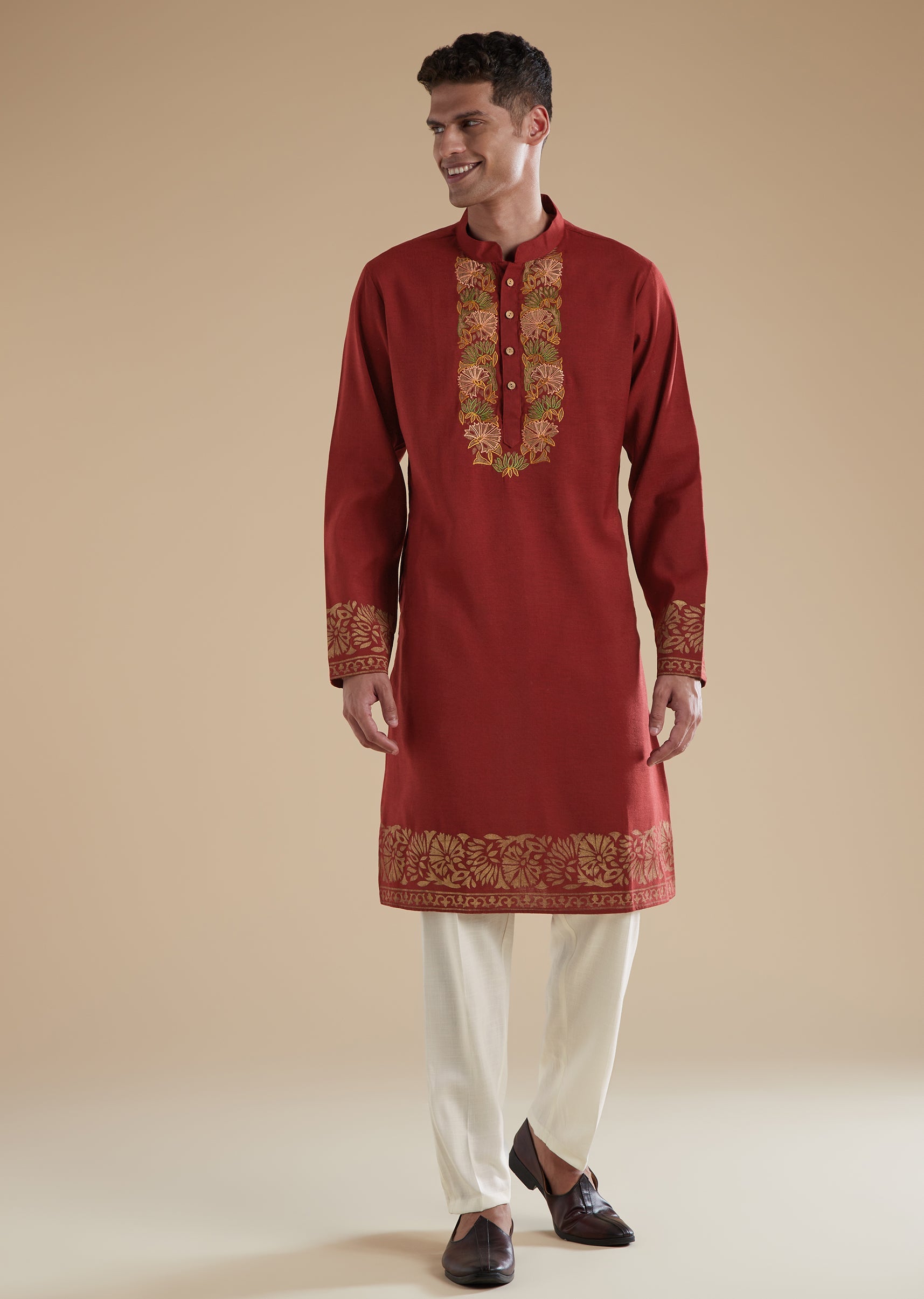 This red mens kurta set is crafted in smooth viscose with cotton as the secondary fabric, offering a comfortable yet refined drape. The kurta is detailed with intricate resham thread work, full sleeves, a classic mandarin collar, and a clean front button closure. Coordinating pants with matching front button fastening complete the ensemble, creating a cohesive and polished festive look. Designed for celebrations and special occasions, this set blends vibrant color with timeless craftsmanship.