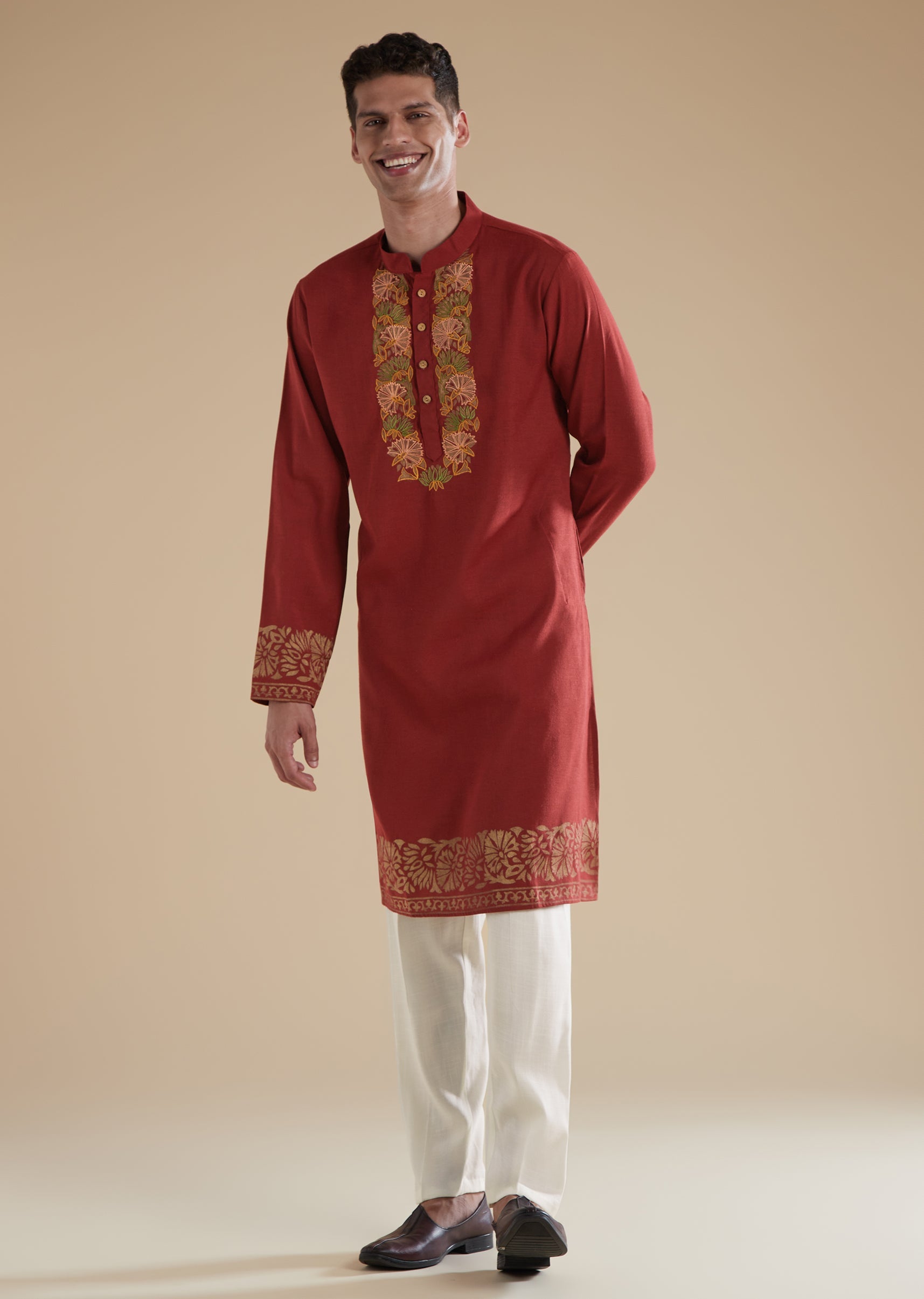This red mens kurta set is crafted in smooth viscose with cotton as the secondary fabric, offering a comfortable yet refined drape. The kurta is detailed with intricate resham thread... More Product Details