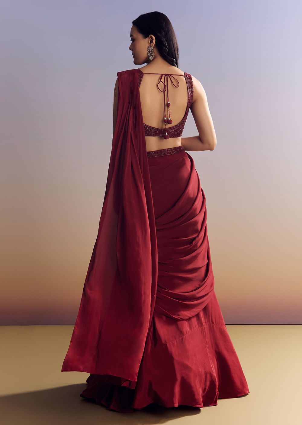 Minimal yet elegant red lehenga set with a cut dana and sequin blouse, paired with a matching belt and soft net dupatta. Ideal for weddings, receptions, or sangeet. Awarded as... More Product Details