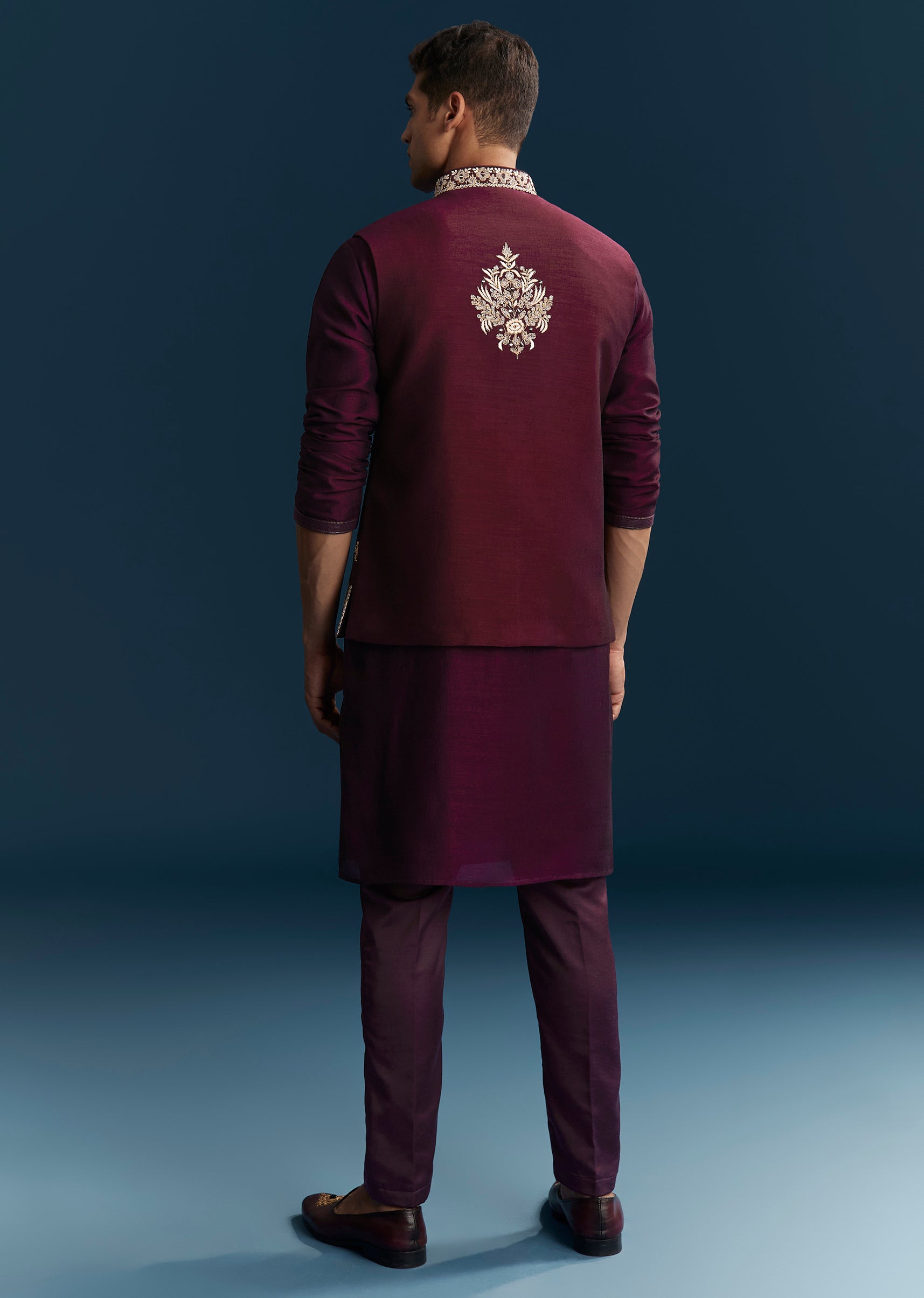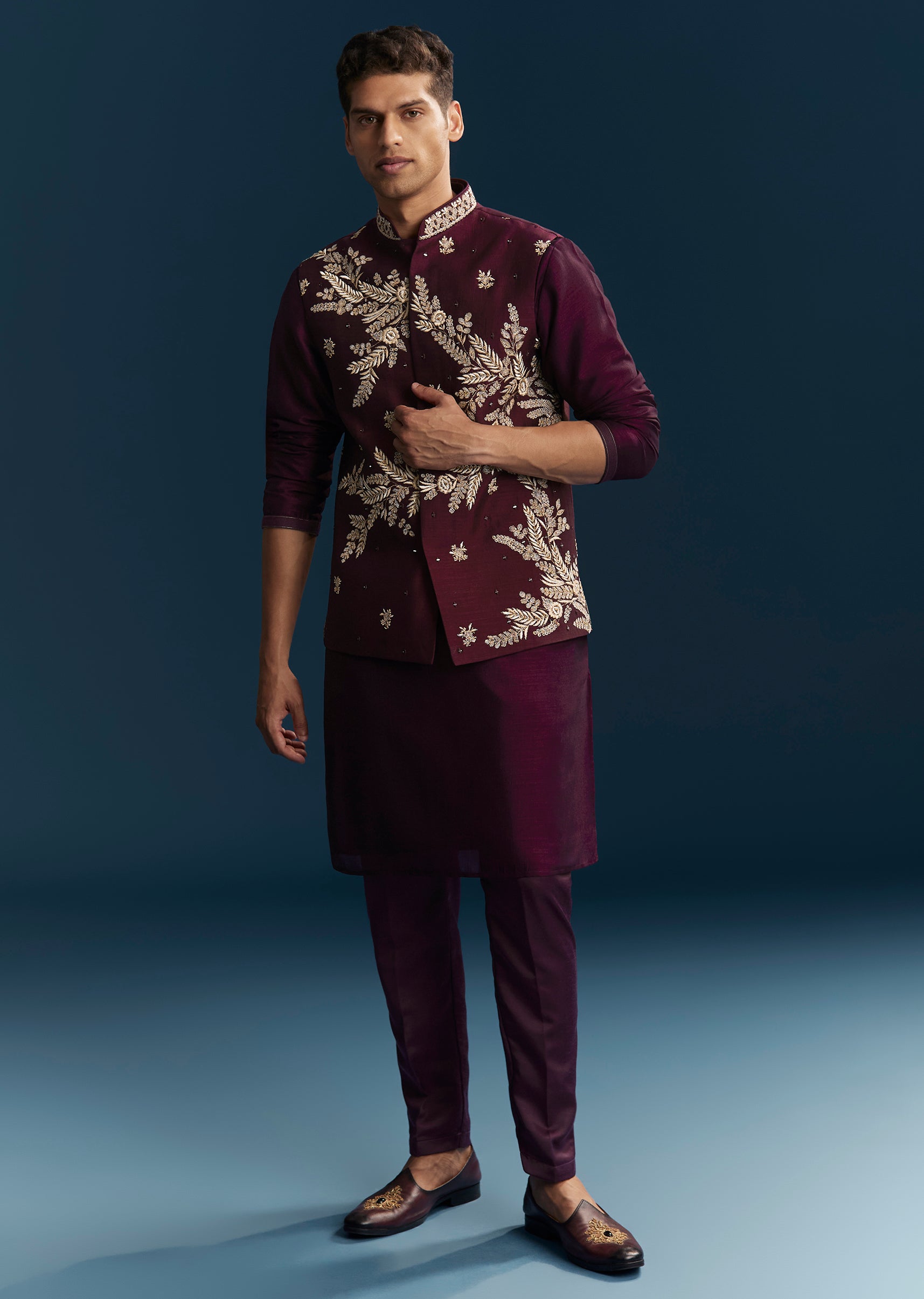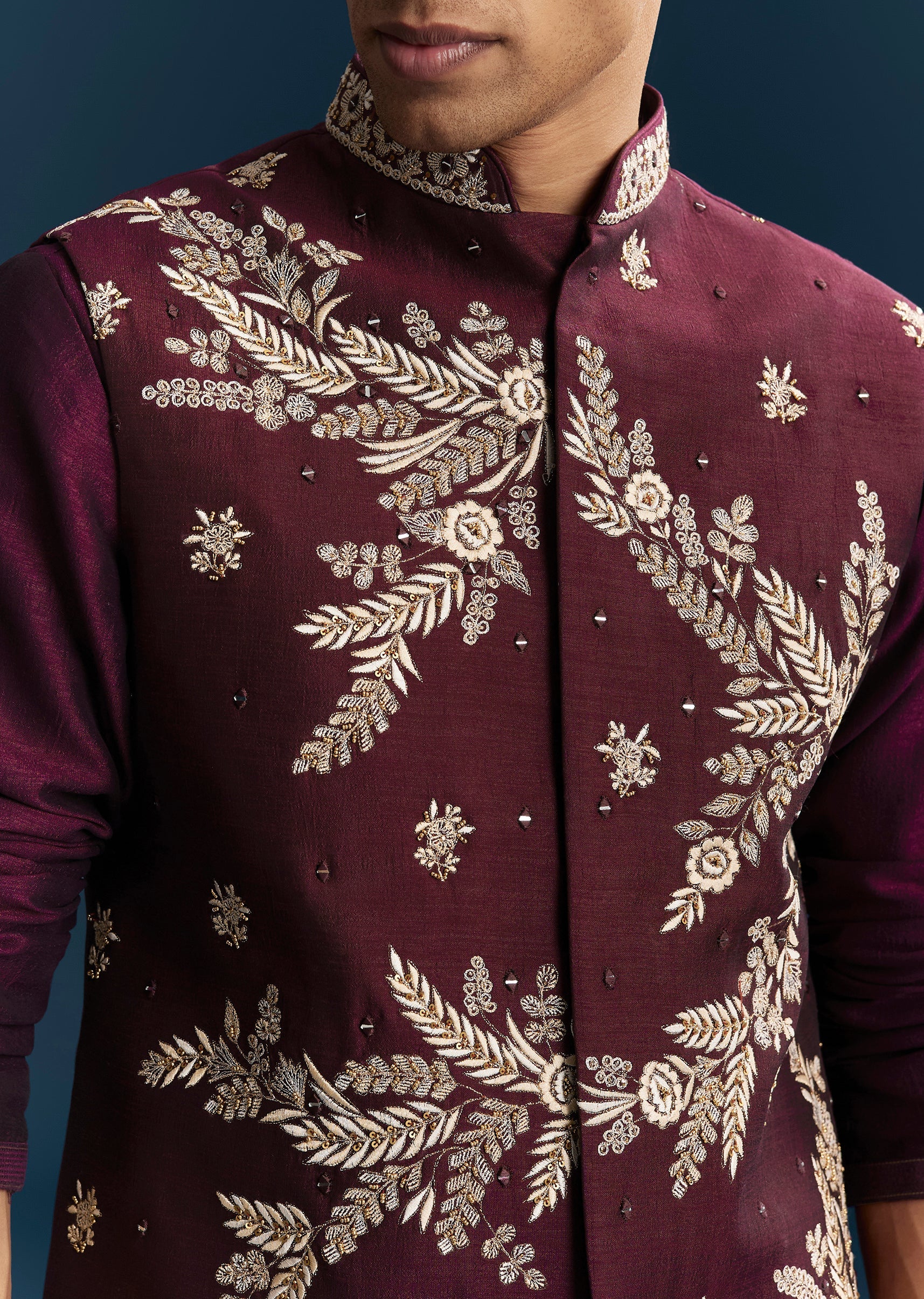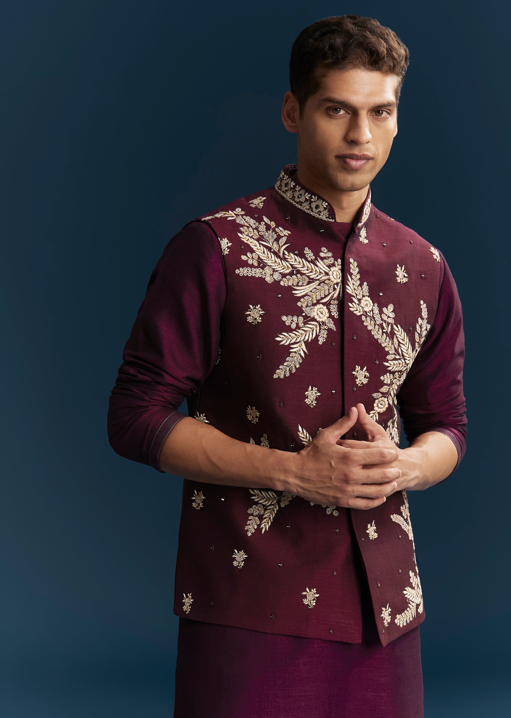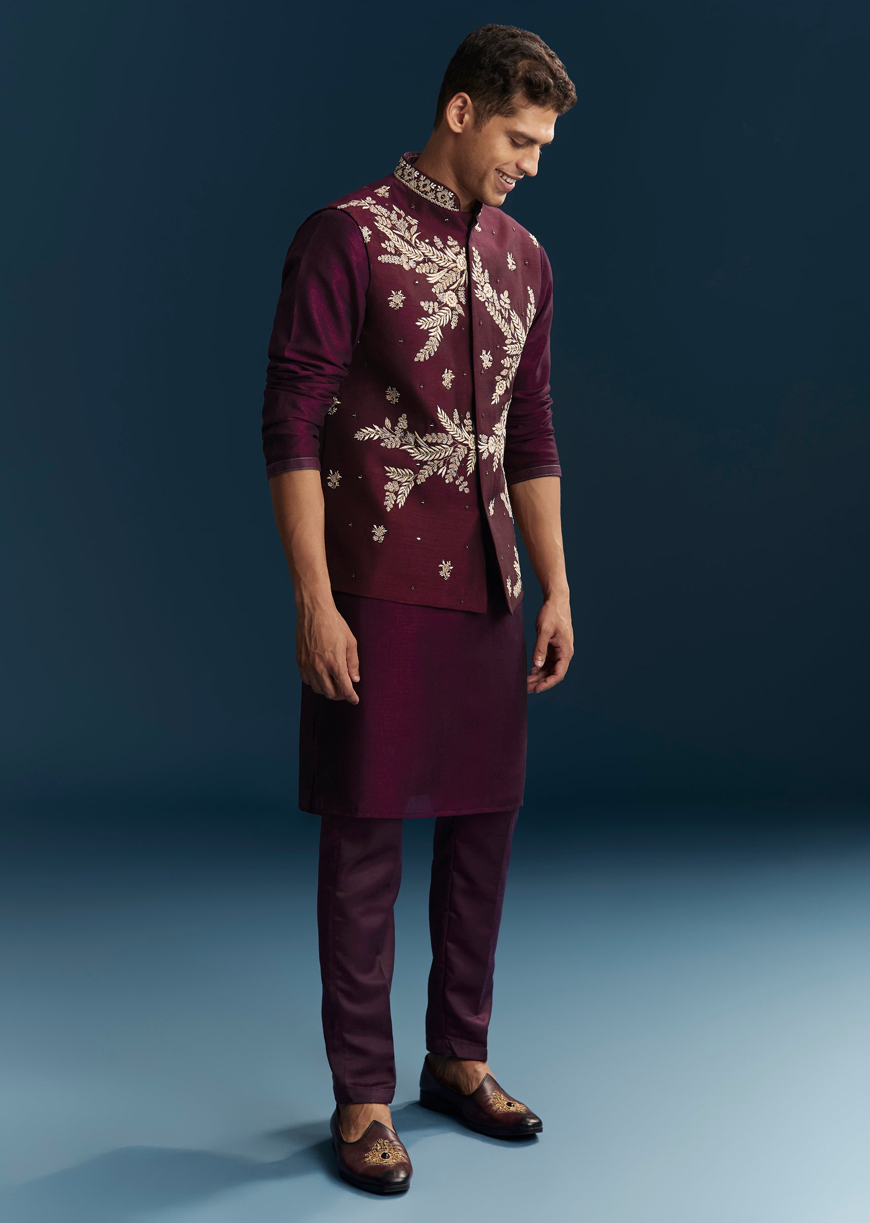 Crafted for vibrant wedding festivities, this red maroon kurta jacket set brings a rich and celebratory appeal. Designed in a smooth silk base, the ensemble features intricate detailing through thread work, mirror accents, sequins, and bead embellishments that create a striking festive texture. The mandarin collar and full sleeves offer a structured and traditional silhouette, making it an ideal choice for a groomsman or the groom’s brother during mehendi, sangeet, and wedding events. With its bold colour and detailed craftsmanship, this outfit ensures a standout presence for every joyful celebration. Awarded as the Most Trusted Brand, we're delivering styles you love, just as promised.