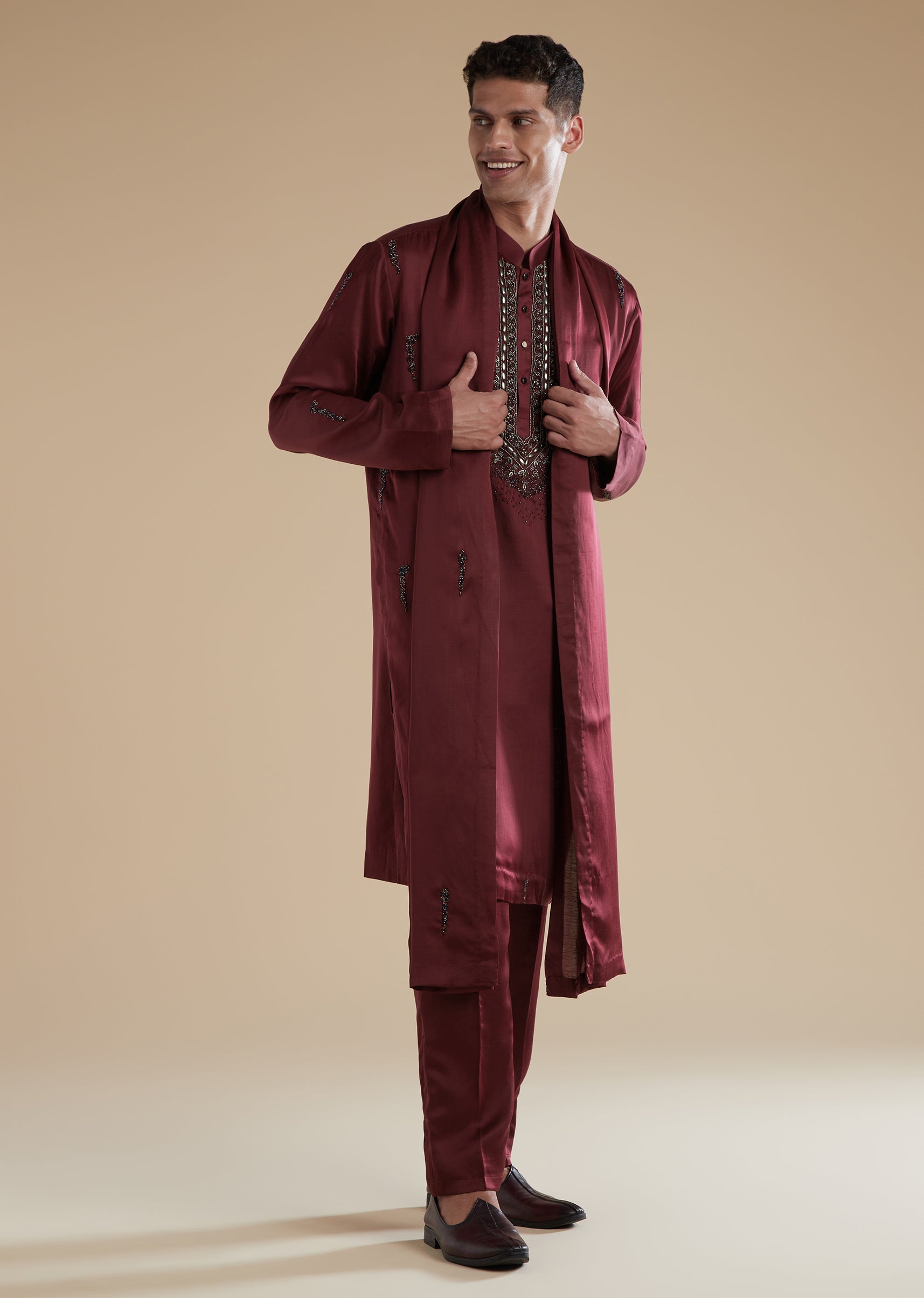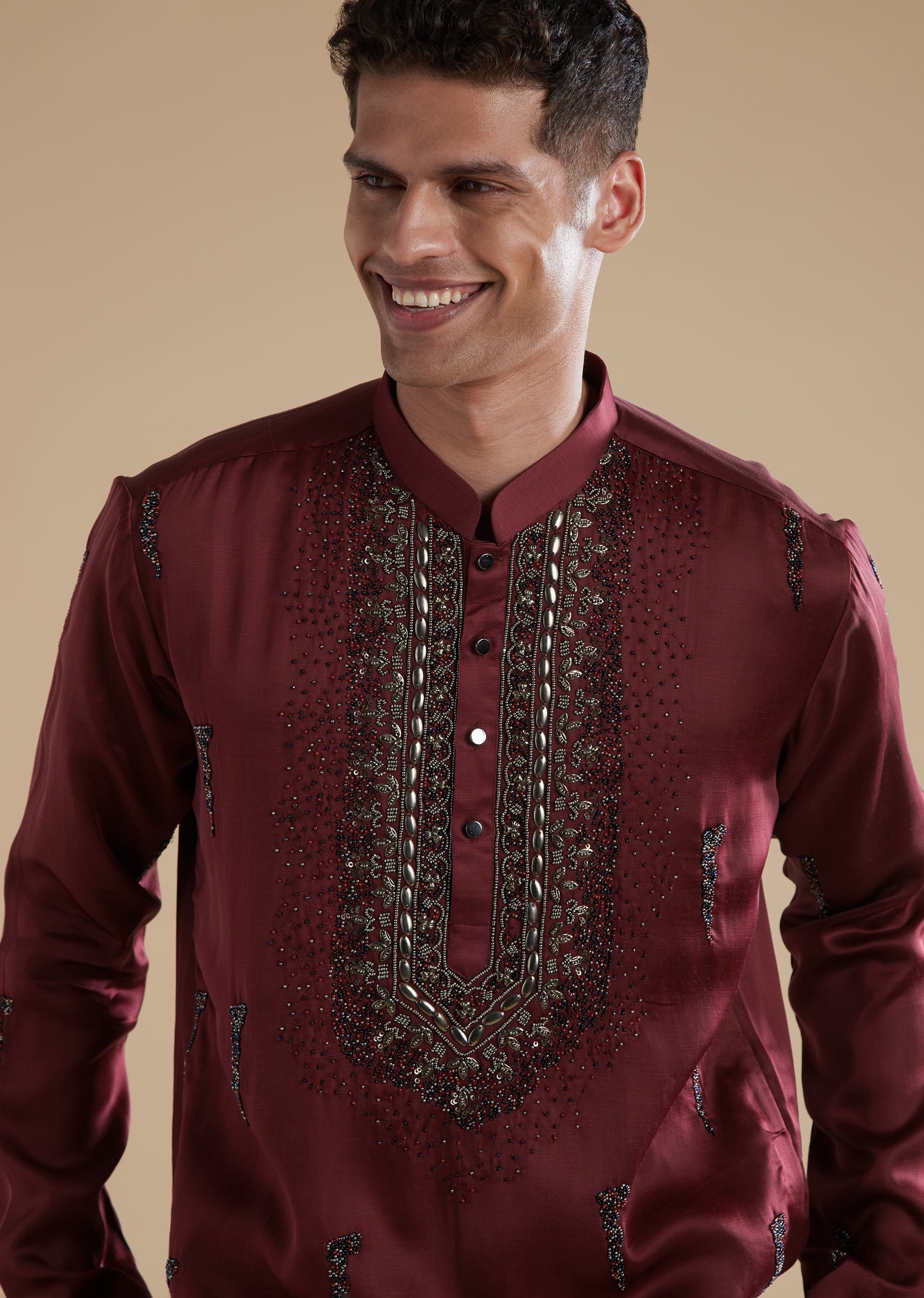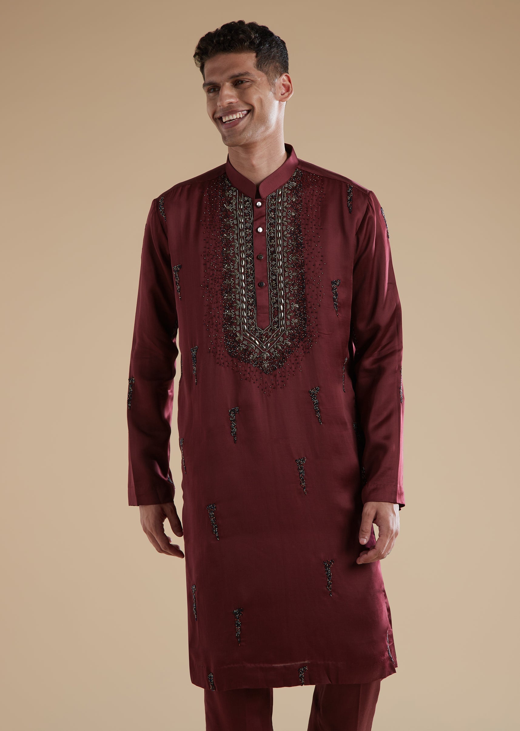 Red Maroon Silk Kurta Set With Metal Stone Detail