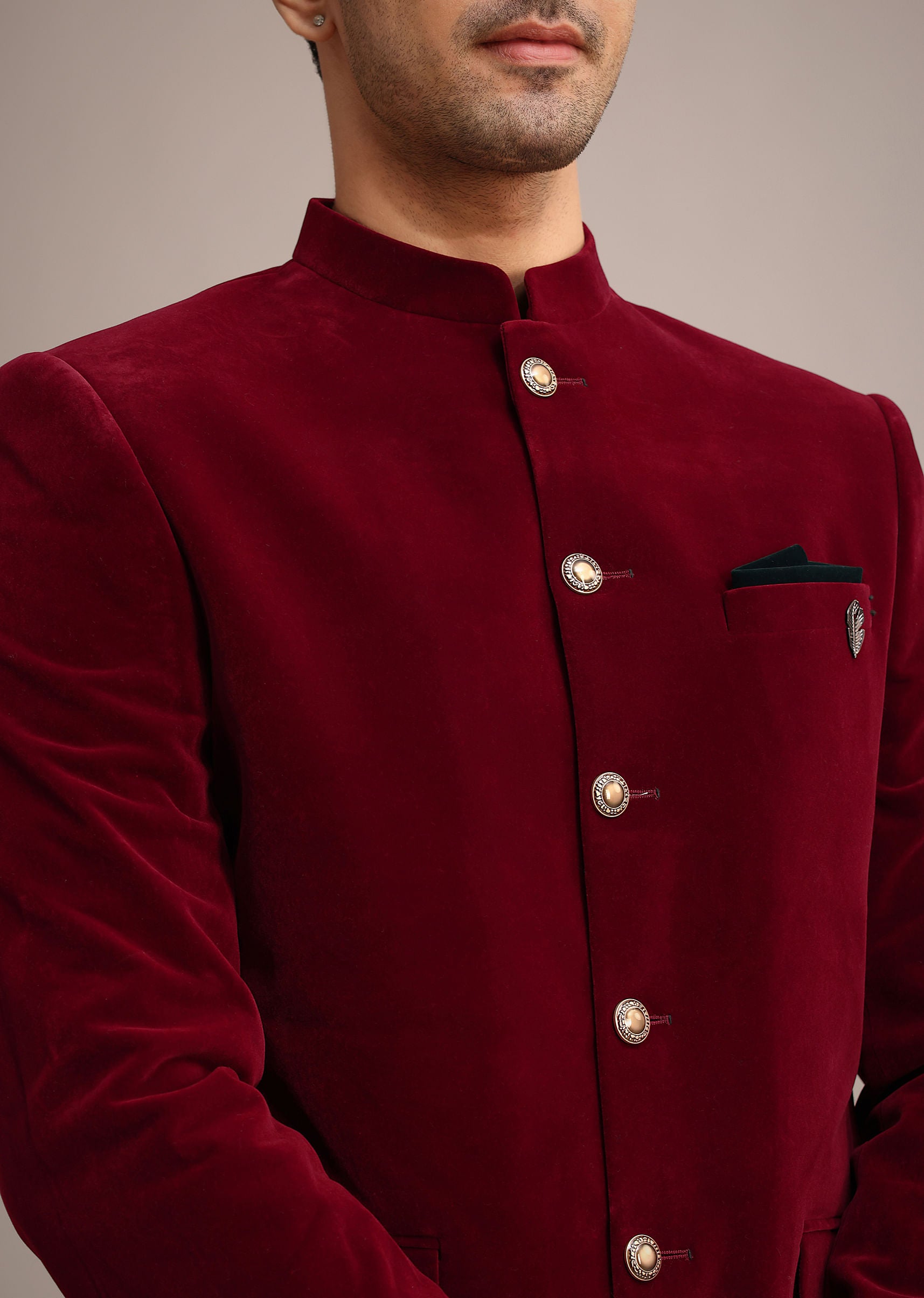 Red Micro Velvet Jodhpuri Set With Pocket Square
