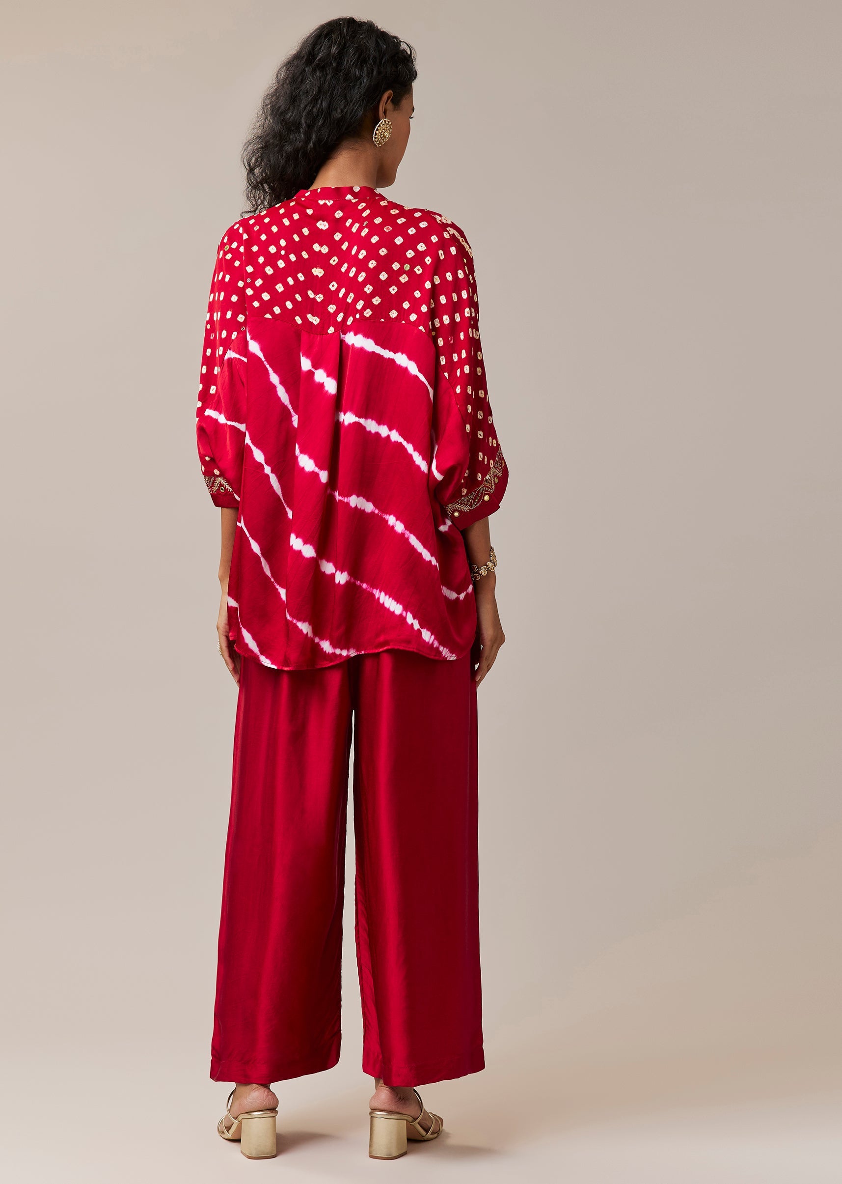 Red Mirror Work Hand Dyed Bandhani and Leheriya Co-ord Set