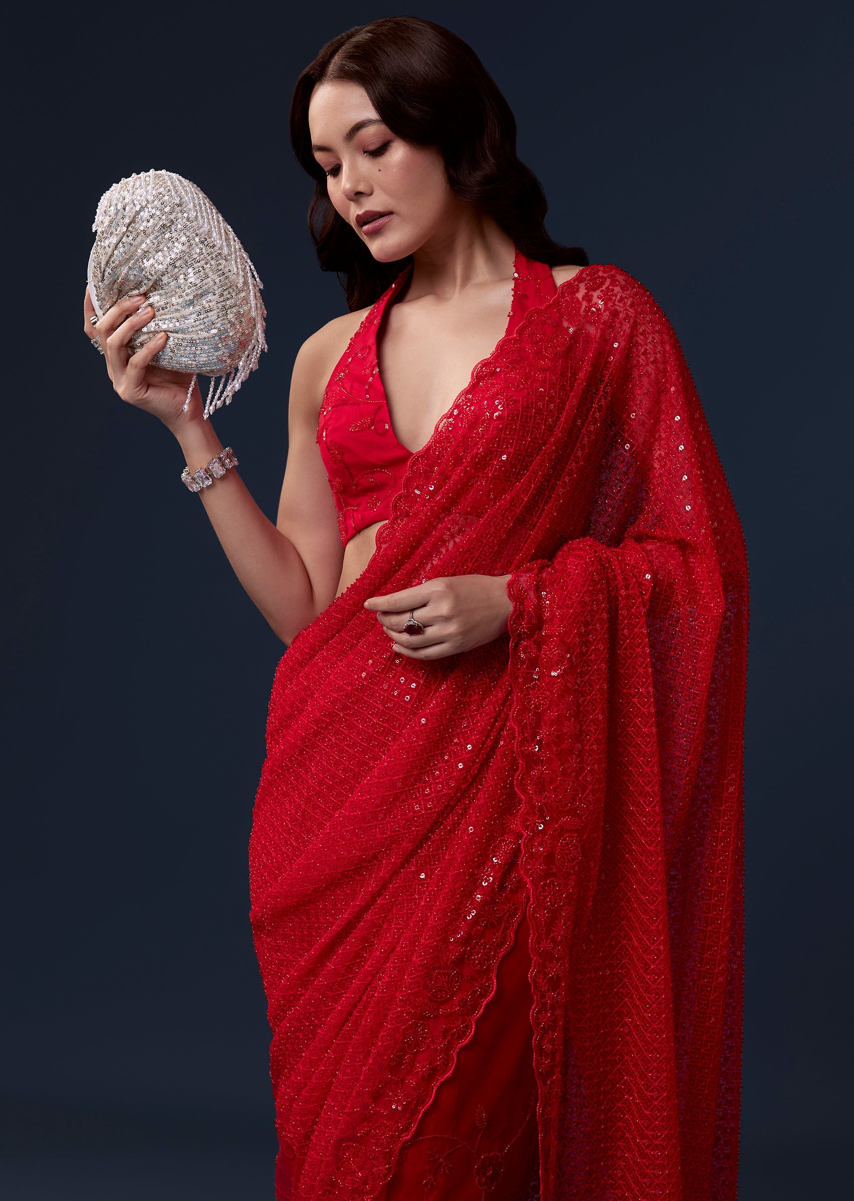 Red Net Saree With Cutdana Beads And Sequin Embroidery