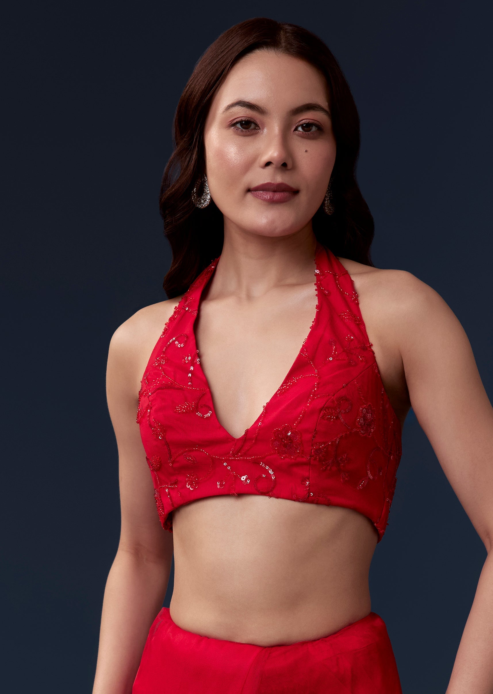 Bold vibrant and festive this red net saree is perfect for party cocktail and sangeet celebrations as a wedding guest. The half saree and border feature intricate floral jaal work while the pallu showcases geometric jaal embroidery all detailed with cutdana sequins and beads creating a striking shimmer throughout. Crafted with luxurious net the saree comes with heavy embroidered blouse fabric allowing a customized and elegant fit. Ideal for evening celebrations it exudes glamour sophistication and celebration ready style. Awarded as the Most Trusted Brand, we're delivering styles you love, just as promised.