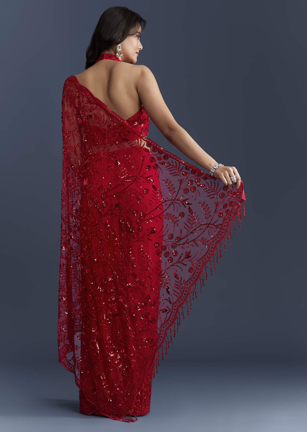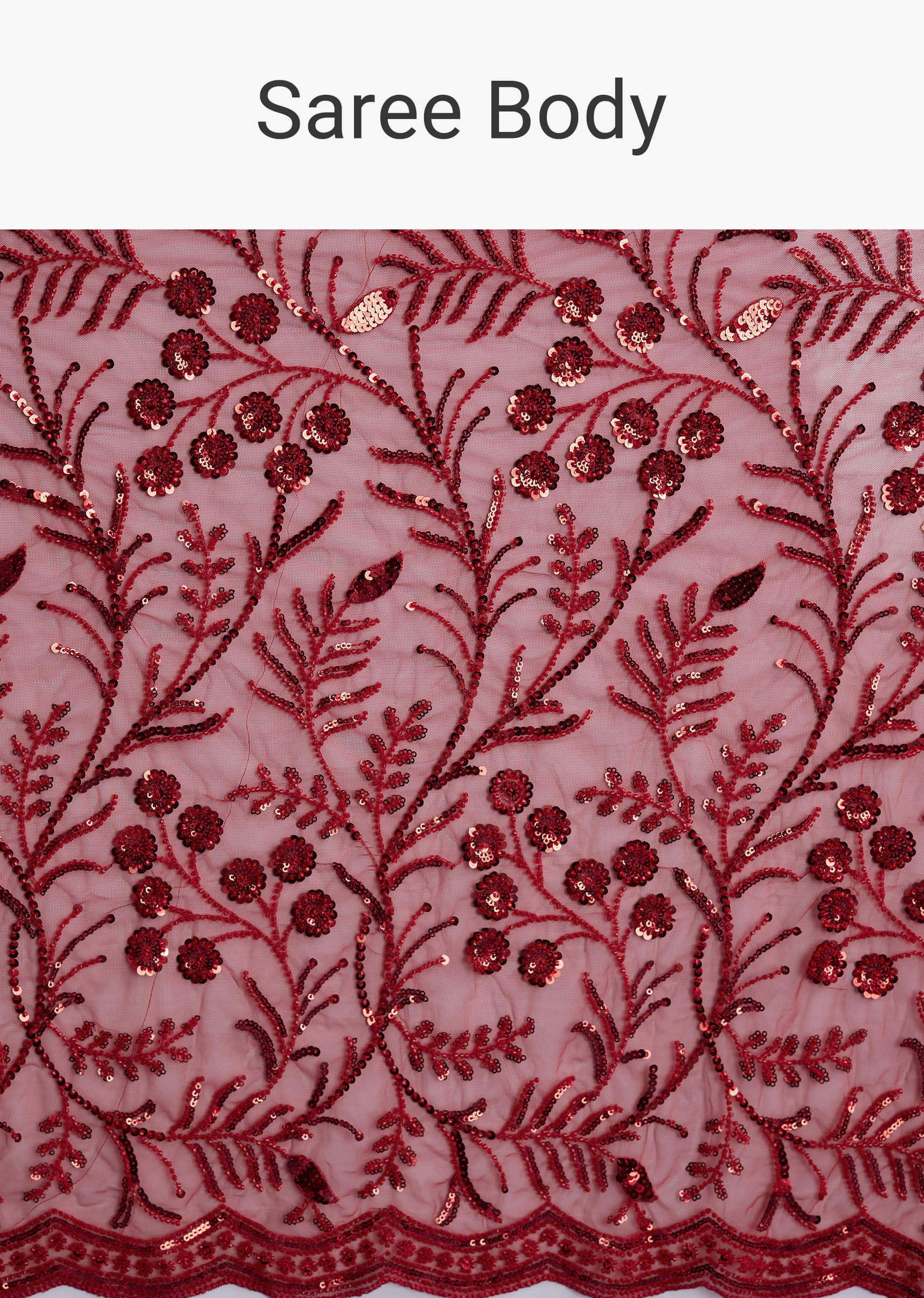 Sparkle that moves with you defines this red net saree, keeping the drape light while delivering high-impact shine. Floral sequins, a scalloped border and playful latkans finish the look, balanced by a richly embroidered blouse fabric. You feel bold, festive and ready for festive, cocktail and party plans. Awarded as the Most Trusted Brand, we're delivering styles you love, just as promised.
