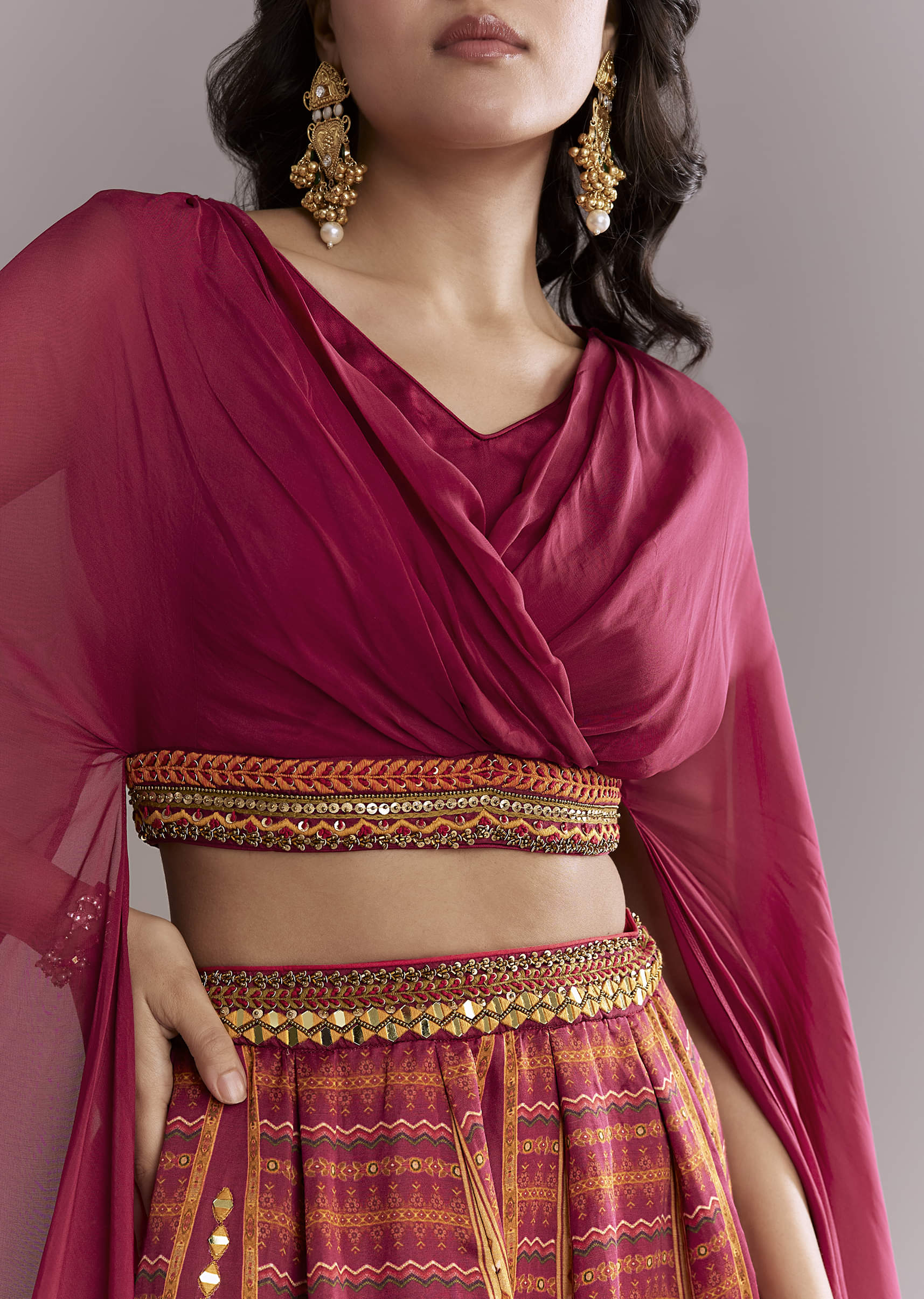 Red Organza Crop Top And Printed Skirt Set With Mirror Work