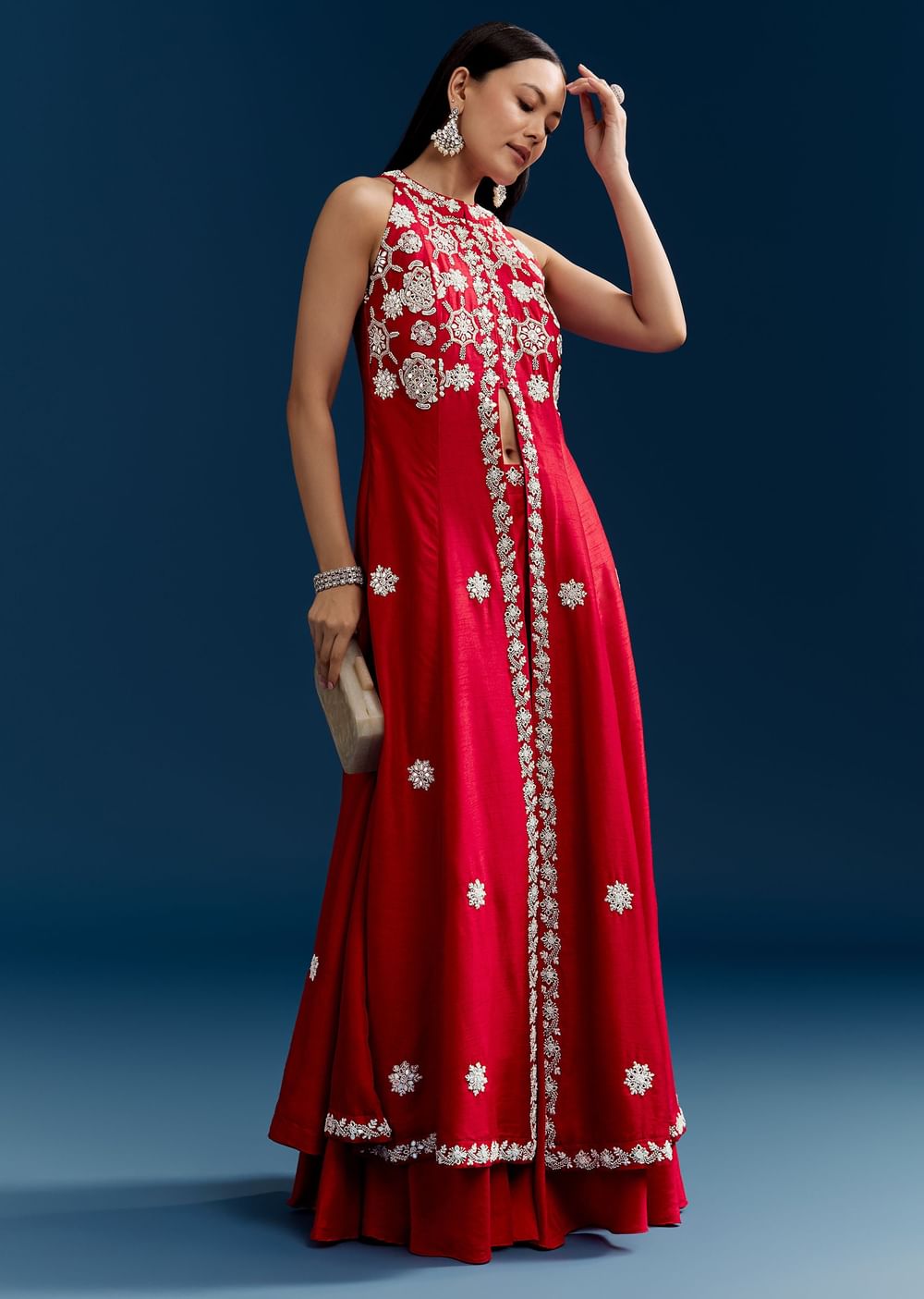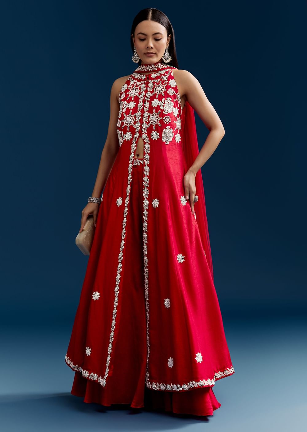 Rich in tone and detailing, this red palazzo set features a front-slit kurta with moti and mirror work embroidery. The sleeveless cut and round neckline keep it sleek, while the... More Product Details