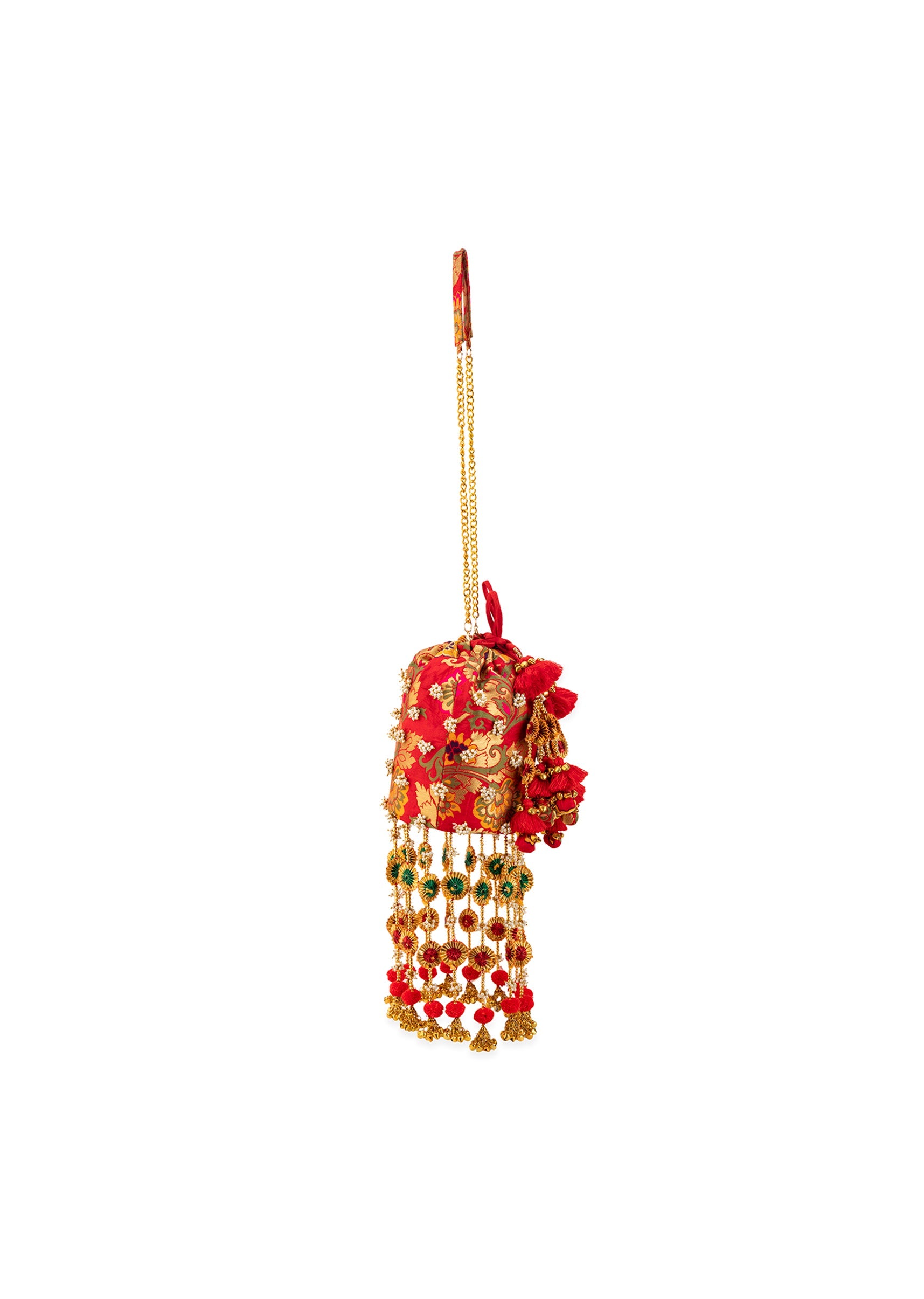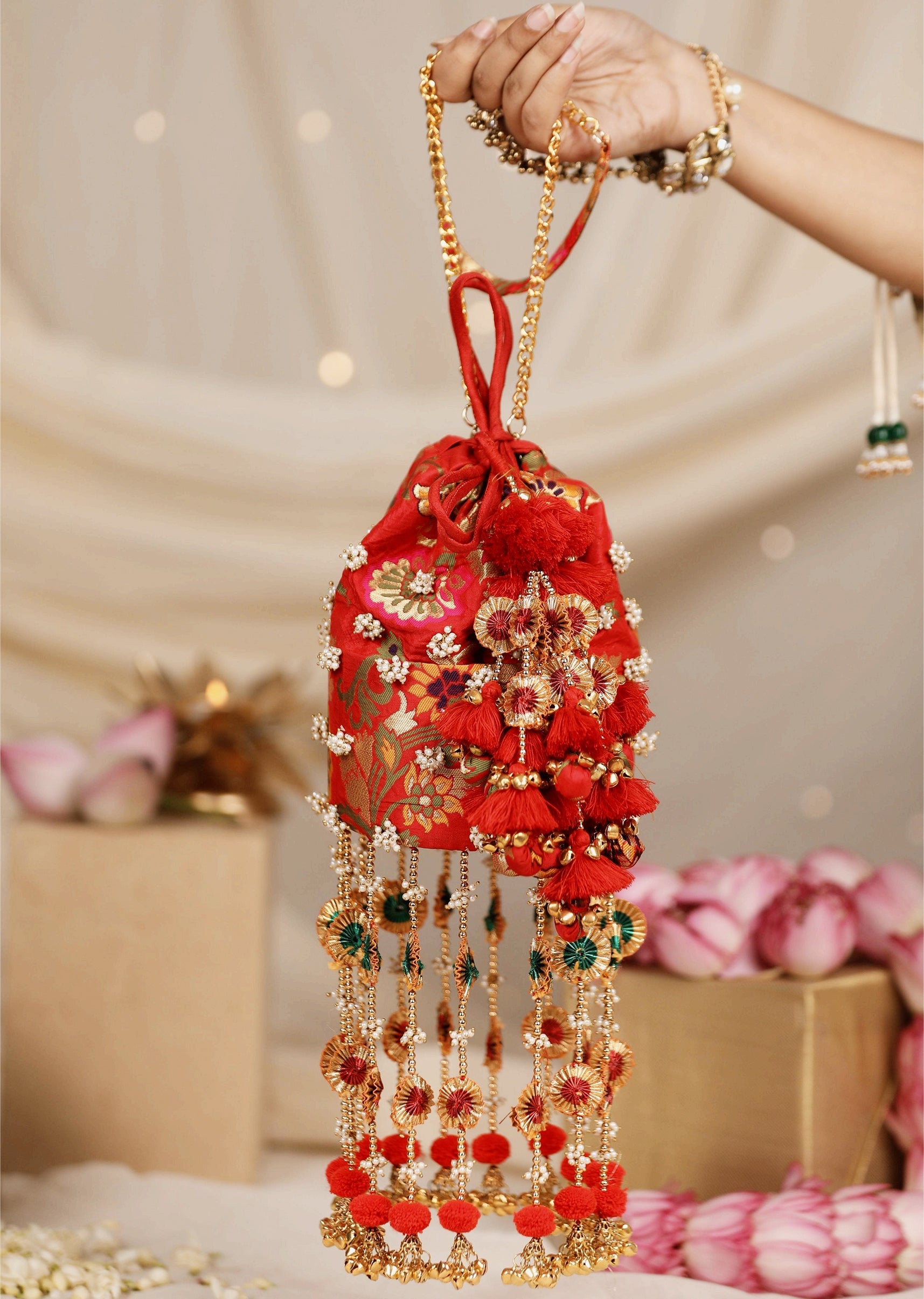Red Pearl Embellished Layered Pom Pom Tassel Potli Bag