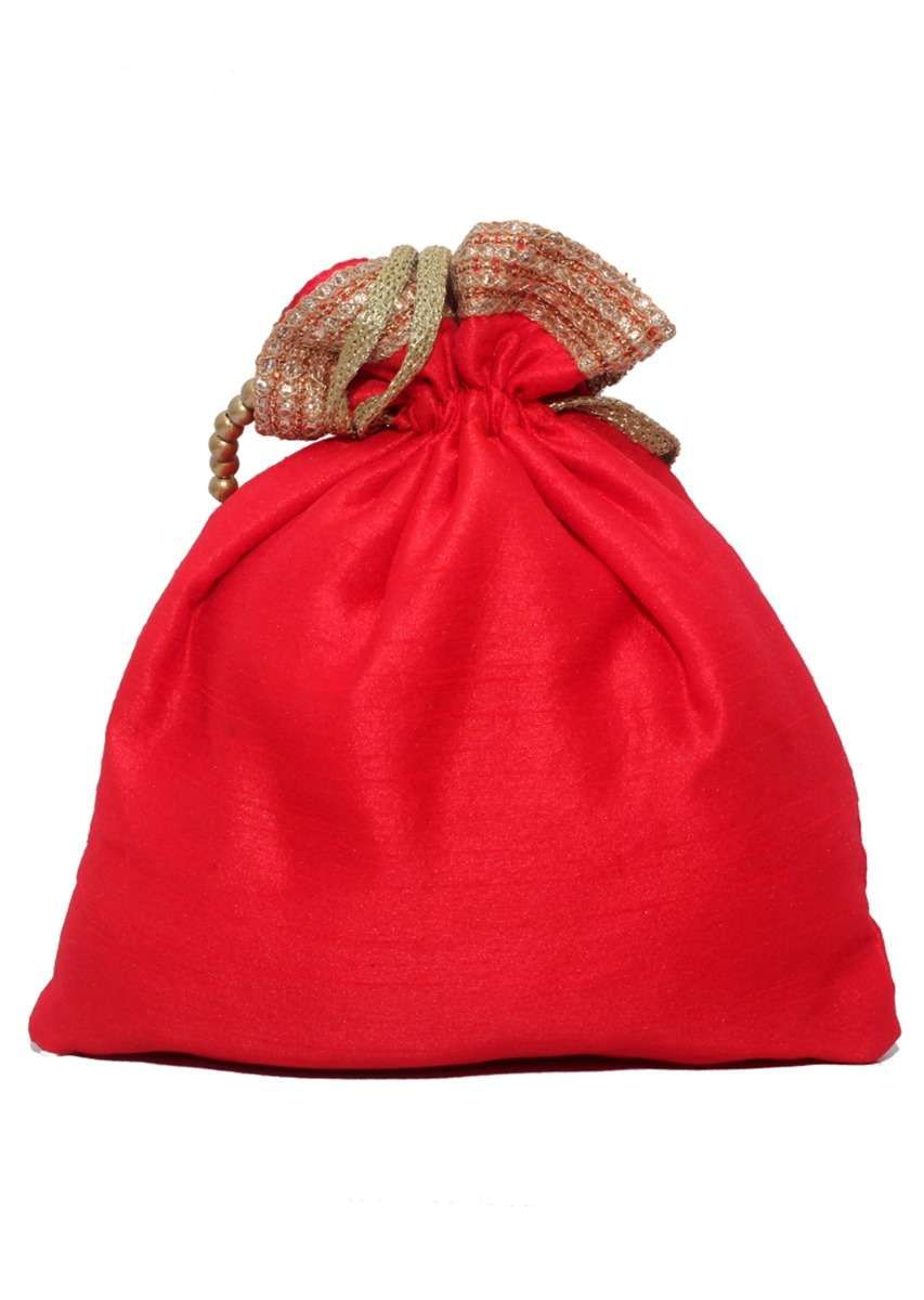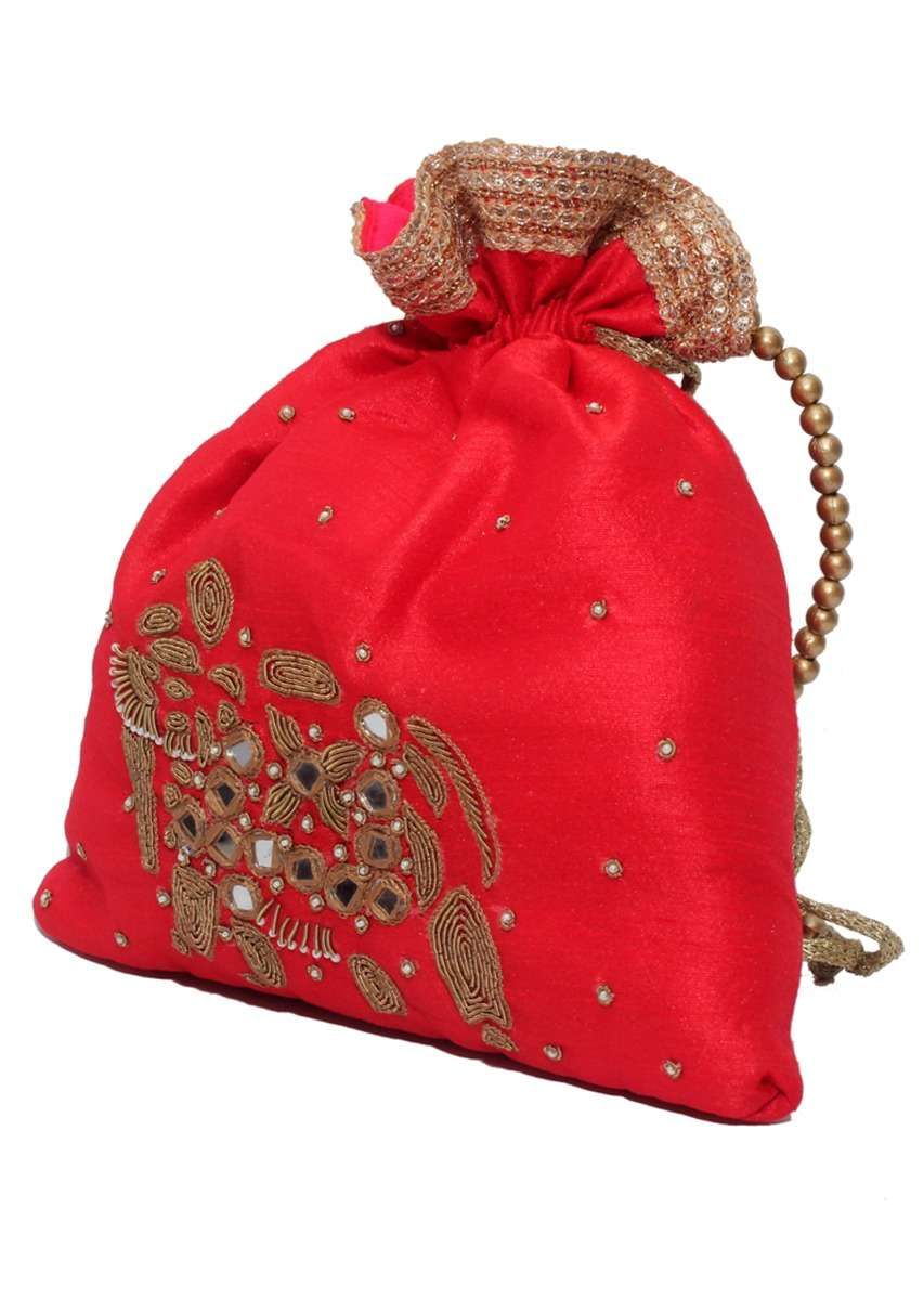 This latest trend is hanging chains, on a raw silk base which makes it comfortable to use, is best piece to carry on just attire, with plenty space, and a long sling too. This red potli bag is adorned with zardosi and mirror embroidered elephant motif. It has bead and moti tassel dori and golden bead sling. Awarded As The Most Trusted Brand We'Re Delivering Styles You Love Just As Promised.