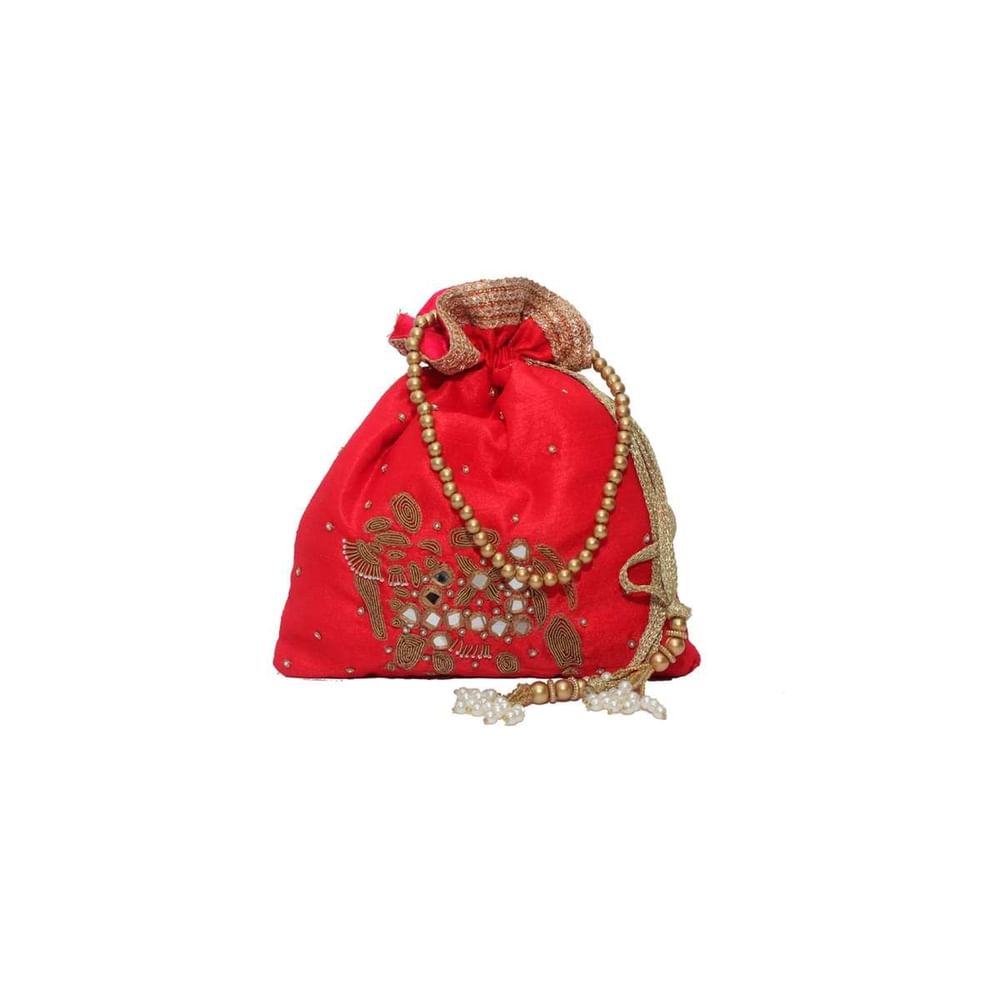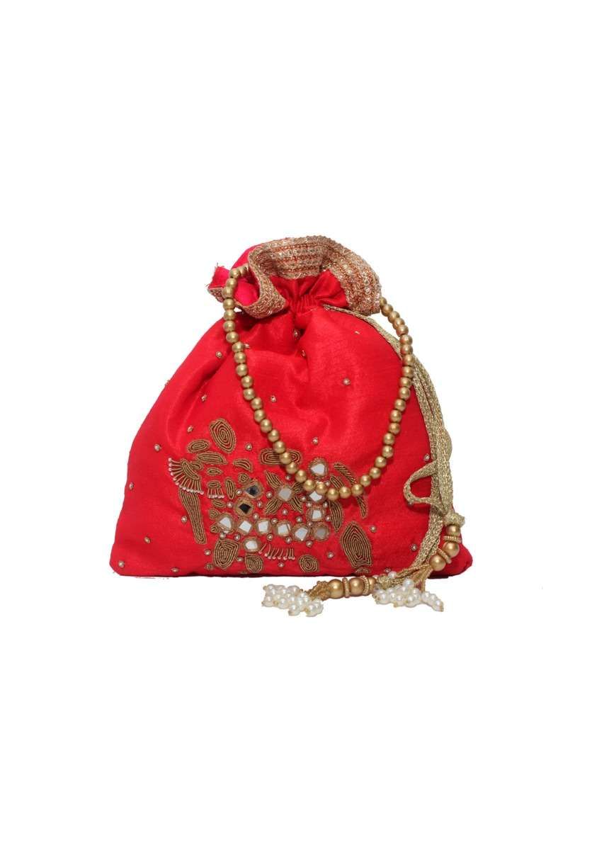 Red Potli Bag In Raw Silk With Mirror And Zardosi Embroidered Elephant Motif By Pink Cocktail