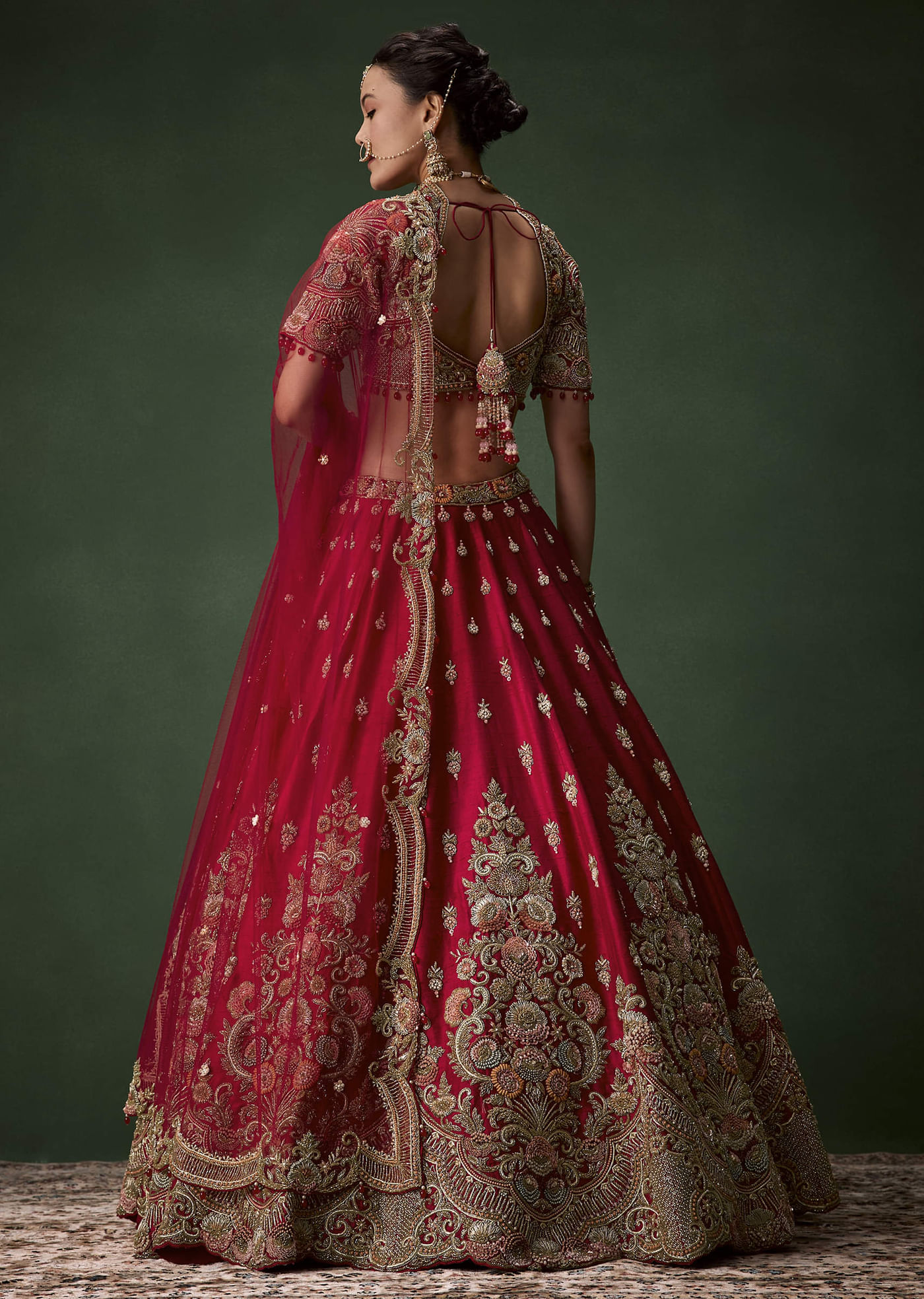 Red Raw Silk Bridal Lehenga Set with Two Dupattas