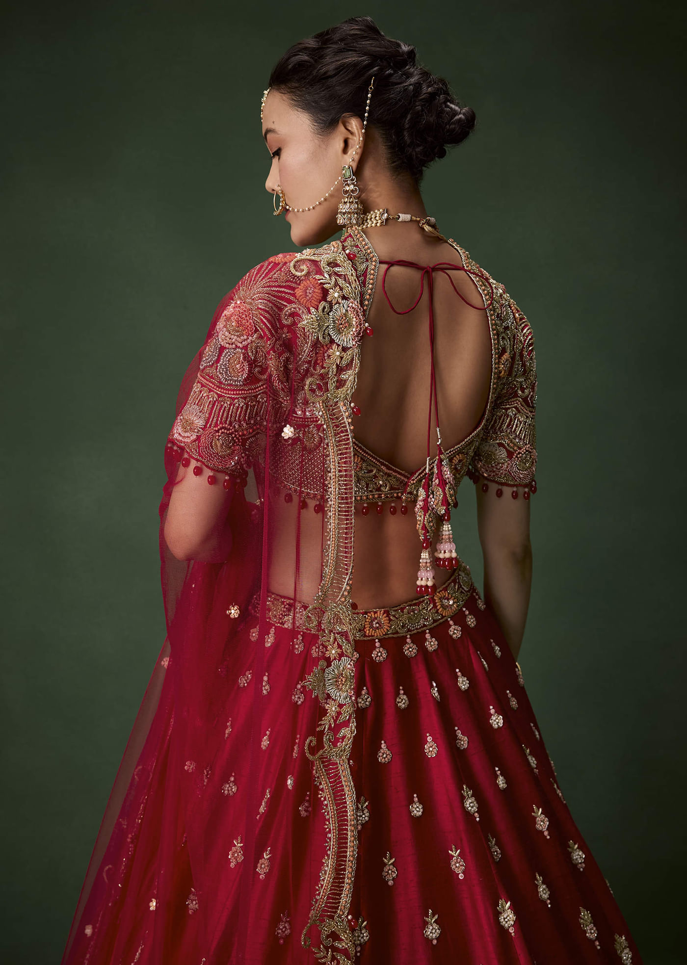 A timeless tribute to bridal tradition, this red raw silk lehenga set is crafted to command elegance with every step. The opulent silk base is embellished with intricate zardozi and... More Product Details