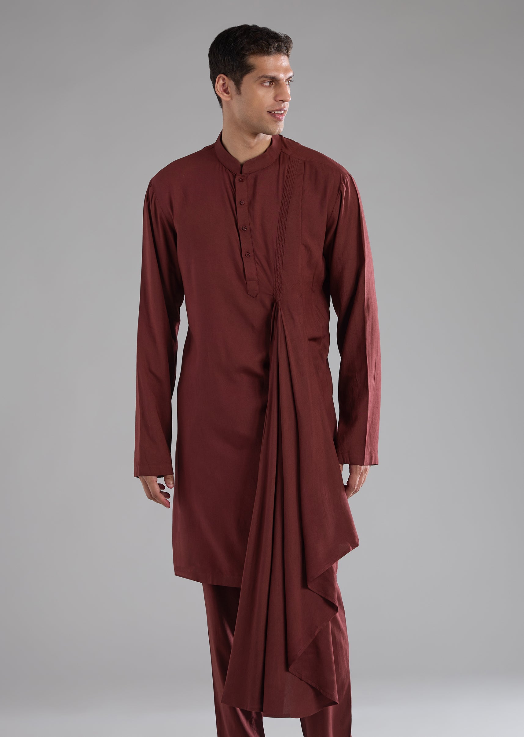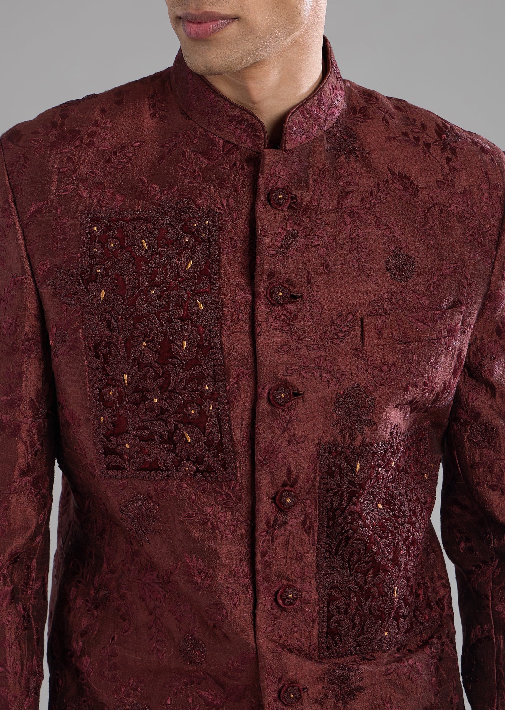 Red Raw Silk Embroidered Indowestern Kurta Set