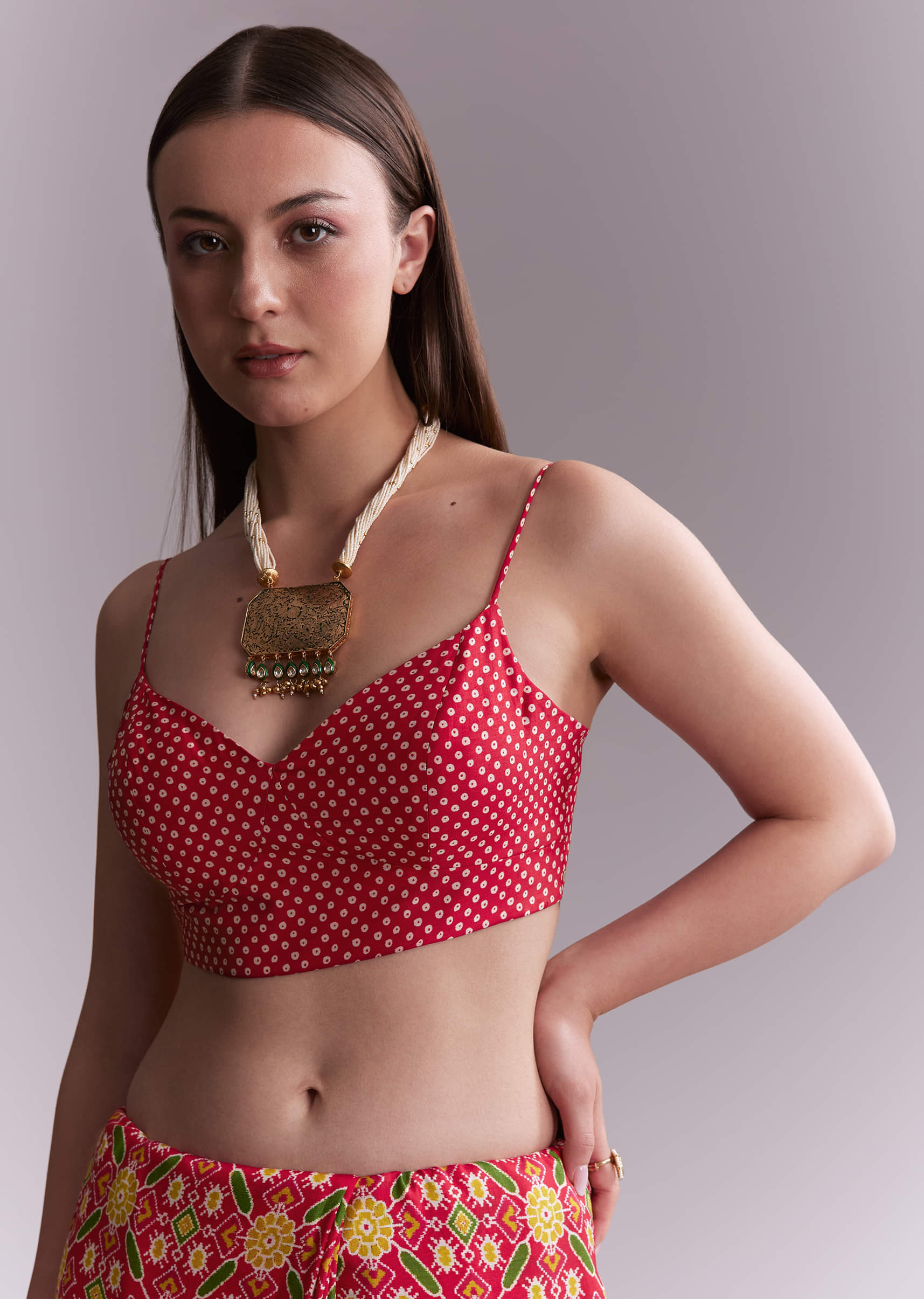 For nights built around music and movement, this red satin woven saree keeps the energy high and the styling simple. Geometric ikat print flows across the saree with mirror work... More Product Details