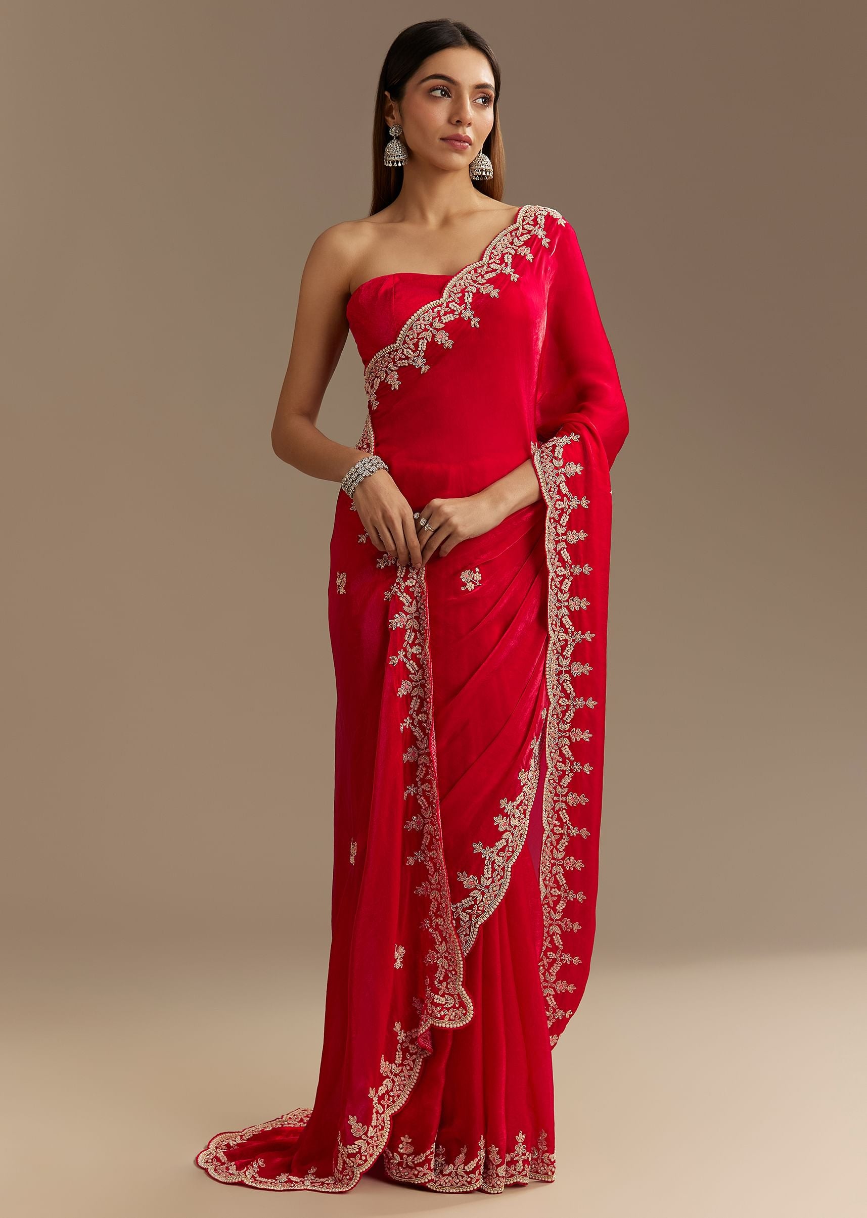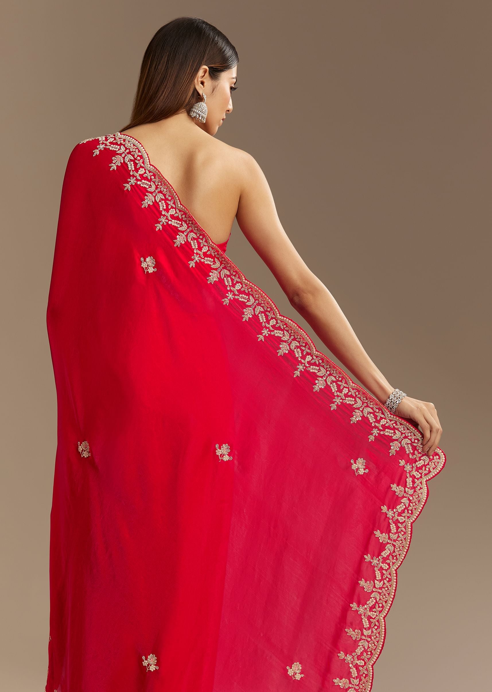 Red Satin Saree With Zardosi Embroidery And Scallop Border