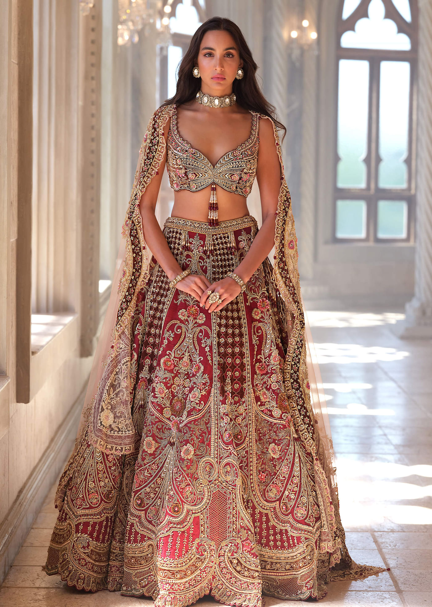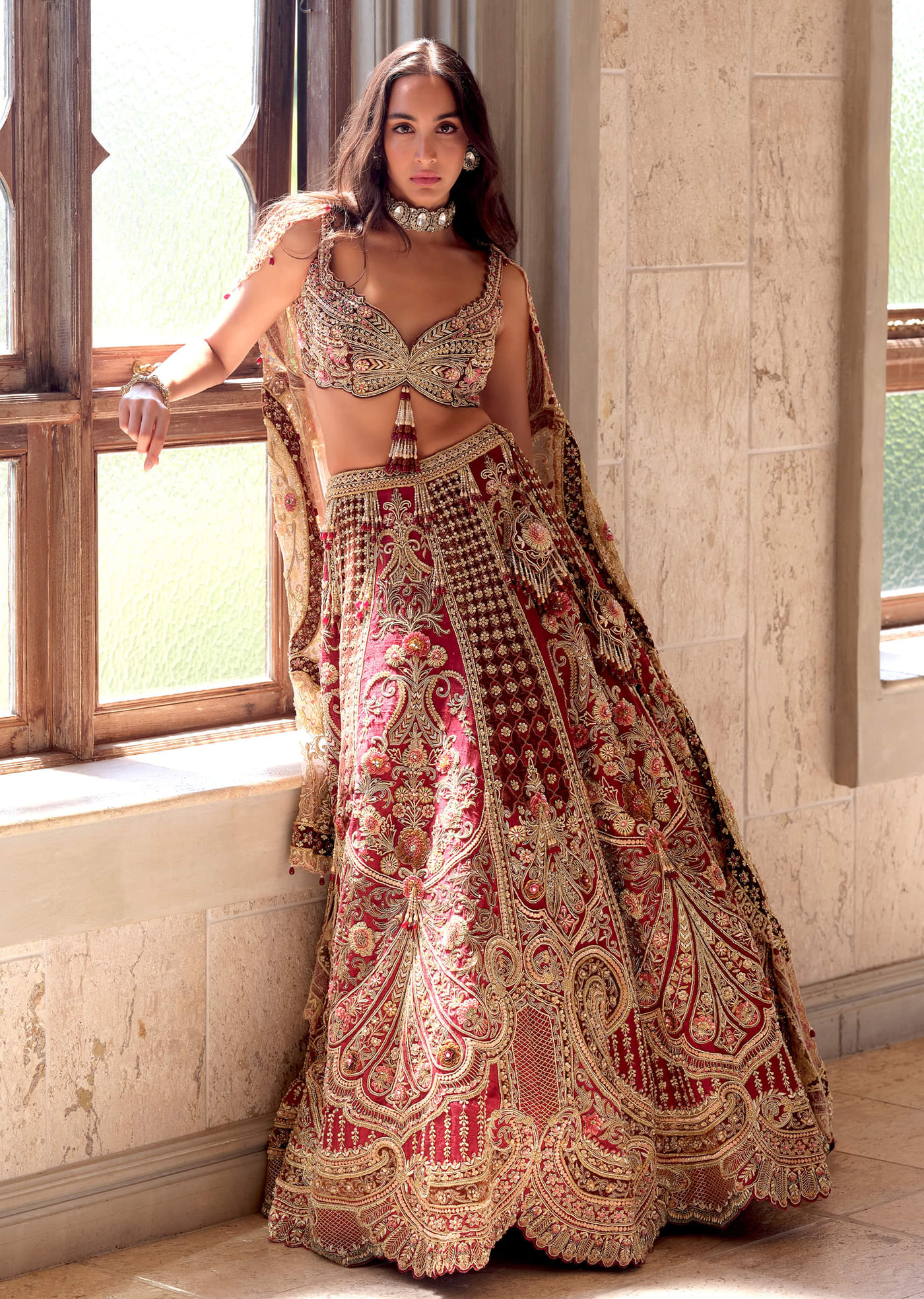 Classic bridal radiance returns as this red silk bridal lehenga gleams with celebration light with the lehenga name resting clearly in the middle. Sequins and stone embroidery elevate the sweetheart-neck... More Product Details