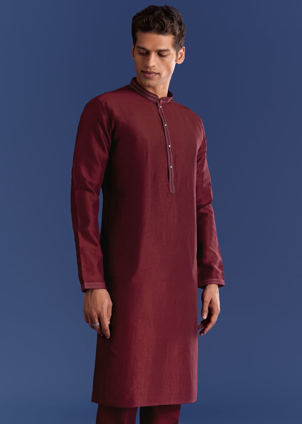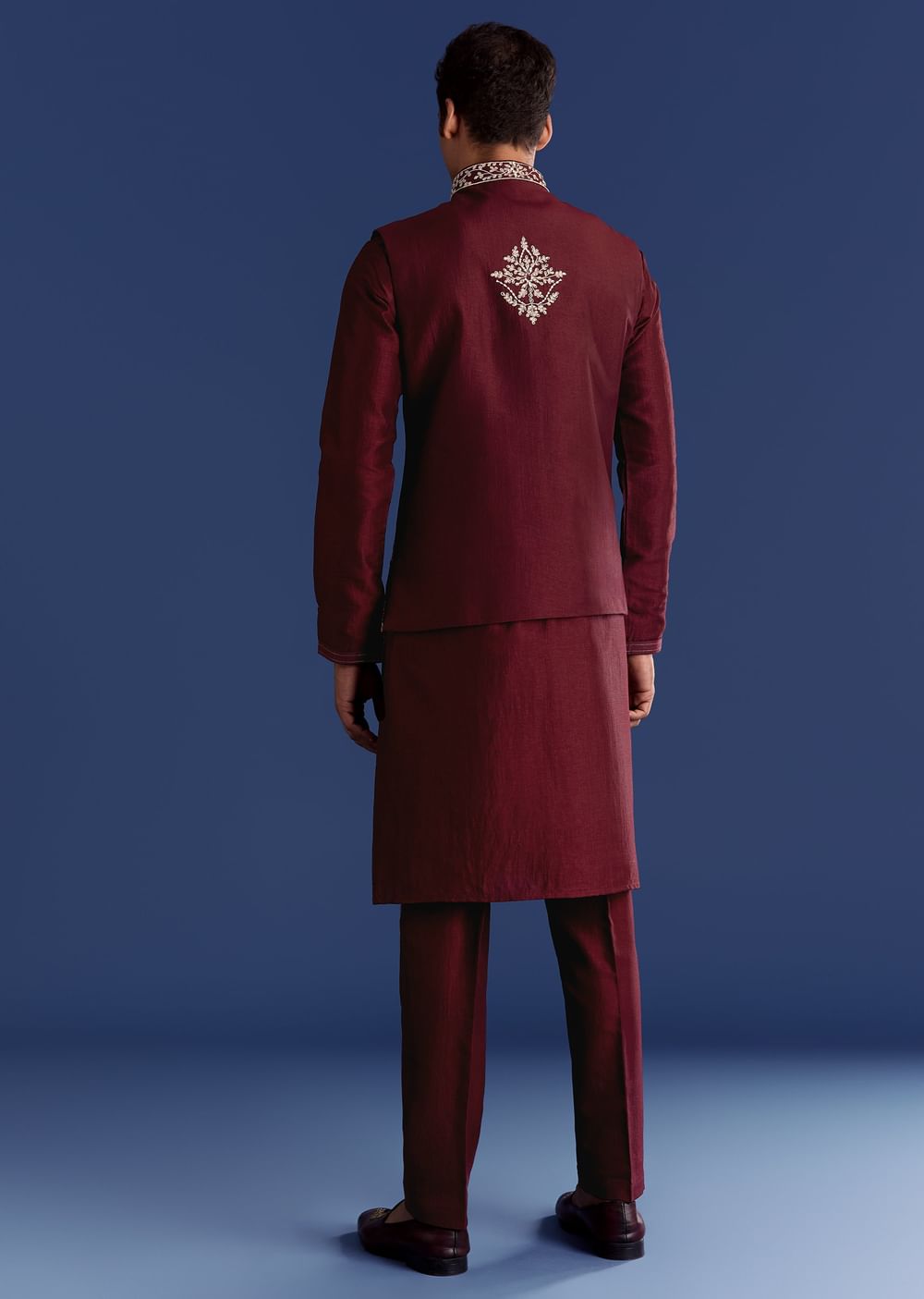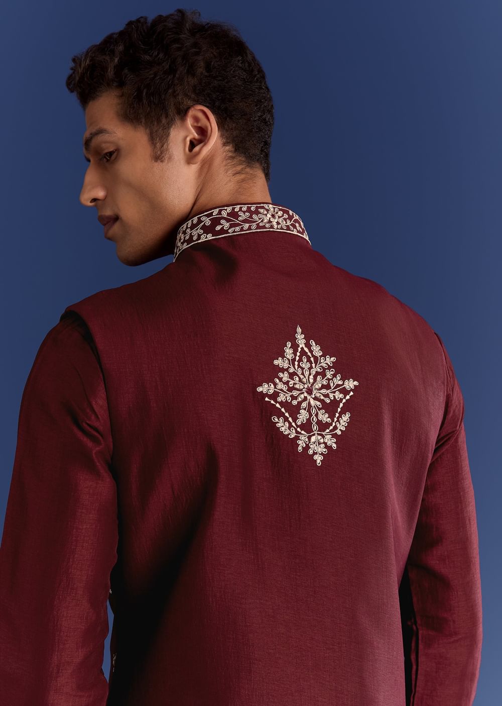 Radiating confidence, this red silk kurta and jacket set is embroidered with tonal thread work for a rich and regal impact. Ideal for vibrant celebrations. Awarded as the Most Trusted Brand, we're delivering styles you love, just as promised.