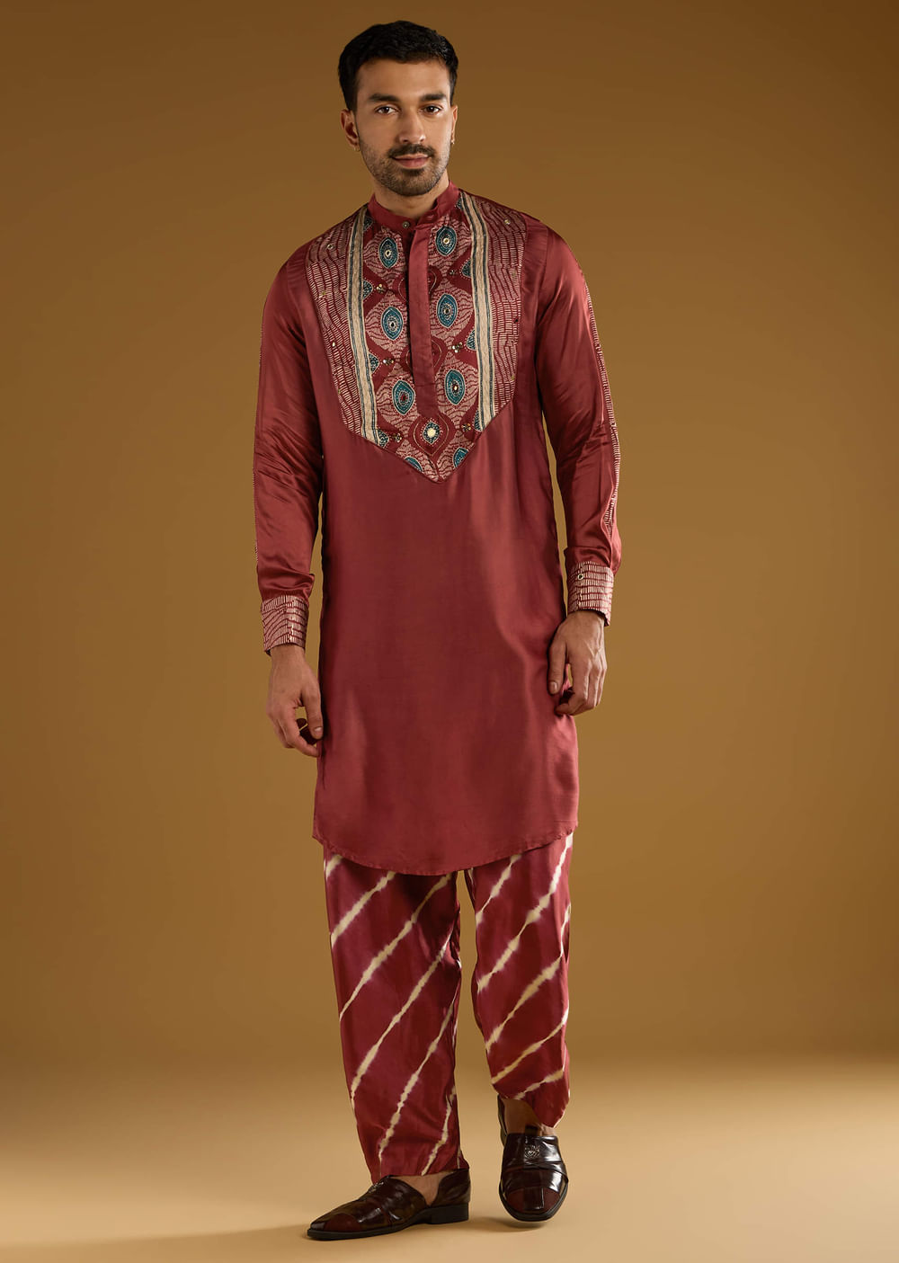 Colour and craft align as this red silk men’s kurta set teams a handmade ajrakh print kurta with leheriya print pants for movement and depth. The pairing photographs beautifully from... More Product Details