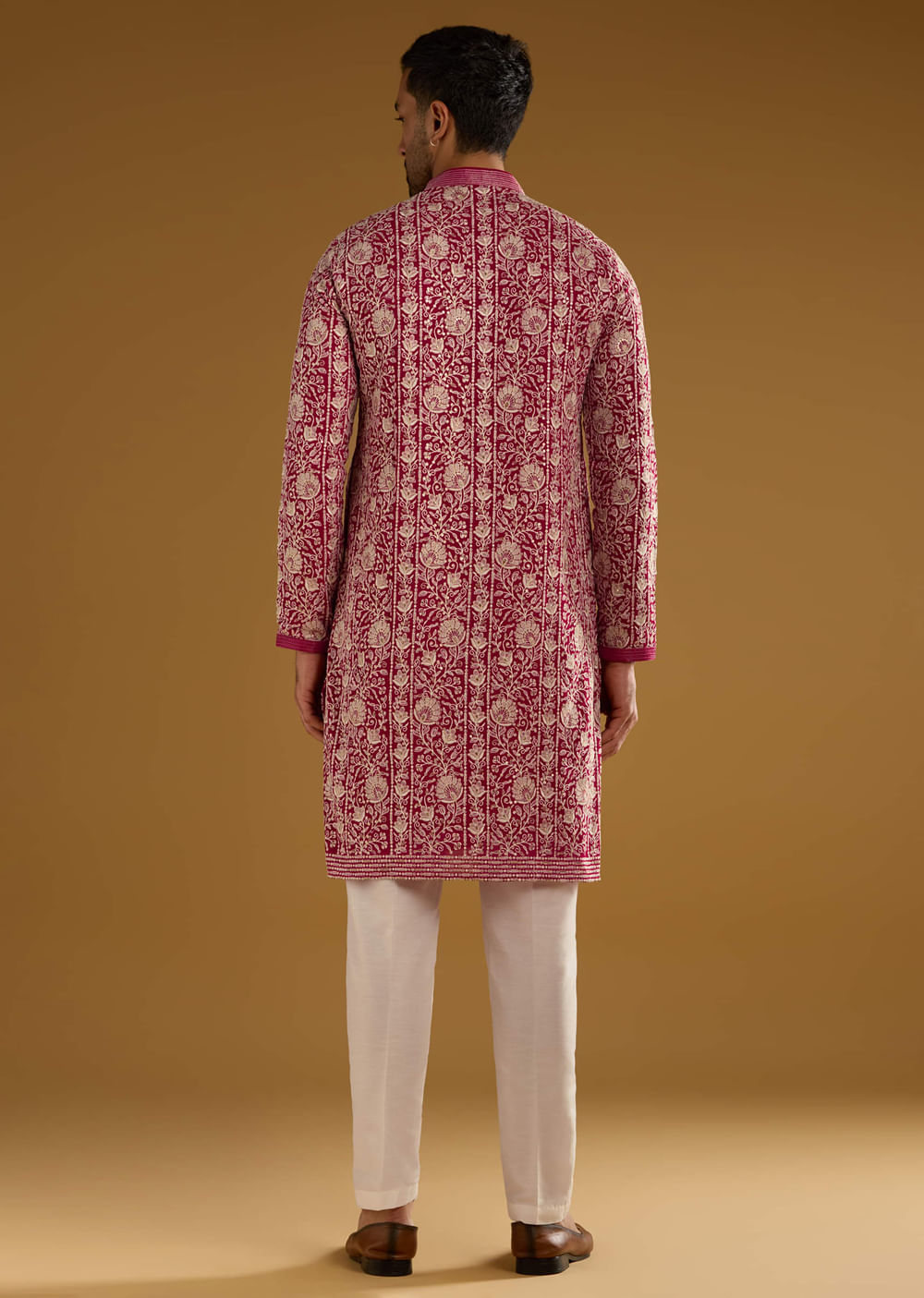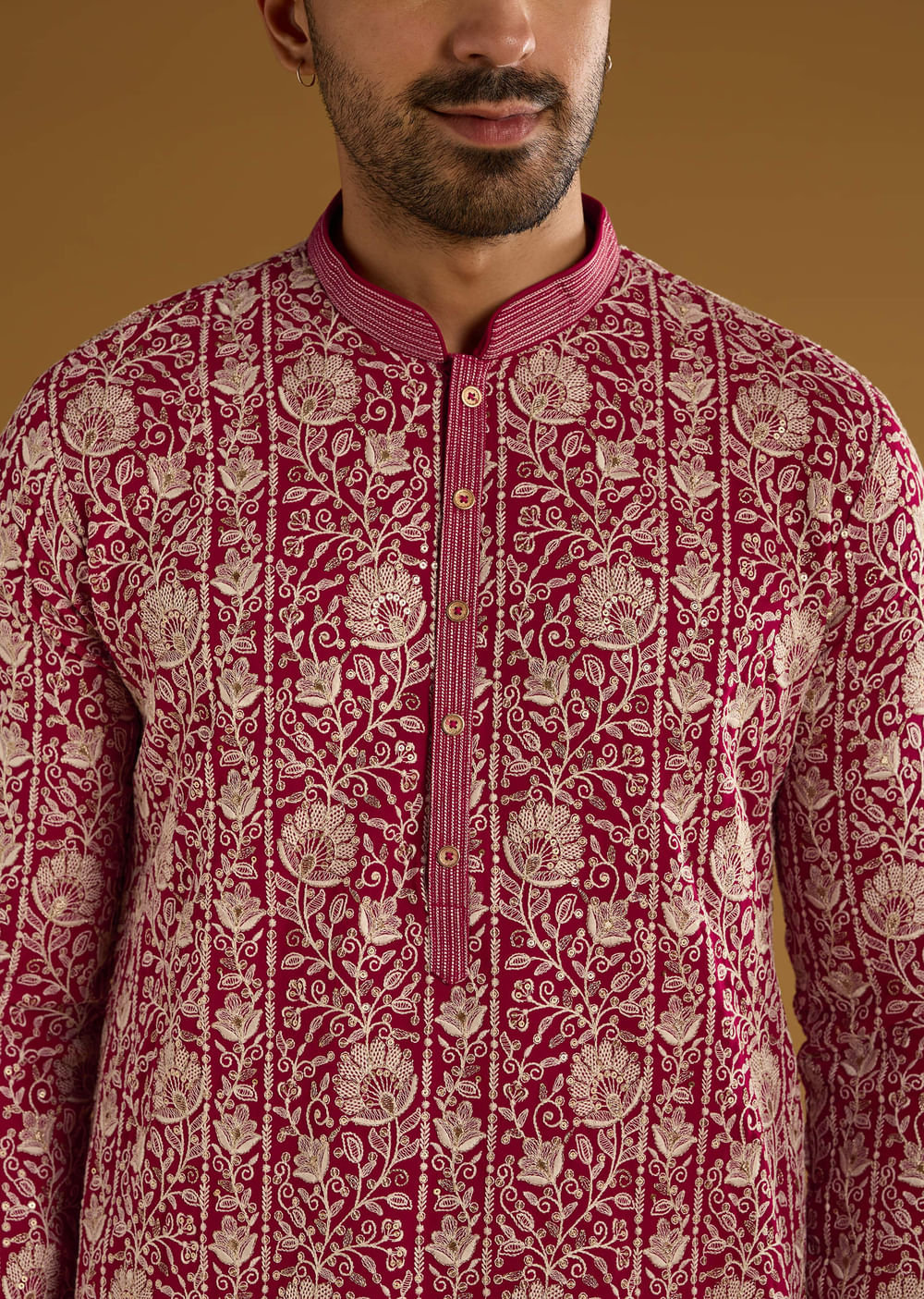 Traditional with clarity, this red men’s kurta set in art silk uses resham stitches to outline the placket and collar for tidy definition. The tone photographs vivid without overpowering. You... More Product Details