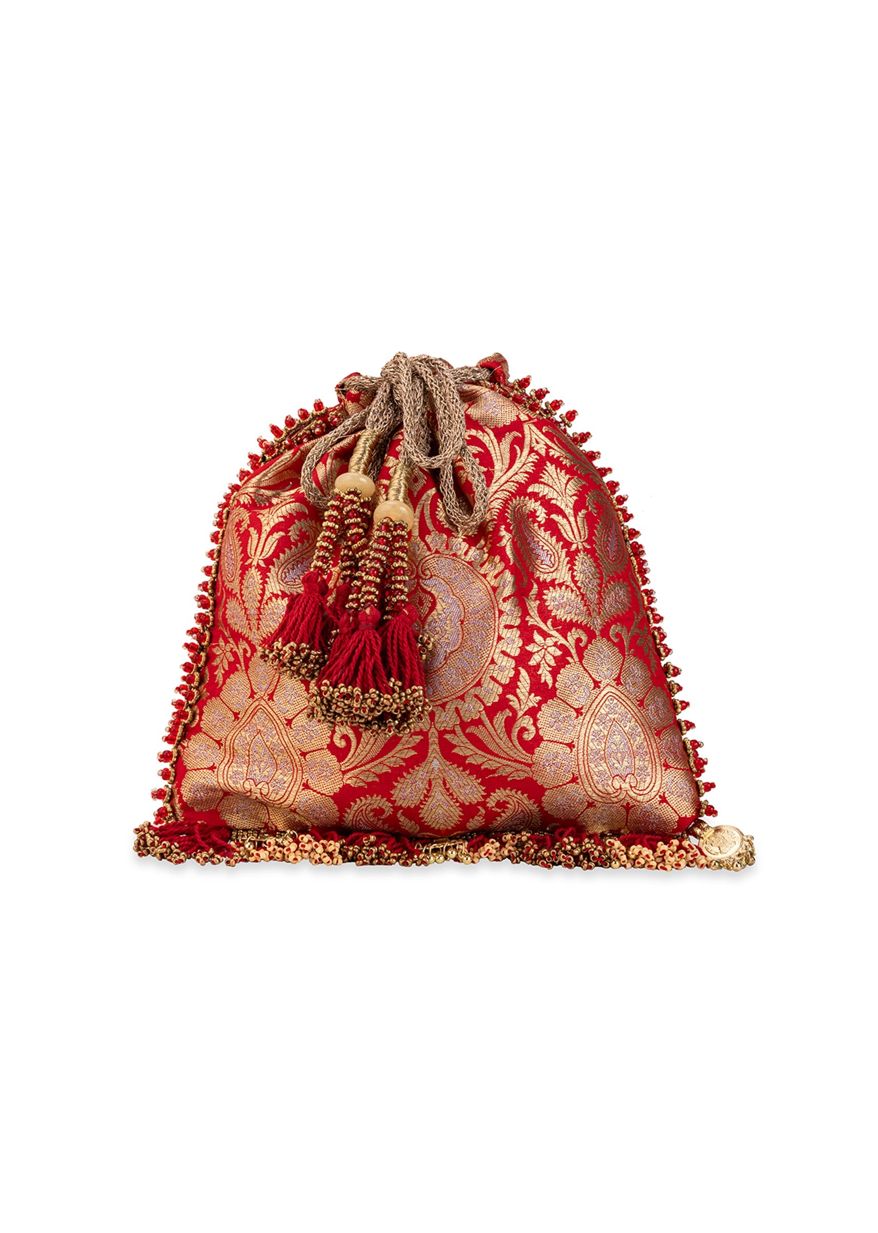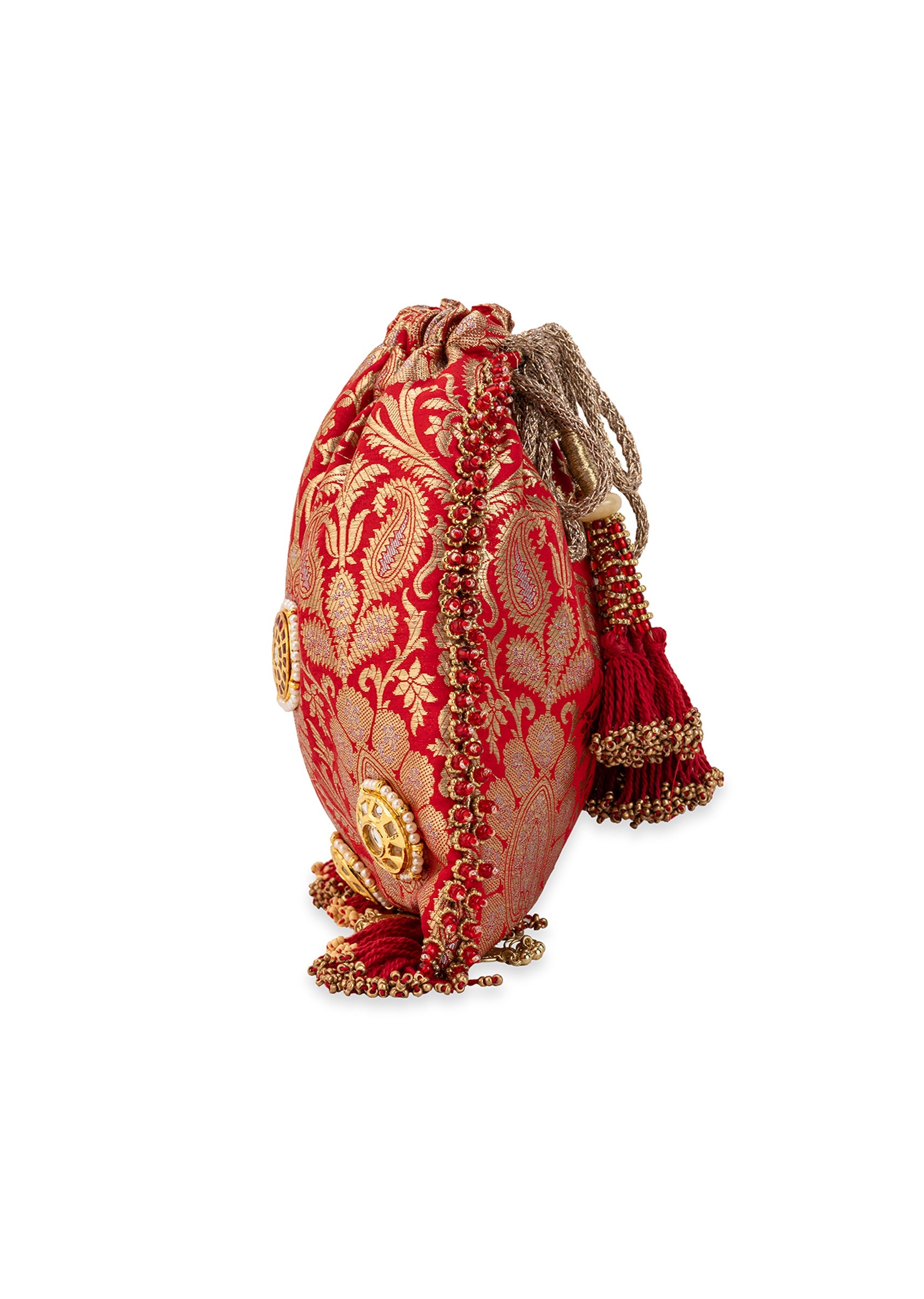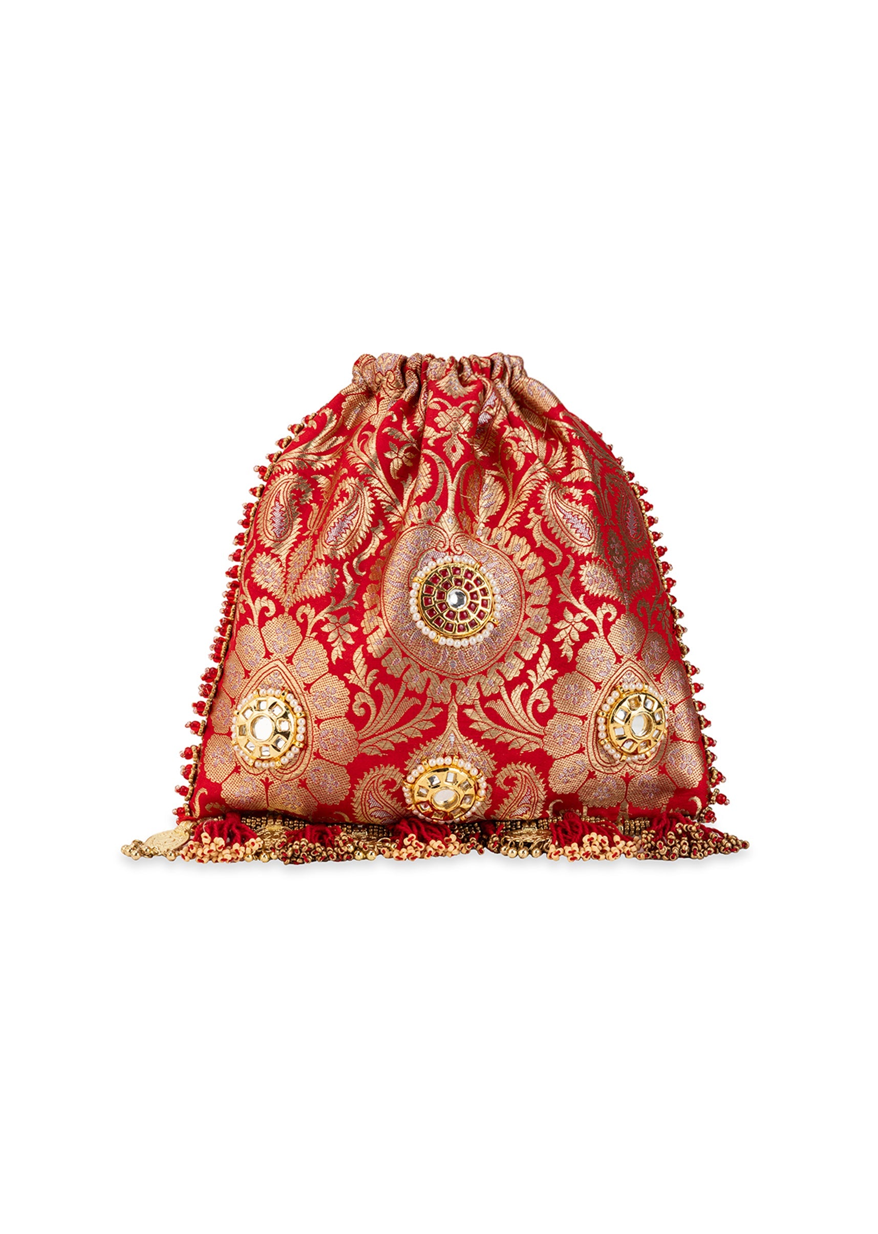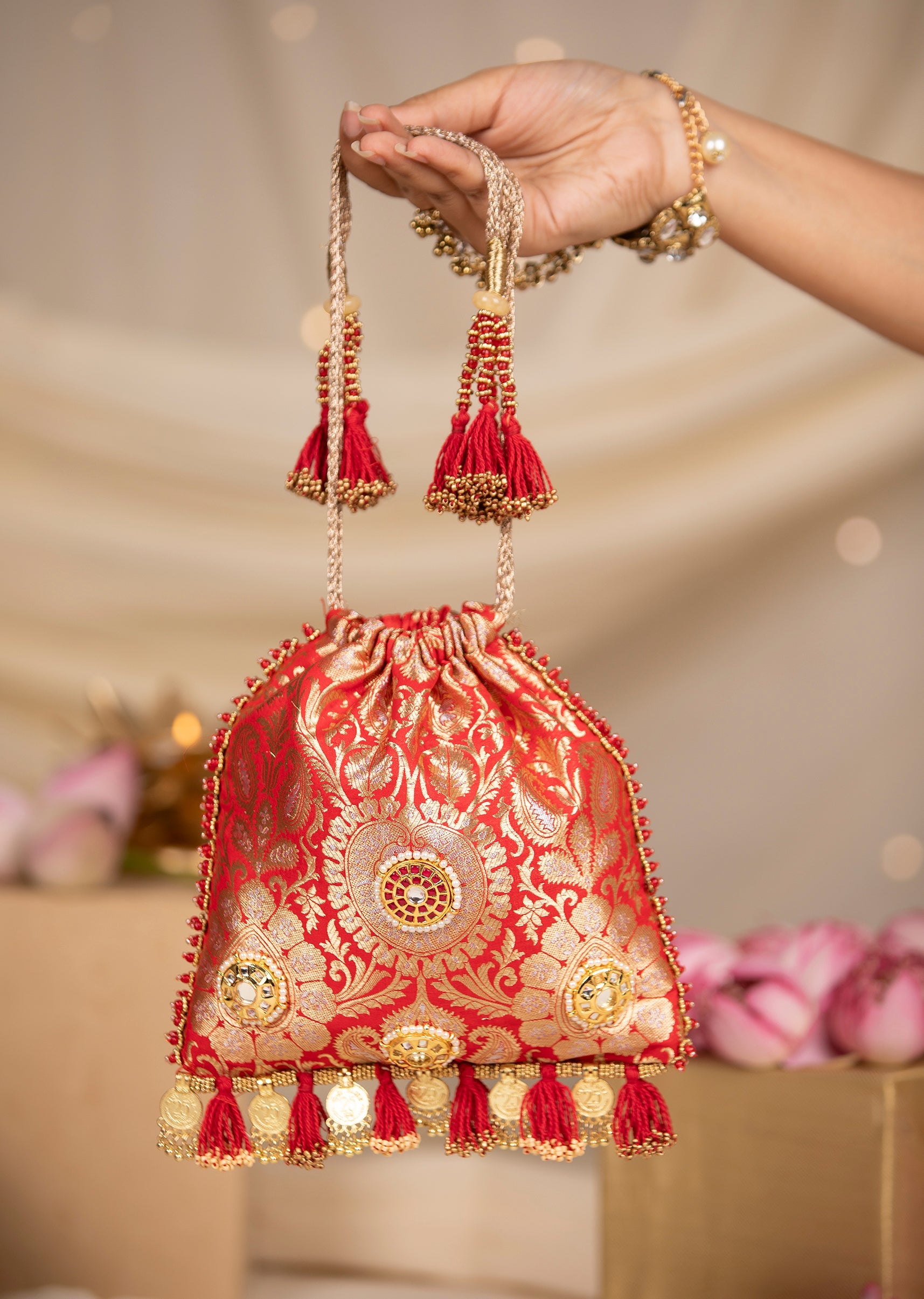 Add a bold festive flair to your ensemble with this red silk potli bag, adorned with mirror embellishments, intricate thread embroidery, and gleaming gold-toned tassels. Its rich colour and ornate detailing make it a standout choice for weddings, sangeets, and grand celebrations. Awarded as the Most Trusted Brand, we're delivering styles you love, just as promised.