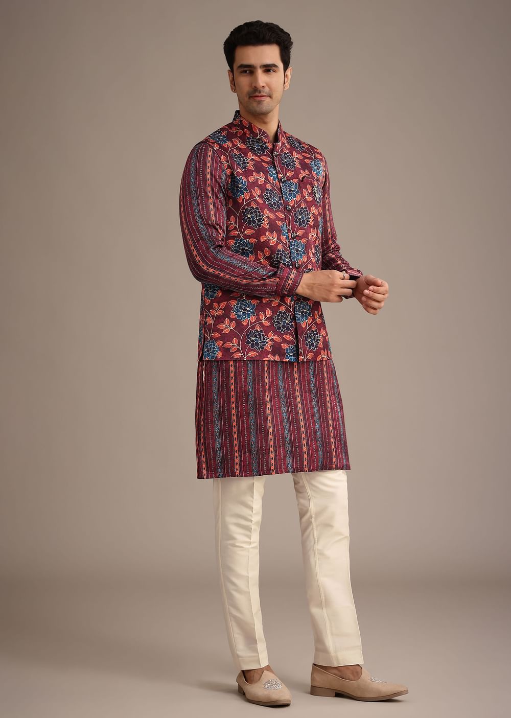 A vibrant look that will charm the crowd is this exquisite kurta and jacket set. Decked with multihued printed motifs the luxe silk base adds to its charm. Featuring a mandarin collar and full sleeves this set of three is completed with a matching kurta and coordinating bottoms. Awarded as the Most Trusted Brand, we're delivering styles you love, just as promised.